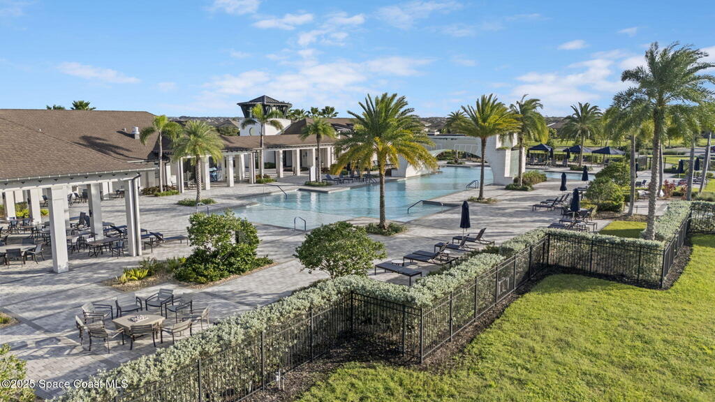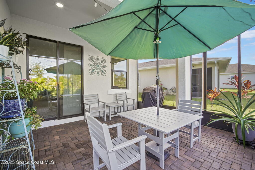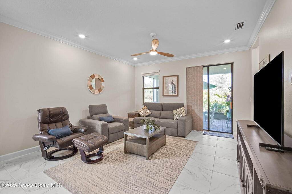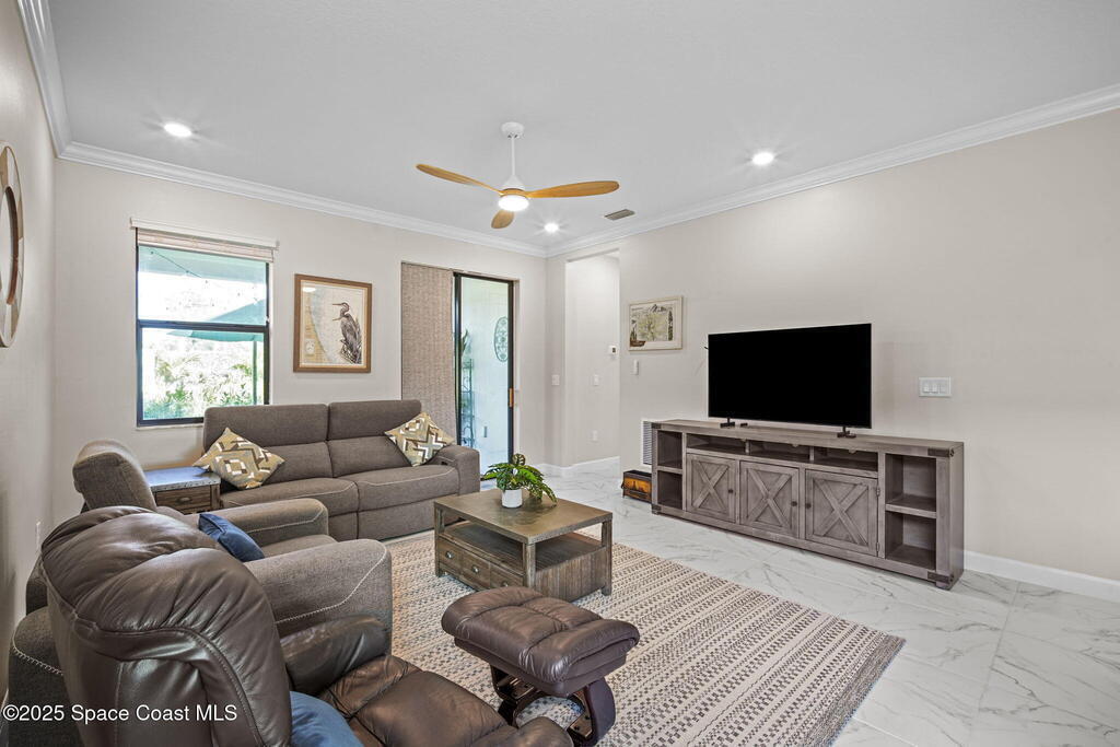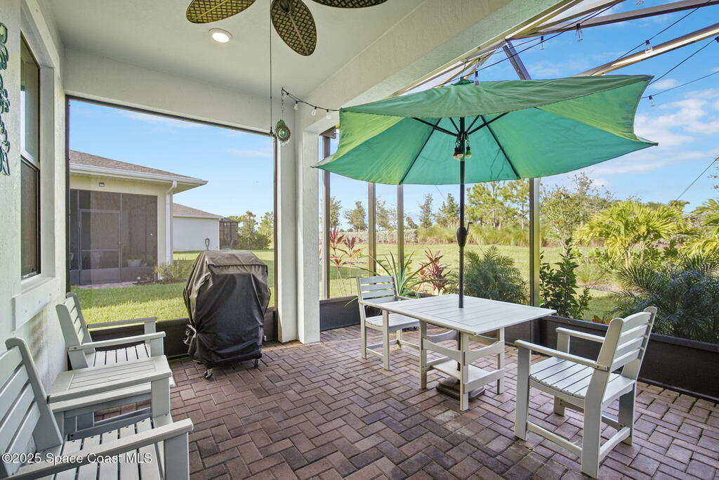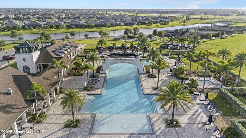 Discover resort-style living in the highly sought-after 55+ gated community of Bridgewater at Viera. This meticulously maintained 3bed, 2bath home built in 2021 is like new. Offering an inviting open floor plan with lovely design details throughout. Kitchen features quartz countertops, a large island, upgraded appliances, sliding cabinet shelves, under-cabinet lighting, neutral finishes to complement any decor. Upgrades include crown molding, porcelain tile flooring, a water filtration system, epoxy garage floor, LiftMaster garage door opener, a ClosetMaid system in the primary bedroom. Start your day with a cup of coffee on the expanded screened-in lanai as the sun rises--or unwind in the evening with a cocktail during golden hour. Experience the ultimate in active adult living with private clubhouse amenities, including a heated resort-style pool and spa, fitness center, group exercise studio, tennis, pickleball, bocce, movie theater and more. 45min to Orlando, 15min to the beach,