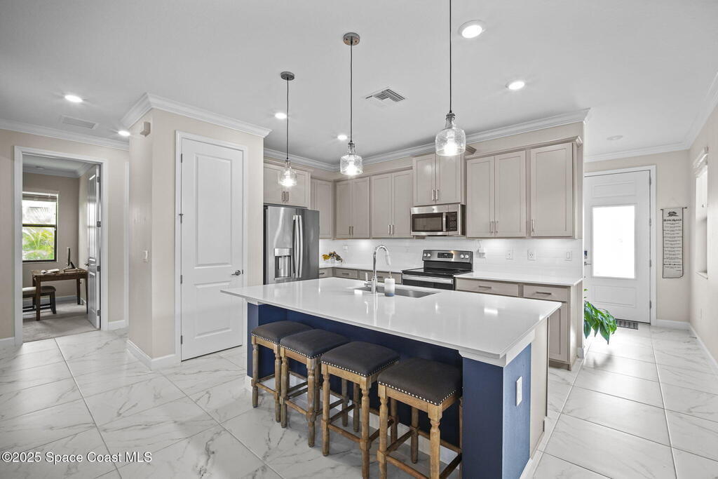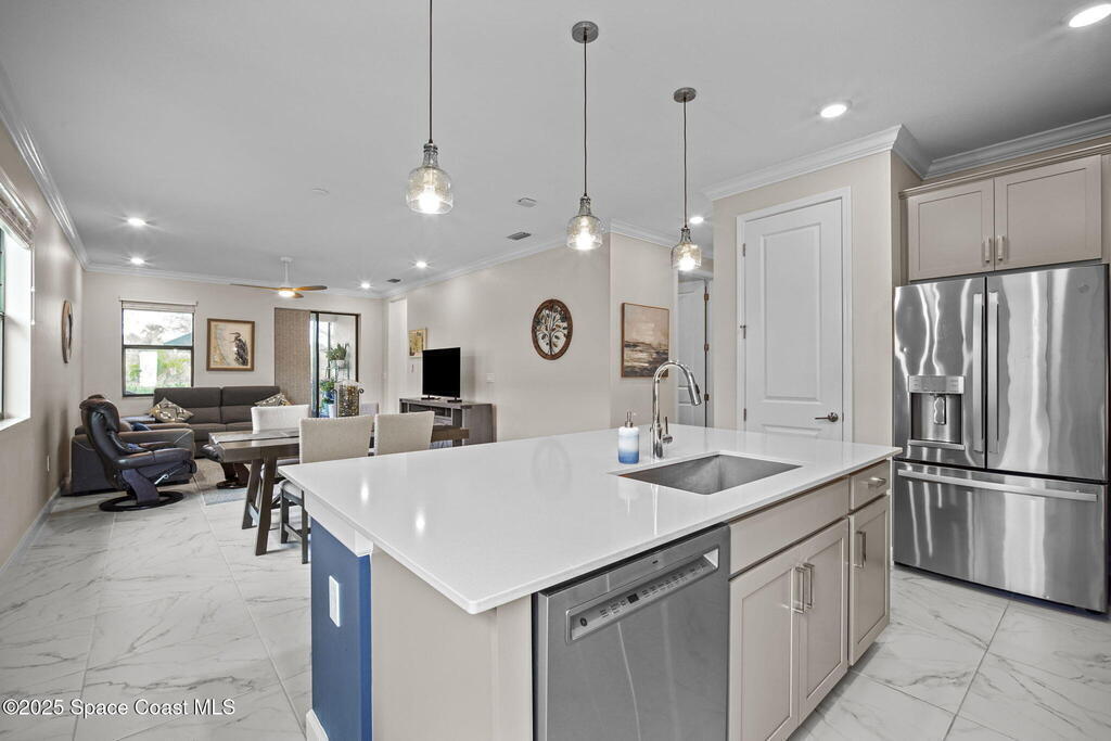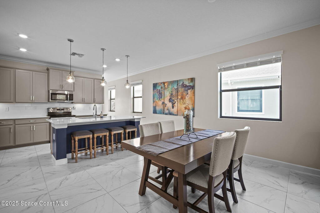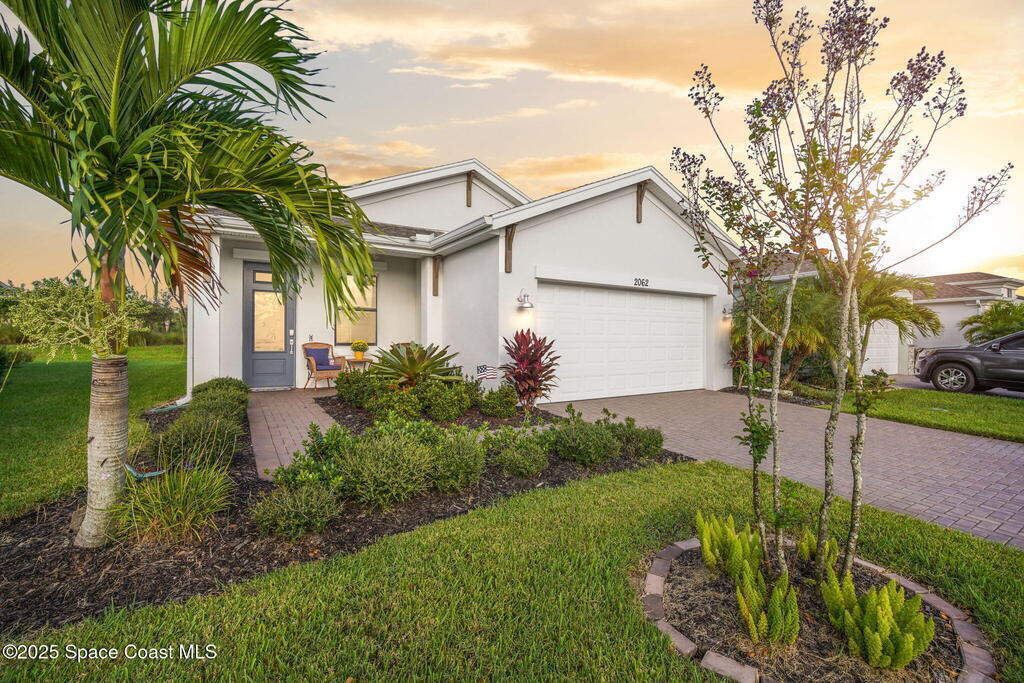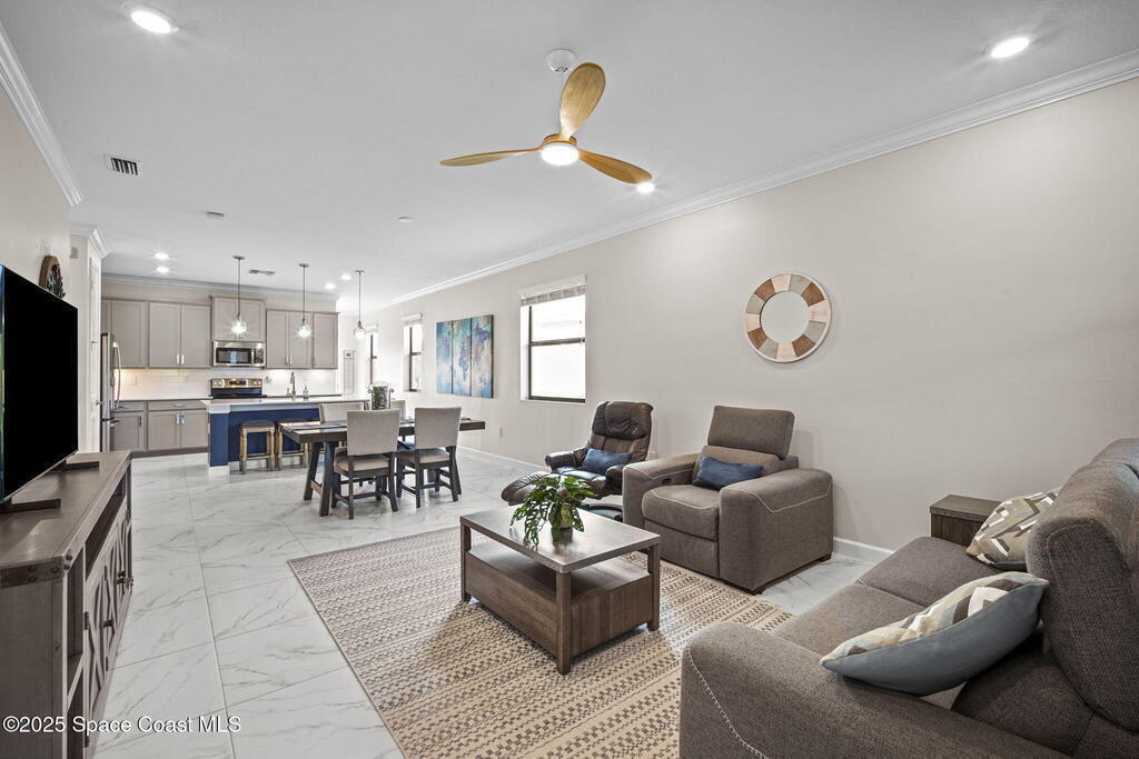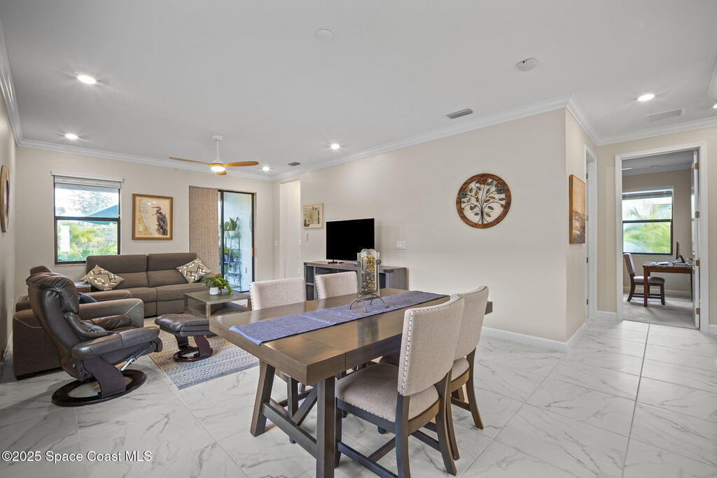 Discover resort-style living in the highly sought-after 55+ gated community of Bridgewater at Viera. This meticulously maintained 3bed, 2bath home built in 2021 is like new. Offering an inviting open floor plan with lovely design details throughout. Kitchen features quartz countertops, a large island, upgraded appliances, sliding cabinet shelves, under-cabinet lighting, neutral finishes to complement any decor. Upgrades include crown molding, porcelain tile flooring, a water filtration system, epoxy garage floor, LiftMaster garage door opener, a ClosetMaid system in the primary bedroom. Start your day with a cup of coffee on the expanded screened-in lanai as the sun rises--or unwind in the evening with a cocktail during golden hour. Experience the ultimate in active adult living with private clubhouse amenities, including a heated resort-style pool and spa, fitness center, group exercise studio, tennis, pickleball, bocce, movie theater and more. 45min to Orlando, 15min to the beach,