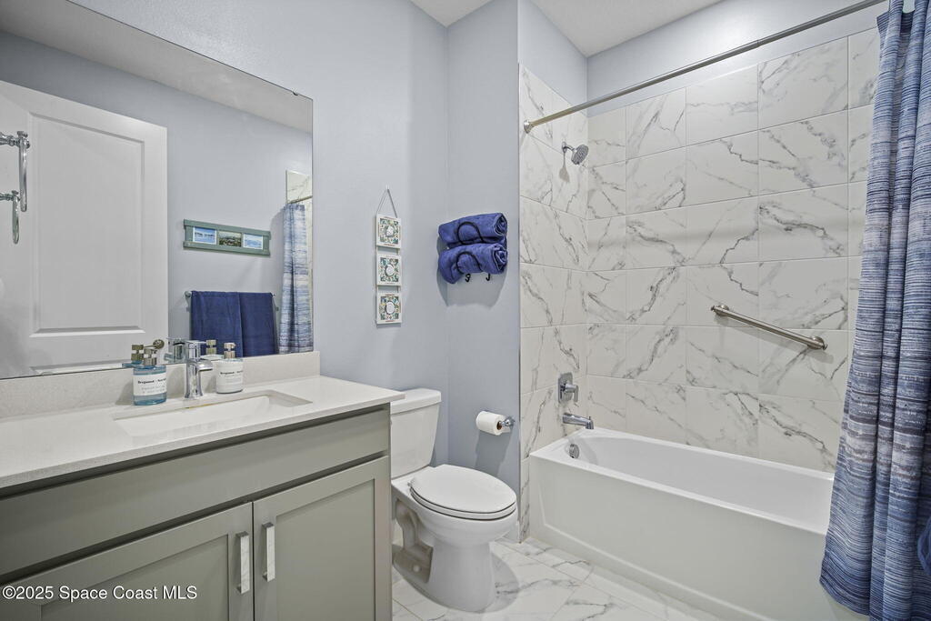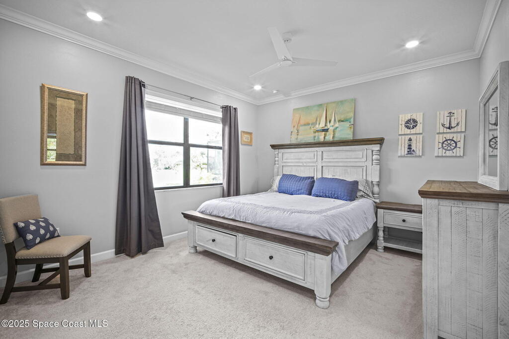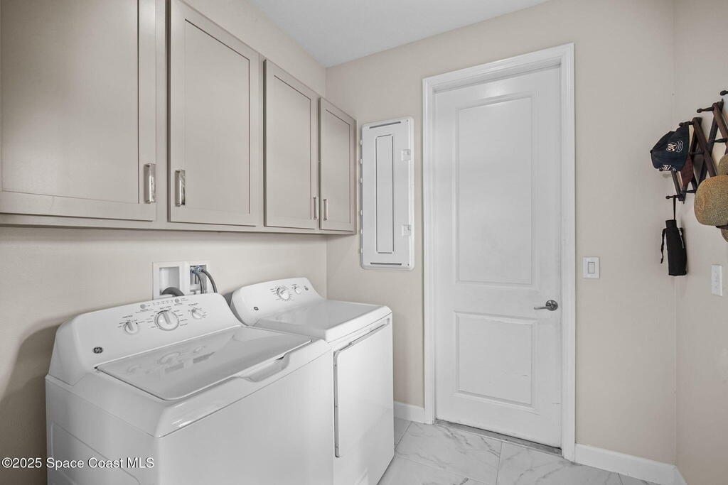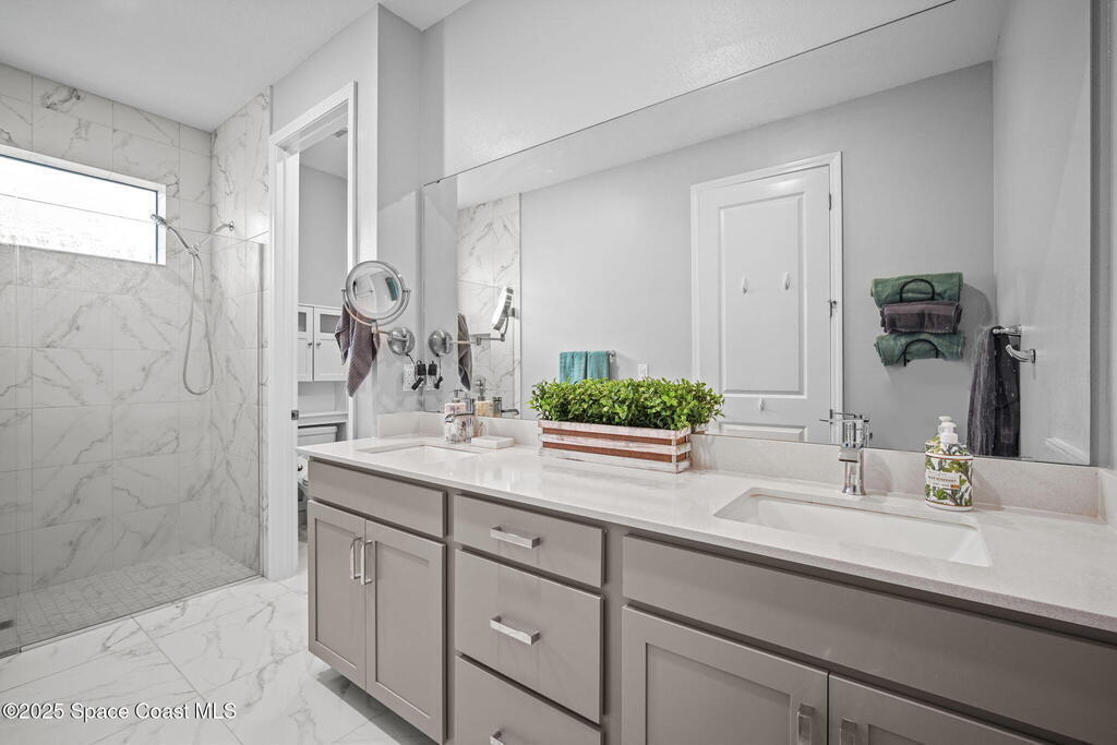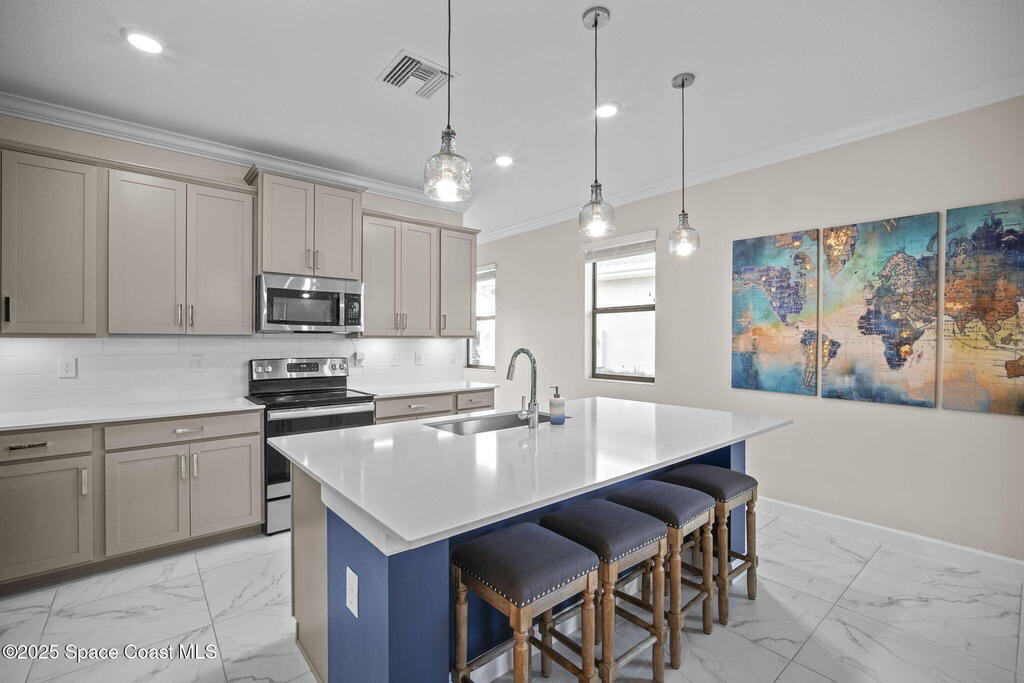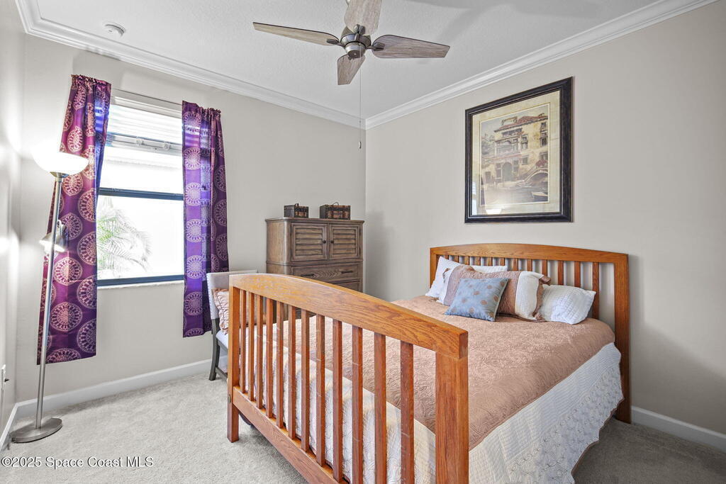 Discover resort-style living in the highly sought-after 55+ gated community of Bridgewater at Viera. This meticulously maintained 3bed, 2bath home built in 2021 is like new. Offering an inviting open floor plan with lovely design details throughout. Kitchen features quartz countertops, a large island, upgraded appliances, sliding cabinet shelves, under-cabinet lighting, neutral finishes to complement any decor. Upgrades include crown molding, porcelain tile flooring, a water filtration system, epoxy garage floor, LiftMaster garage door opener, a ClosetMaid system in the primary bedroom. Start your day with a cup of coffee on the expanded screened-in lanai as the sun rises--or unwind in the evening with a cocktail during golden hour. Experience the ultimate in active adult living with private clubhouse amenities, including a heated resort-style pool and spa, fitness center, group exercise studio, tennis, pickleball, bocce, movie theater and more. 45min to Orlando, 15min to the beach,