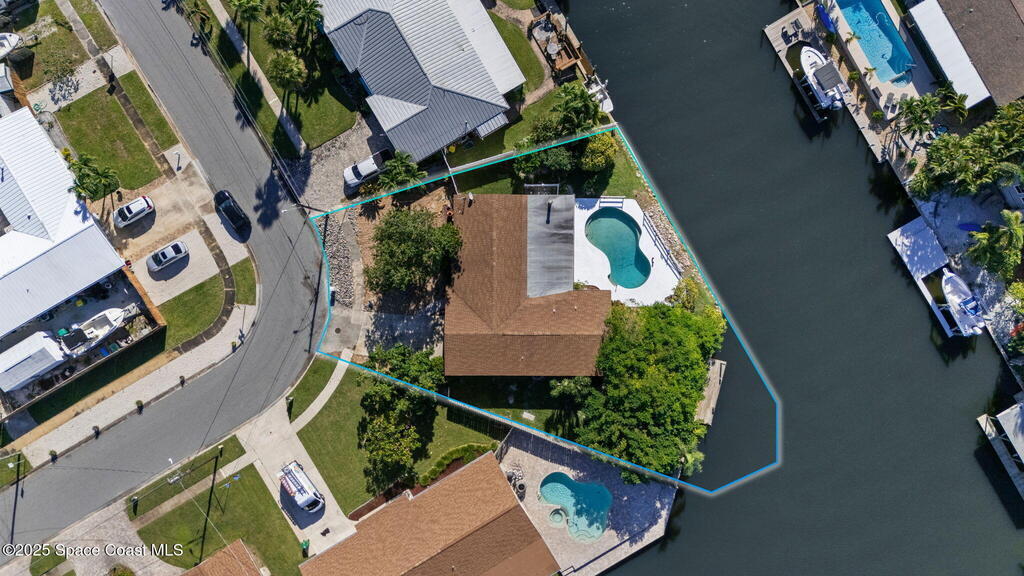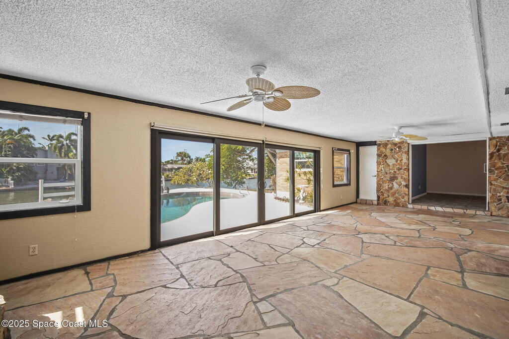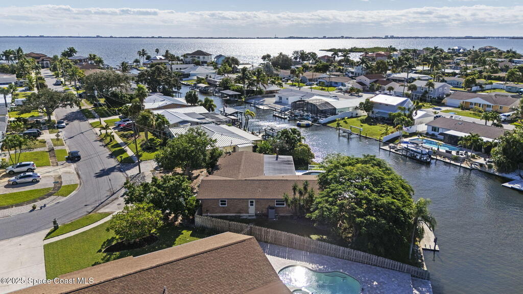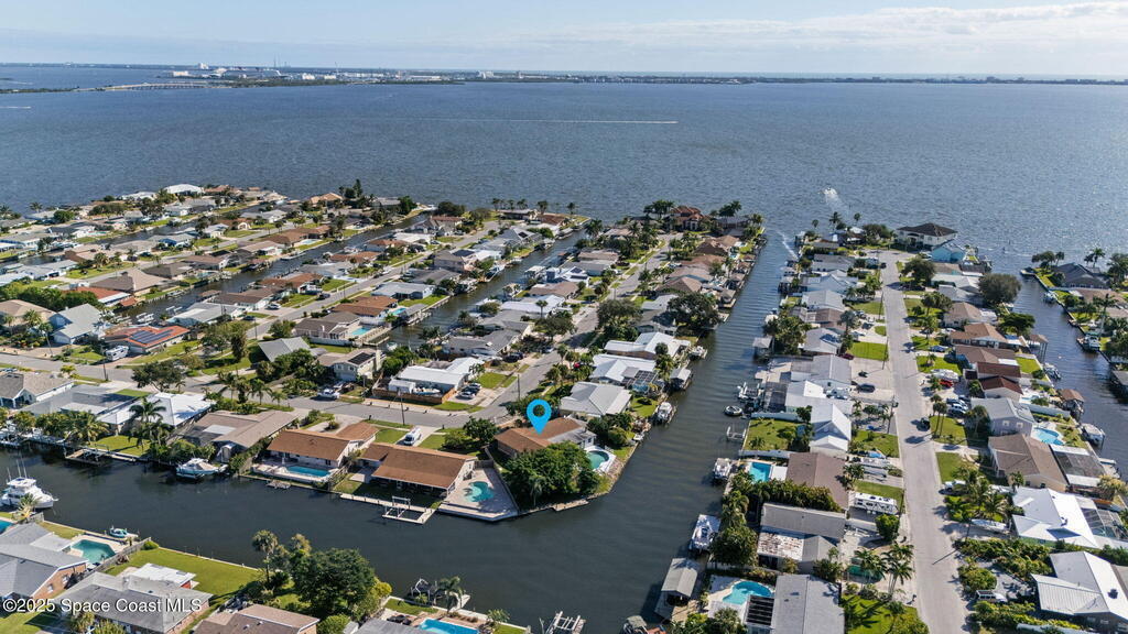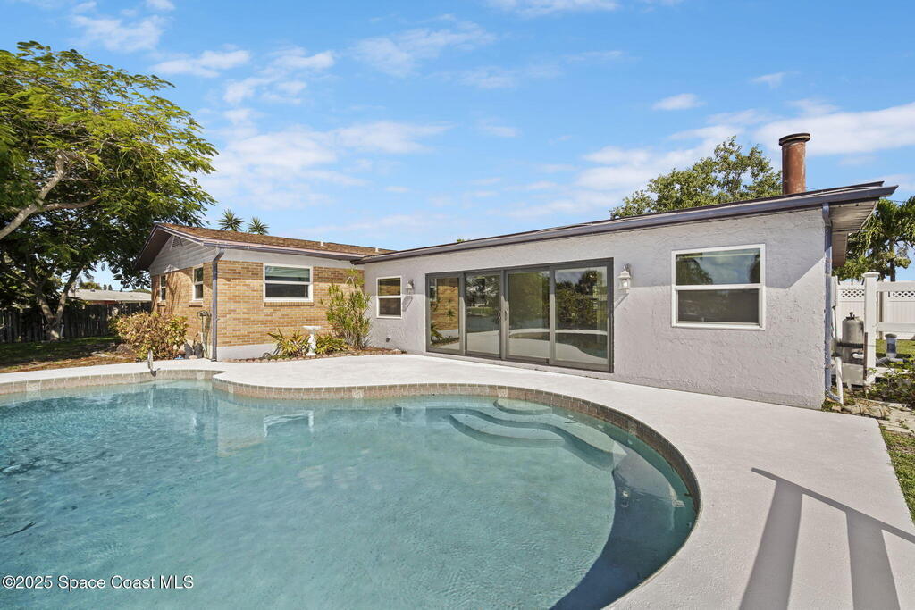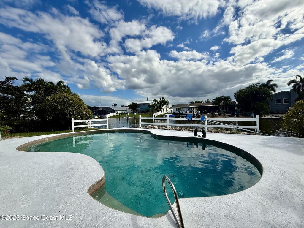 This waterfront pool home on Merritt Island boasts approximately 176 feet of frontage along a navigable deep-water canal featuring a spacious turnaround basin suitable for large vessels. With direct access to the Banana River and ocean via Port Canaveral, the property offers exceptional boating opportunities. The residence includes a four-bedroom split plan with two bathrooms, an inground pool, and all-tile flooring throughout. The bathrooms have been renovated, and the flat roof was replaced in 2016, main roof was 2004 with the HVAC system updated in 2017. Hurricane impact windows were installed in 2022, enhancing safety and energy efficiency. The open layout encompasses a kitchen, living room, family room, and a 35x13 Florida room complete with a fireplace, which provides access to a bathroom and features large sliding doors leading to the pool and waterfront. The expansive lot is surrounded by a privacy fence, mature landscaping and shade trees,
