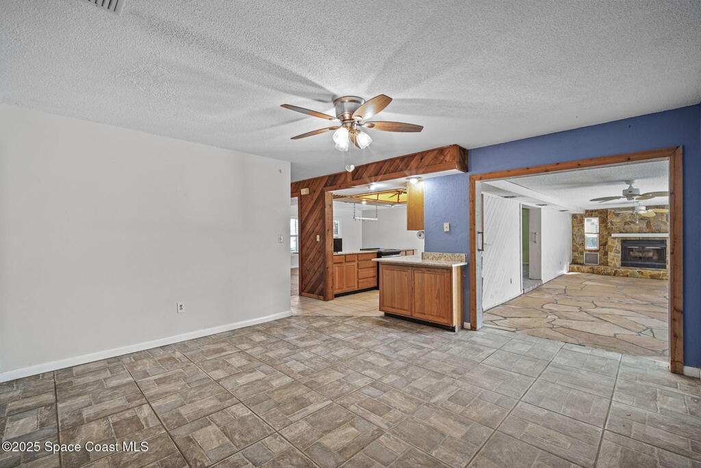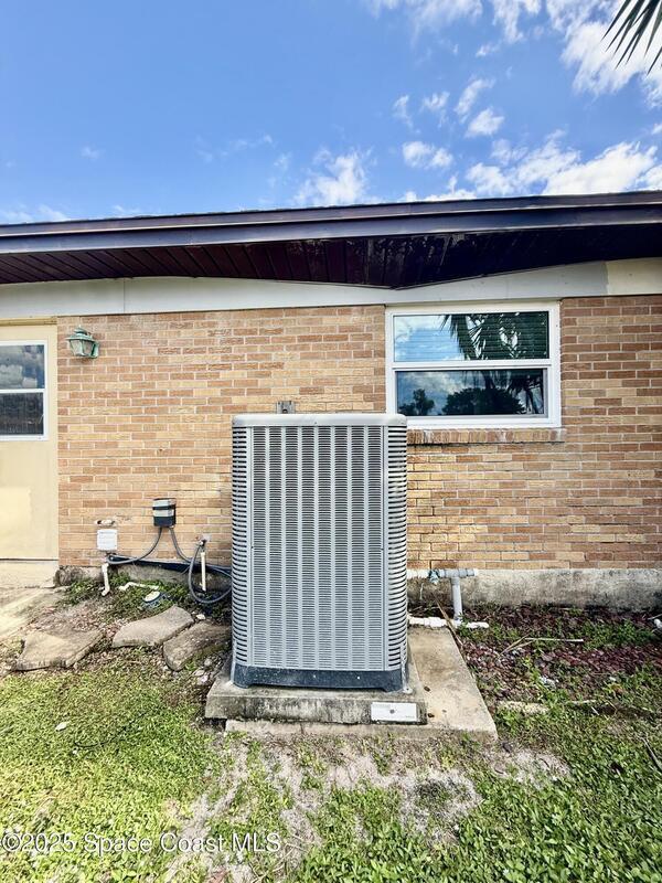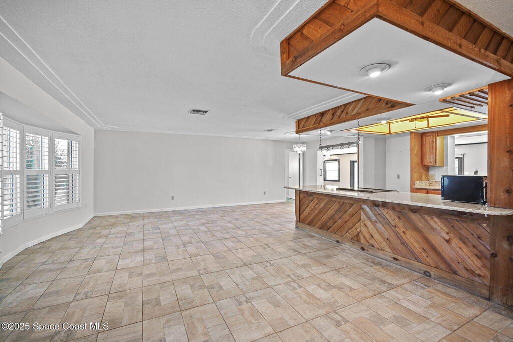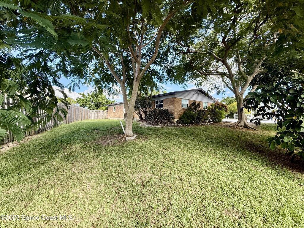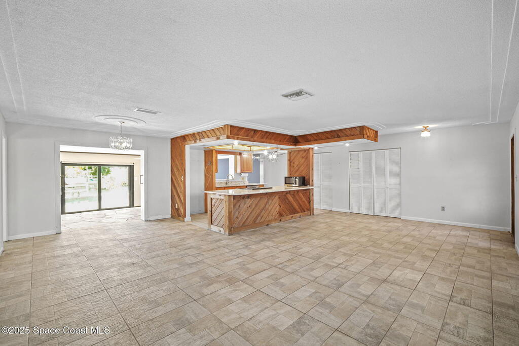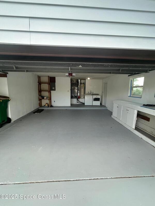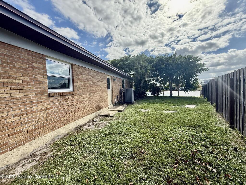 This waterfront pool home on Merritt Island boasts approximately 176 feet of frontage along a navigable deep-water canal featuring a spacious turnaround basin suitable for large vessels. With direct access to the Banana River and ocean via Port Canaveral, the property offers exceptional boating opportunities. The residence includes a four-bedroom split plan with two bathrooms, an inground pool, and all-tile flooring throughout. The bathrooms have been renovated, and the flat roof was replaced in 2016, main roof was 2004 with the HVAC system updated in 2017. Hurricane impact windows were installed in 2022, enhancing safety and energy efficiency. The open layout encompasses a kitchen, living room, family room, and a 35x13 Florida room complete with a fireplace, which provides access to a bathroom and features large sliding doors leading to the pool and waterfront. The expansive lot is surrounded by a privacy fence, mature landscaping and shade trees,