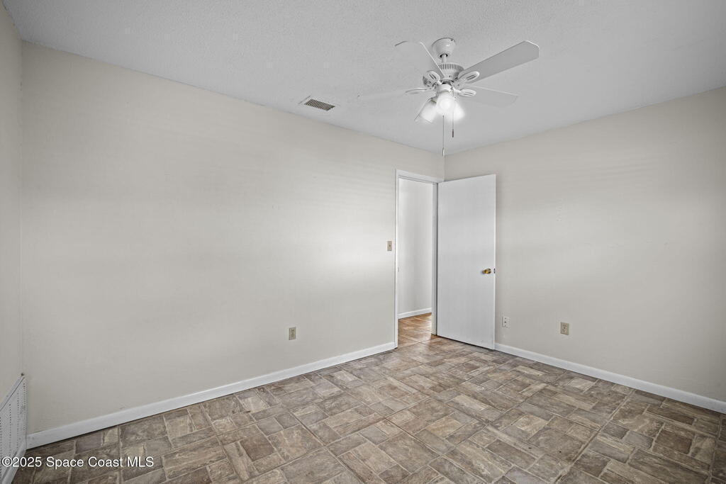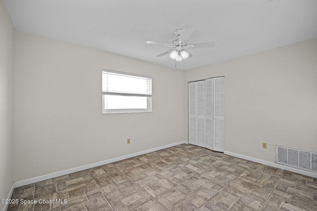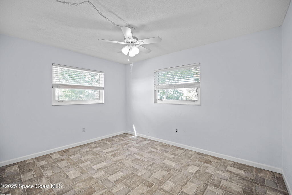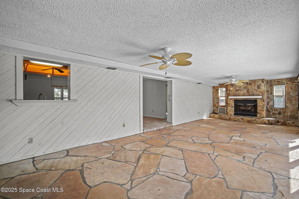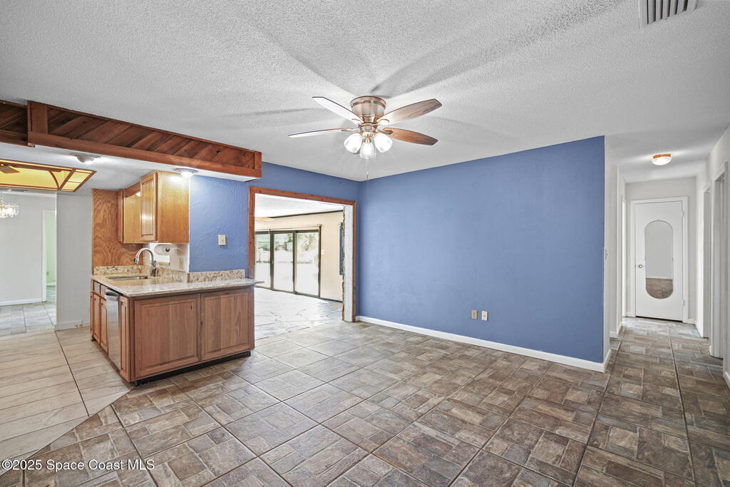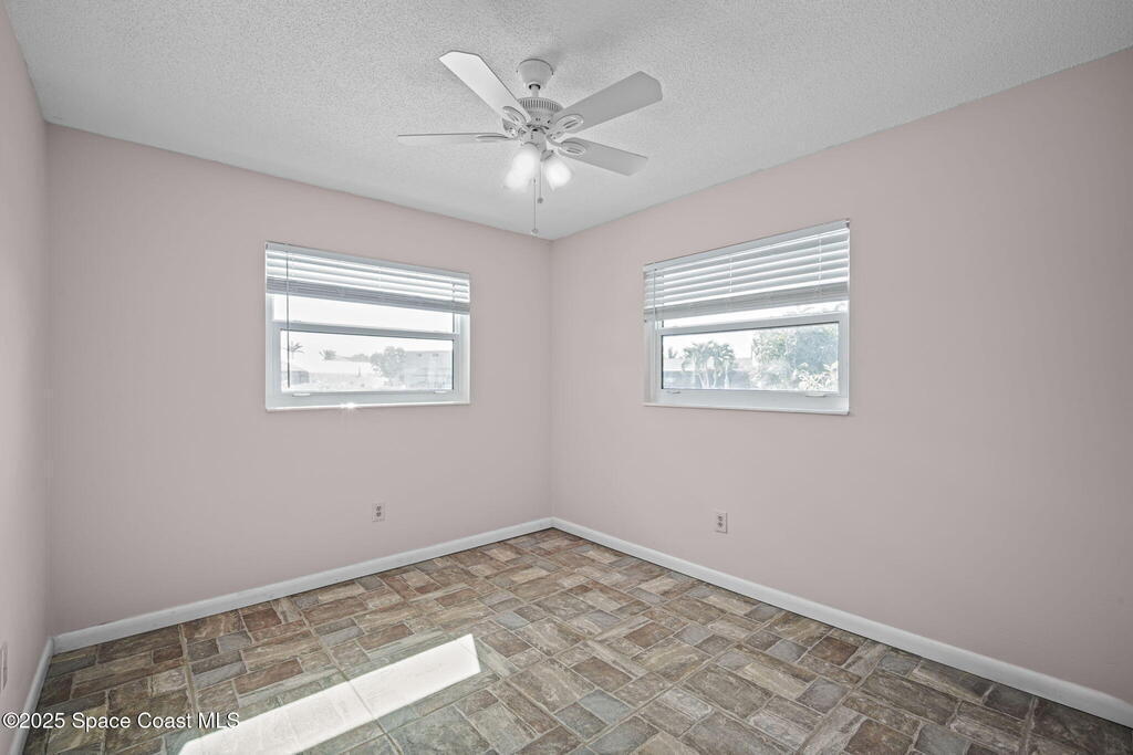 This waterfront pool home on Merritt Island boasts approximately 176 feet of frontage along a navigable deep-water canal featuring a spacious turnaround basin suitable for large vessels. With direct access to the Banana River and ocean via Port Canaveral, the property offers exceptional boating opportunities. The residence includes a four-bedroom split plan with two bathrooms, an inground pool, and all-tile flooring throughout. The bathrooms have been renovated, and the flat roof was replaced in 2016, main roof was 2004 with the HVAC system updated in 2017. Hurricane impact windows were installed in 2022, enhancing safety and energy efficiency. The open layout encompasses a kitchen, living room, family room, and a 35x13 Florida room complete with a fireplace, which provides access to a bathroom and features large sliding doors leading to the pool and waterfront. The expansive lot is surrounded by a privacy fence, mature landscaping and shade trees,