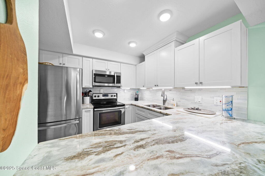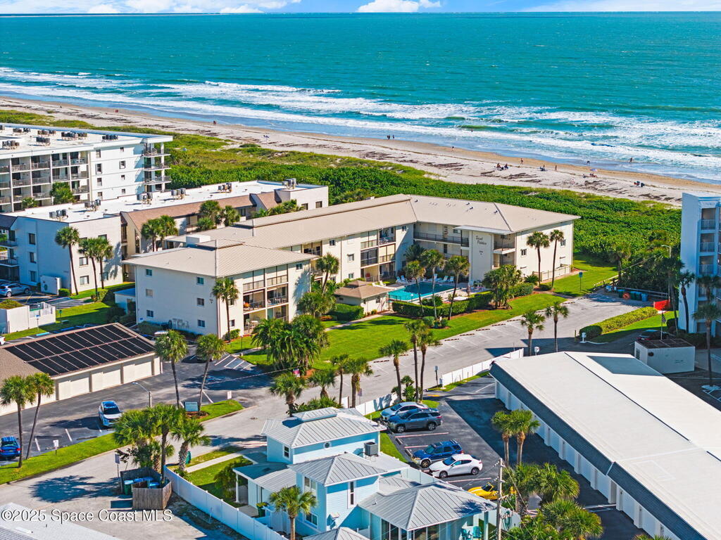 Gorgeous, updated ground-floor condo in the desirable oceanfront Sand Pebbles community! Live like you're on vacation every day in this clean, spacious 2-bed/2-bath condo! Features include; newer tile flooring throughout, a 2021 remodeled, redesigned kitchen with granite counters, tile backsplash, white cabinets, and stainless appliances. Enjoy a BRAND NEW HVAC, newer water heater, and newer metal building roof. The spacious bedrooms include a primary with a huge walk-in closet; both baths updated, one with a tub. Savor coffee or cocktails on your patio, listening to the waves crash, watching rocket launches, or relaxing at the beach or pristine community pool. Monthly rentals allowed in this quiet, well-maintained 30-unit oceanfront complex. Prime location near Cocoa Beach Pier, Port Canaveral, restaurants, and 40 min to OIA/theme parks!