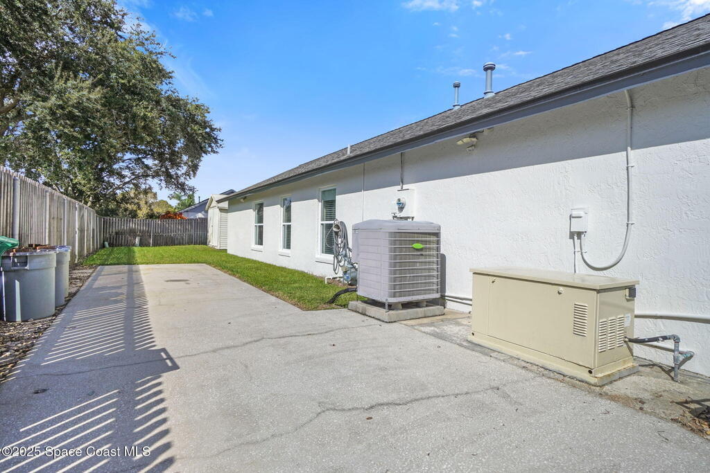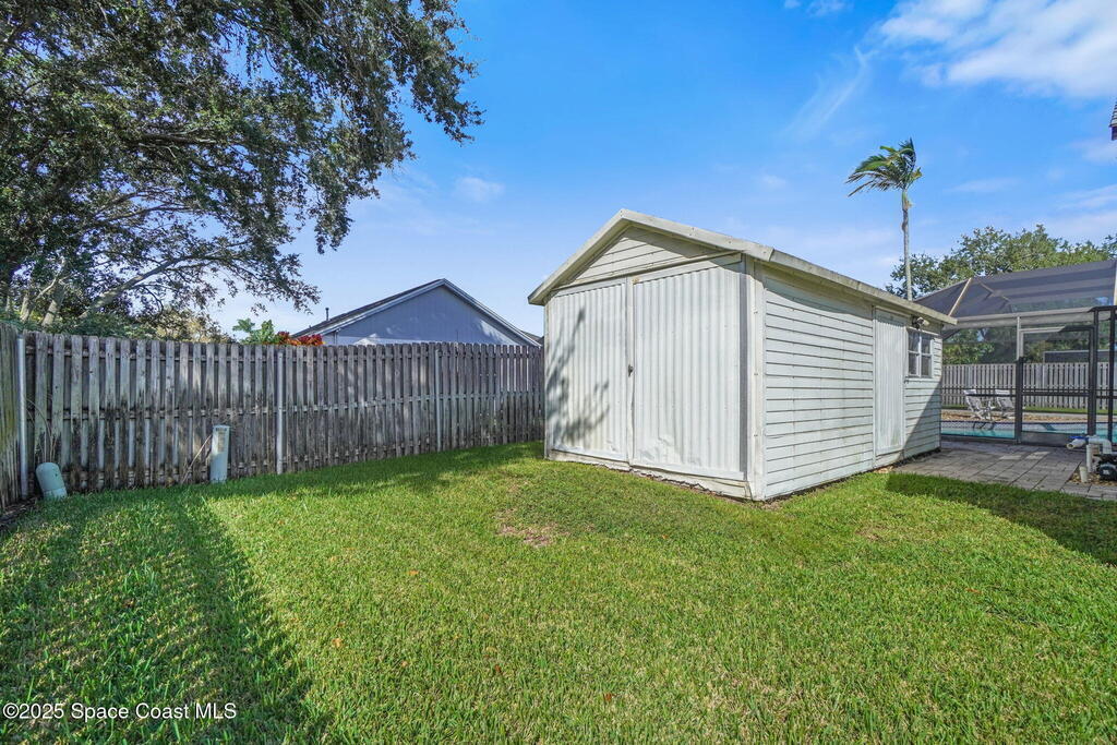 Stylish Melbourne Pool Home with an outdoor Oasis! Beautifully maintained 4-bed, 2-bath home featuring a bright split floor plan and thoughtful upgrades throughout. Enjoy a sparkling screened pool with covered patio, perfect for relaxing or entertaining. A 9x40 concrete slab offers ideal RV or boat parking, while a 10x20 shed adds extra storage for tools or hobbies. The 80-ft well supplies irrigation and pool refills, and the Generac generator provides peace of mind for most items in the home year-round. Inside, find a spacious laundry room with built-ins, open living areas, and a private primary suite. Conveniently located near shopping, dining, and beaches, this Melbourne retreat perfectly blends comfort, function, and the ultimate Florida lifestyle!