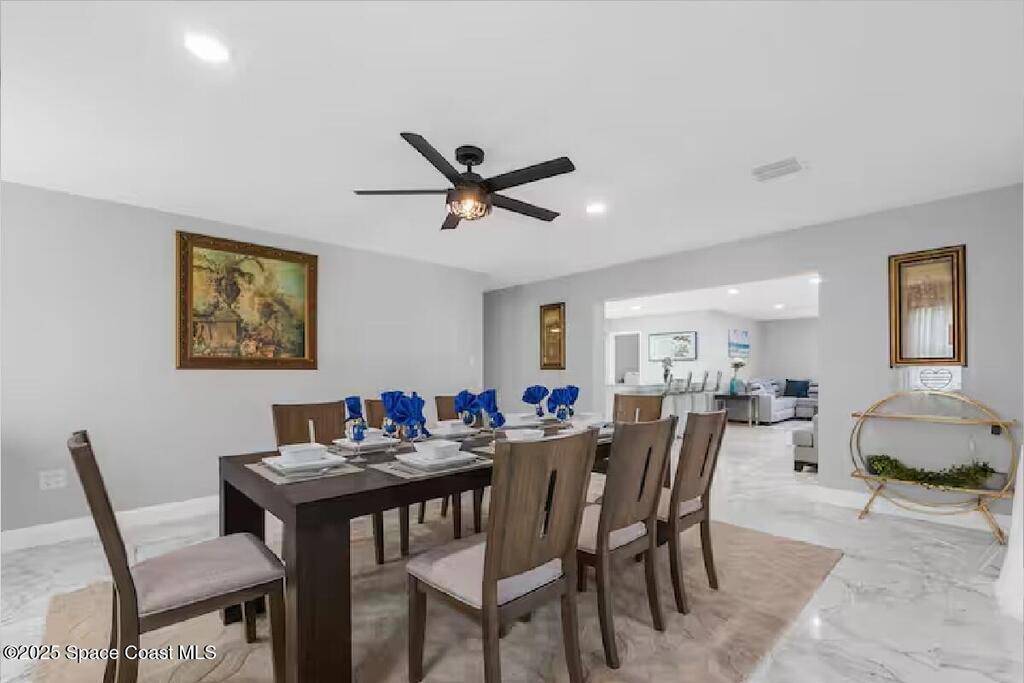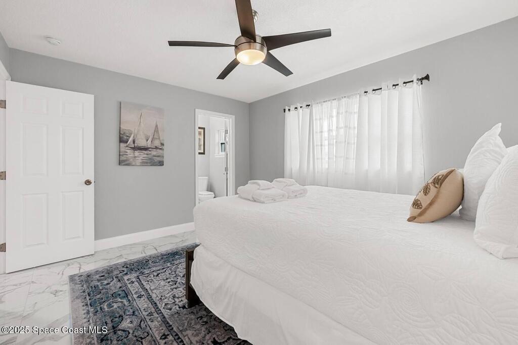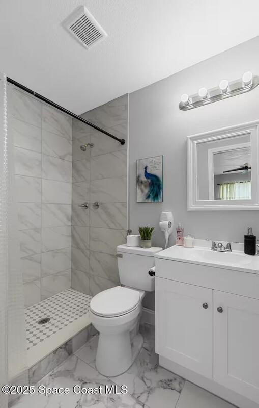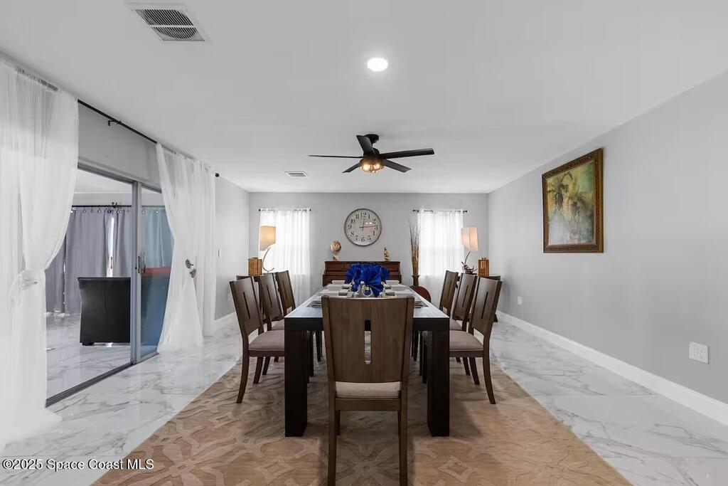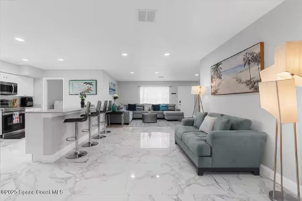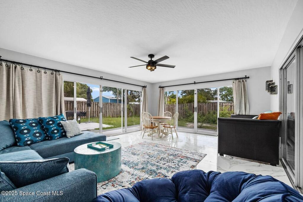 Renovated with modern finishes, this 4-bedroom, 3-bath home offers luxury and comfort with a spacious open floor plan. Built with solid poured concrete construction, this .31-acre property boasts a long driveway and a side-entry garage.Upgrades include a 2022 roof, new windows, stainless-steel appliances, all interiors, a new garage door, and oversized (30x30) floor tiles throughout, Solar panel system. 2 master suites! Enjoy the Florida room with sliding glass doors opening to the huge backyard.Nestled in a quiet neighborhood, yet close to everything! Zoned for short-term rentals and currently operating as an Airbnb. Furniture is optional. Near downtown Melbourne, minutes to FIT, beach, river, restaurants, and the mall.