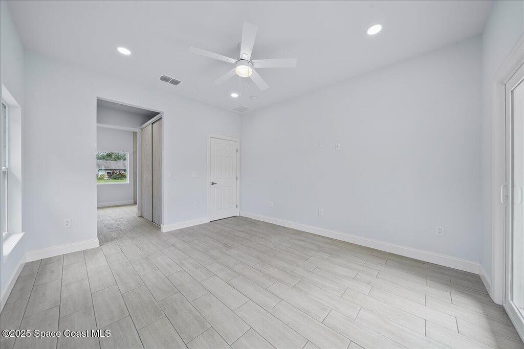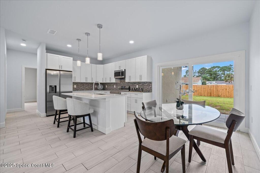 Beautiful new home with stone accents, featuring 4 bedrooms, 2.5 baths, and a 2-car garage on a spacious A1/4-acre lot. Enjoy open-concept living with tile flooring throughout, a modern kitchen with wood soft-close cabinets, quartz countertops, backsplash, stainless steel appliances, and a large island overlooking the living room. The dining area and primary bedroom each have sliding doors leading to a tiled rear lanai and fenced backyard. The primary suite includes his-and-her closets, a dual-sink quartz vanity, and a large walk-in shower. On the opposite side of the home, you'll find three bedrooms and 1.5 baths. Built with hurricane-rated windows and sliders, this home offers peace of mind, comfort, and style. No HOA and just minutes from schools, shopping, and a short drive to Orlando.