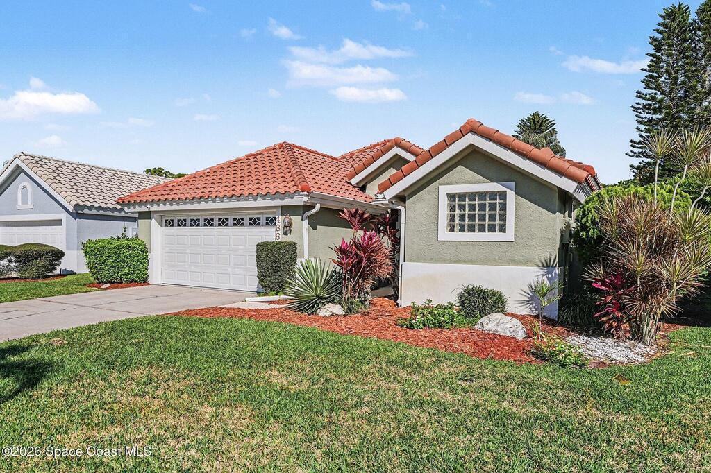 Come & enjoy Mission Lake Villas @ 466 Carmel Dr. One of Suntrees most desirable neighborhoods. Sitting on a serene lake front lot, this block home features 3 bedrooms, 3 full bathrooms, 2 car garage, & courtyard w/ a sparkling heated pool. A unique floor plan, the main home consists of a huge master bedroom & bath along with a generous 2nd bedroom. Across the courtyard is private, the 3rd bedroom, office, or guest suite w/ a full bathroom. Best of all a brand new CLAY TILE ROOF, just completed. A/C 2023, new LVT plank flooring in (2) bedrooms, tile in the rest of the home, NO carpet, fresh new interior paint. New screening in entire pool area. Kitchen has stainless steel appliances w/ granite countertops. Tons of natural light w/ 10 ft ceilings throughout. Extra large laundry room w/ sink. HOA covers exterior painting, roof cleaning, & lawn maintenance.