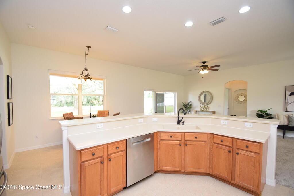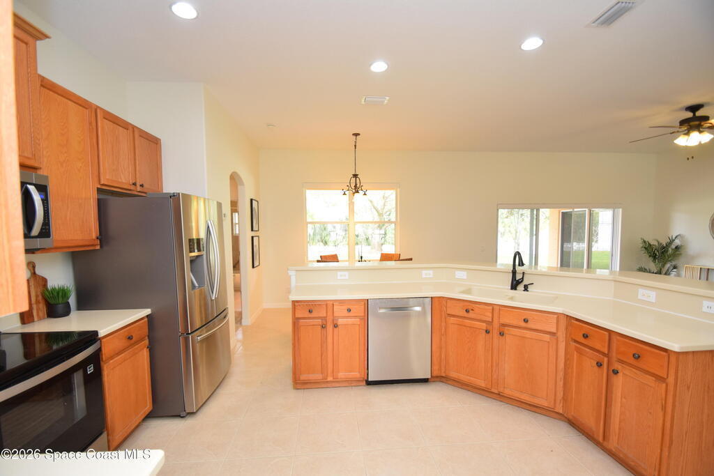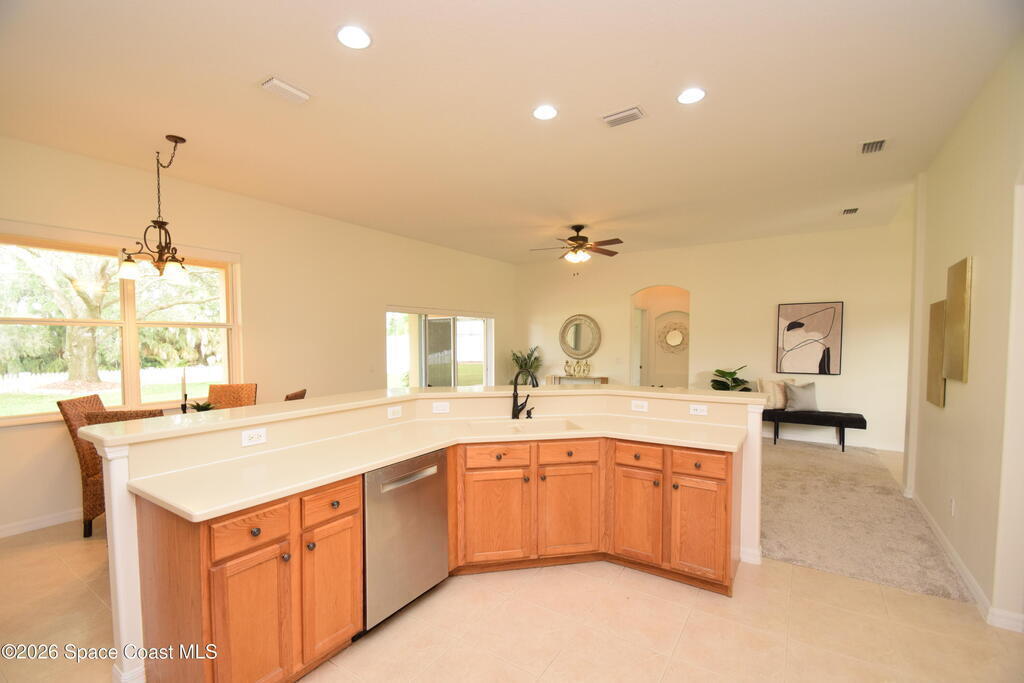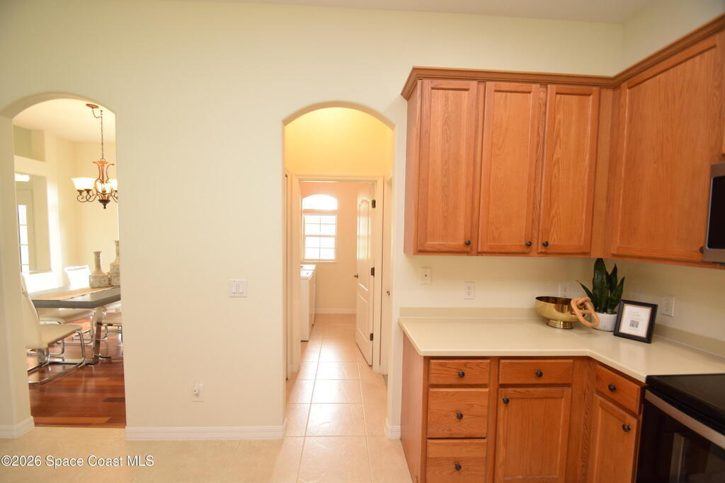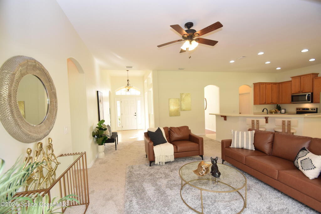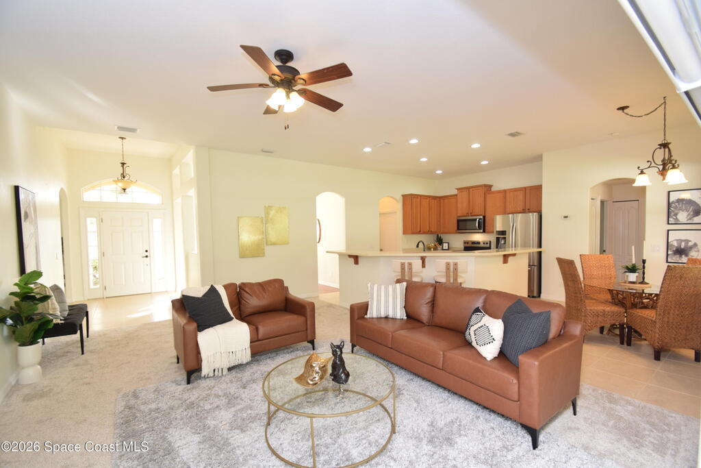 The perfect home for any family! Presenting this meticulous maintained Move in Ready Home in a Gated Community. Beautiful & Welcoming entrance in this 3 bedroom, 2 bath, 2 car garage home. Enjoy large living room / flex space, dining room, A large family room with triple slider door to oversized porch with extensive brick pavers. The Spacious Kitchen offers 42'' wood cabinets with bump stagger design and crown, step up breakfast bar, overlooks the nook area with serene views of backyard. Enjoy a split bedroom plan, owners suite has slider door to porch, a large deluxe bathroom with soaking tub, separate tile shower, dual sink vanity and large walk in closet. Other: roof 2024, new interior paint, Serene views, Dimmers on lightswitch, hurricane panels, All appliances convey, Custom Shades by 3-day blinds, Canal view, private / quiet street with sidewalks, Arch windows, Tall-flat ceilings, Carpet 2024, Lavish landscape, beautiful views, quiet, private, a real Gem of a Home!