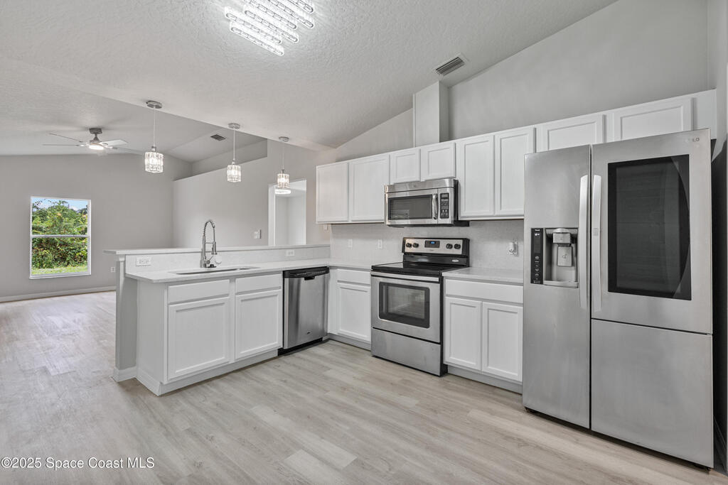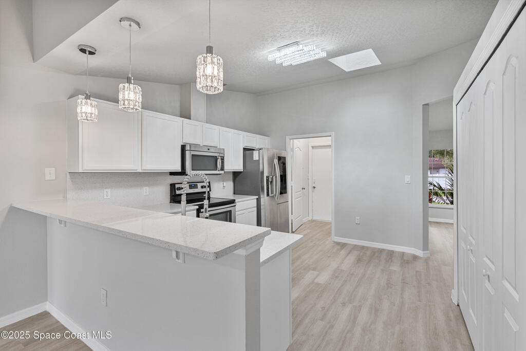 Welcome home to one of the more exquisite modern concrete block homes available in the neighborhood! Updated in 2025 and Upgrades are EVERYWHERE. Fall in love with the spacious floor plan with beautifully designed kitchen & bathrooms. When you enter the home, you are greeted by a living area with high ceilings and boasts updated hurricane impact sliding doors. Also, the spacious family room has new hurricane impact French doors, entrance to the back porch! Remodeled centralized open kitchen that's perfect for entertaining while offering solid surface quartz counters & stainless appliances with ample cabinets and brand-new modern lighting and hardware plus the new hurricane impact skylight that gives natural light to the area.