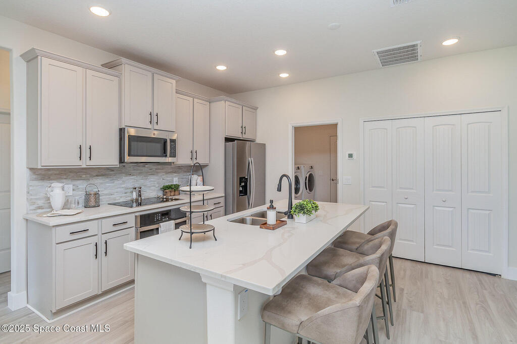SELLER IS OFFERING $10k IN CLOSING COST ASSISTANCE. Experience refined living in this 3 bedroom, 2 bath home located in the gated community of Country Club Estates. 'It offers an elegant stone-accented elevation on an oversized lot, surrounded by a neighborhood of mature oaks for a serene setting. A brand new roof was just completed, adding value and peace of mind. Inside, enjoy soaring 9'4'' ceilings with tray details in the Great Room, Dining Nook, Master Suite, and Flex Room. The Great Room features upgraded 9' sliding glass doors that open to a covered porch--perfect for relaxing or entertaining. The kitchen includes quartz countertops and upgraded cabinetry, carried through to both baths. The Master Suite offers two spacious walk-in closets and dual sinks. Energy-efficient features include low-E double-pane windows and an efficient A/C system. Washer and dryer included. Minutes to shopping, dining, golf, and beaches--live the Florida lifestyle. photos of home when it was staged