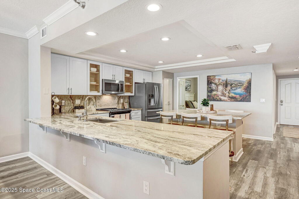 Gorgeous LUXURY oceanfront condo that looks brand NEW because it's fully remodeled! Walk in to see WIDE views of the ocean, through your OPEN kitchen and extended sliding doors. This beautiful NEW kitchen has been masterfully renovated to feature an extra spacious island with quartz counter tops, PLUS an extended breakfast bar too (No walls to obstruct your ocean views!) The split plan gives you the feeling of an extra large and private living space with 2 bedrooms and a bathroom separated from you Primary Suite. Your Primary Suite faces the ocean, with its own sliding doors. The primary bath features 2 separate sinks, soaking tub and a separate shower, plus 2 walk in closets! PLUS- new flooring throughout (no carpet), wine bar & fridge, new light fixtures & so much MORE! Garage includes 2 parking spaces & storage, plus there's ample guest parking too. Coral Reef is a lovely community that is very well maintained & includes an oceanfront pool, ocean access & is pet friendly too!