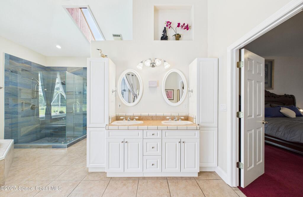 Built-in Features, Ceiling Fan(s), Eat-in Kitchen, His and Hers Closets, Kitchen Island, Open Floorplan, Primary Bathroom -Tub with Separate Shower, Primary Downstairs, Skylight(s), Vaulted Ceiling(s)