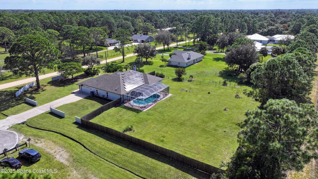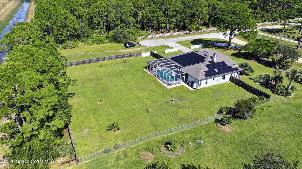 Step through the front door into a bright, open living space with soaring vaulted ceilings and a beautifully updated kitchen featuring a large custom island and natural quartz countertops - perfect for entertaining! Back patio sliders open completely, extending your living area to the sparkling screened pool and spacious backyard where deer and bunnies visit daily. The split floor plan offers generously sized bedrooms and updated baths. Special features: Roof (2022), solar power panels (no electric bills, paid-off at closing), private well (no water bills), 5-ton Trane variable AC with 3 zones and new Fresh Air UV light (2025), plus NEW 2025 Upgrades Include: hot water heater, Culligan water softener, impact windows and (2) entry doors, fresh exterior paint, painted pool deck and garage floor. Meticulously maintained home; located on a corner lot. Enjoy peaceful country living just minutes from shopping, movie theater, and fantastic restaurants. One of a kind home!