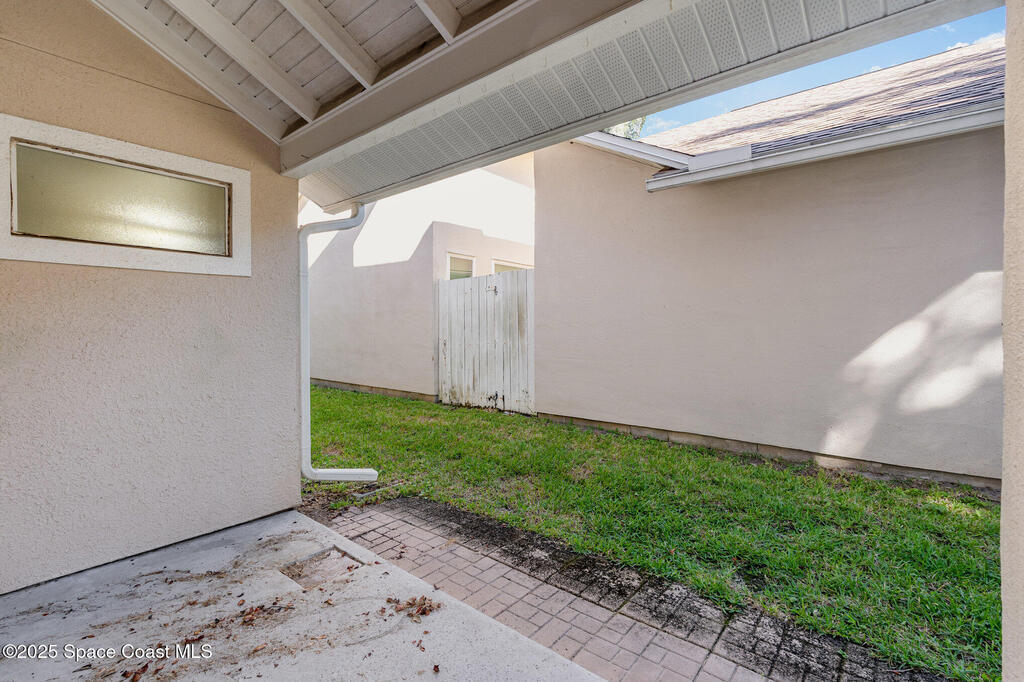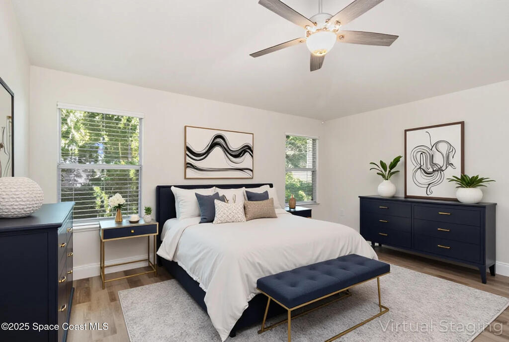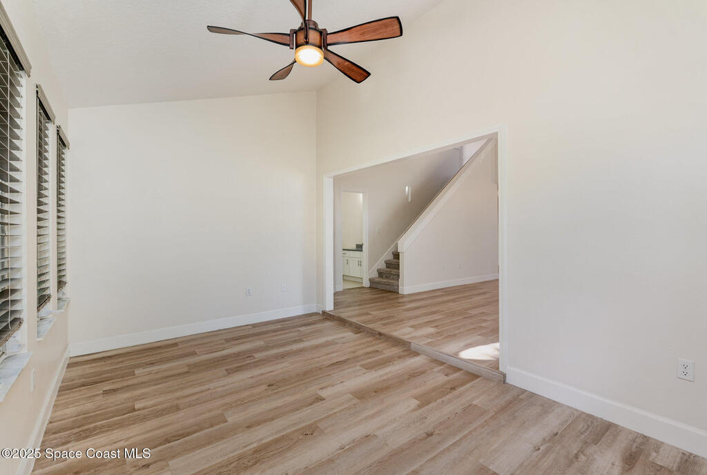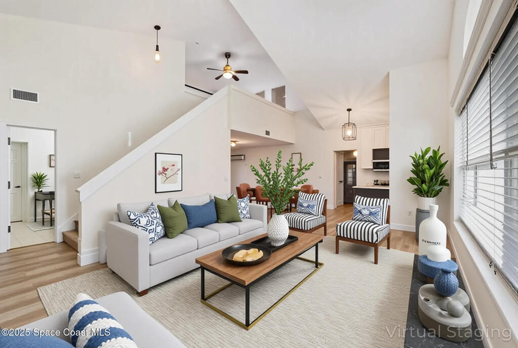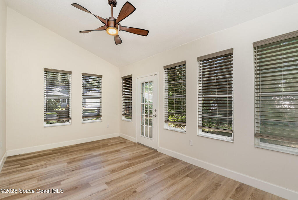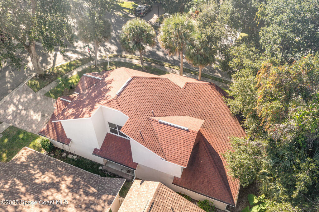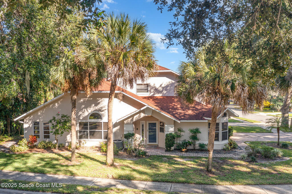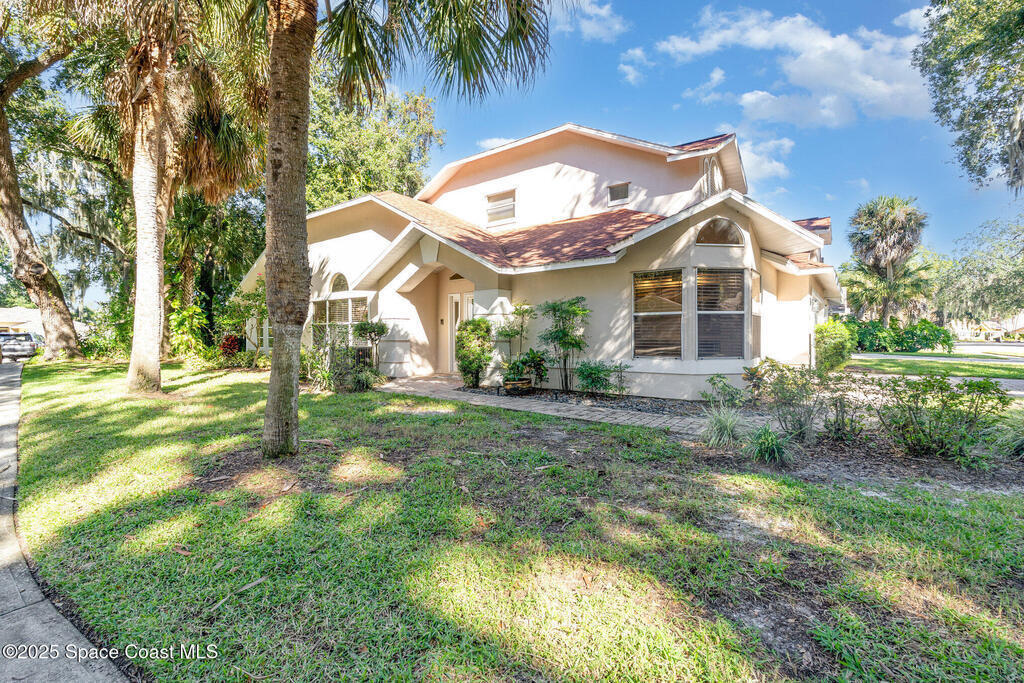 Welcome to Village Woods, a gated and tree-lined community that feels lush and serene. This beautiful home with BRAND NEW ROOF offers a rare primary bedroom on the first floor, with two additional bedrooms, a full bath, and an extra loft upstairs--perfect for guests, hobbies, or a home office. The spacious living room with formal dining area provides an inviting layout for entertaining. Just off the living room, enjoy a sunlit enclosed bonus room, ideal as a den, office, or creative space. The updated kitchen features high-end finishes, modern cabinetry, a wine fridge, and is just off the living areas for easy flow. The HOA covers lawn service, offering low-maintenance living, and you're just a short walk from La Cita Country Club for golf, dining, and social events. Located minutes from I-95, local beaches, and major employers such as Kennedy Space Center, SpaceX, and Blue Origin, this home blends comfort, convenience, and lifestyle! Some pictures are virually staged.