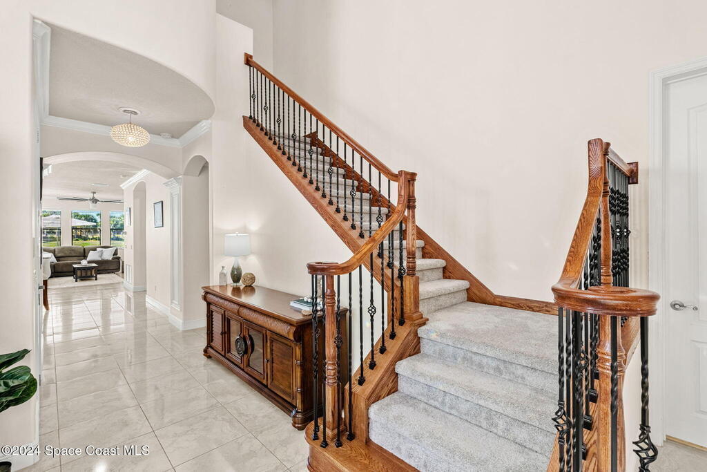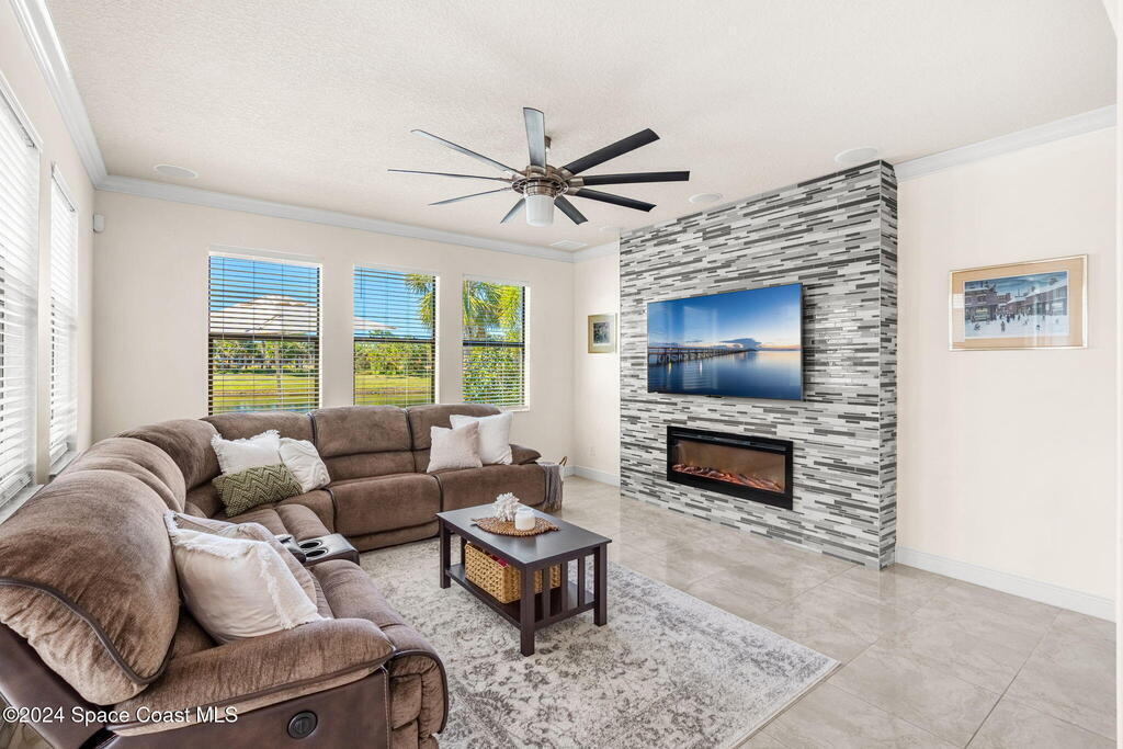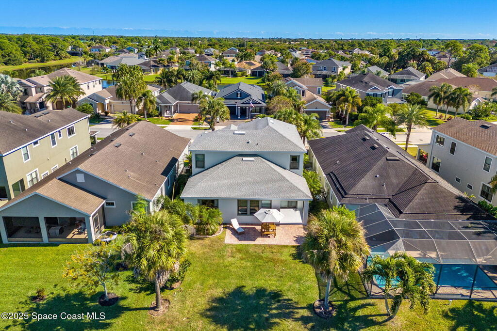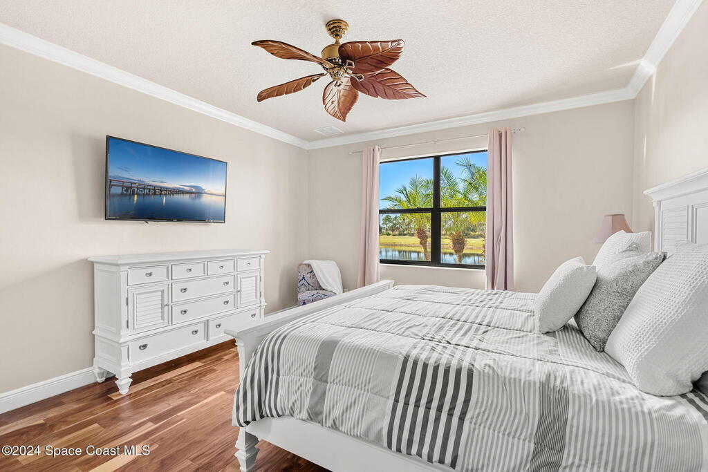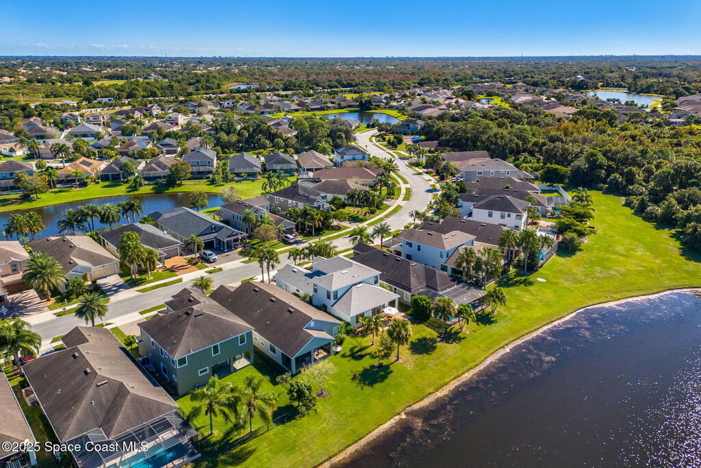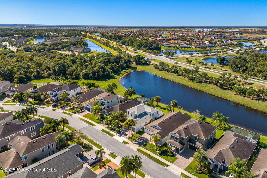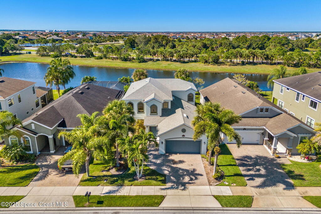 Brand NEW ROOF just installed! Located in the prestigious Strom Park in West Viera, you'll find this beautiful 5 bedroom two story home. We are calling this one ''Peace on the Pond'' with its' gorgeous lot offering incredible sunsets, along with tranquil lake and natural views. Built in 2015 with over 3100' square feet of living space, there is plenty of room for the whole family to relax, entertain and enjoy. Well appointed with upgrades such as granite, 8' doors, crown molding, rich wood cabinetry, custom closets, glass tile accent walls, and an electric feature fireplace. An open layout, multiple living and dining options and abundant storage allows elegance to meet practicality. Downstairs you'll find the Primary suite along with a second bedroom/en-suite~perfect for multi-generational living, home office or gym. One of the 3 upstairs bedrooms is oversized and used for a Home Theatre (all equipment conveys!) Impact windows on the front of the home and the second story.