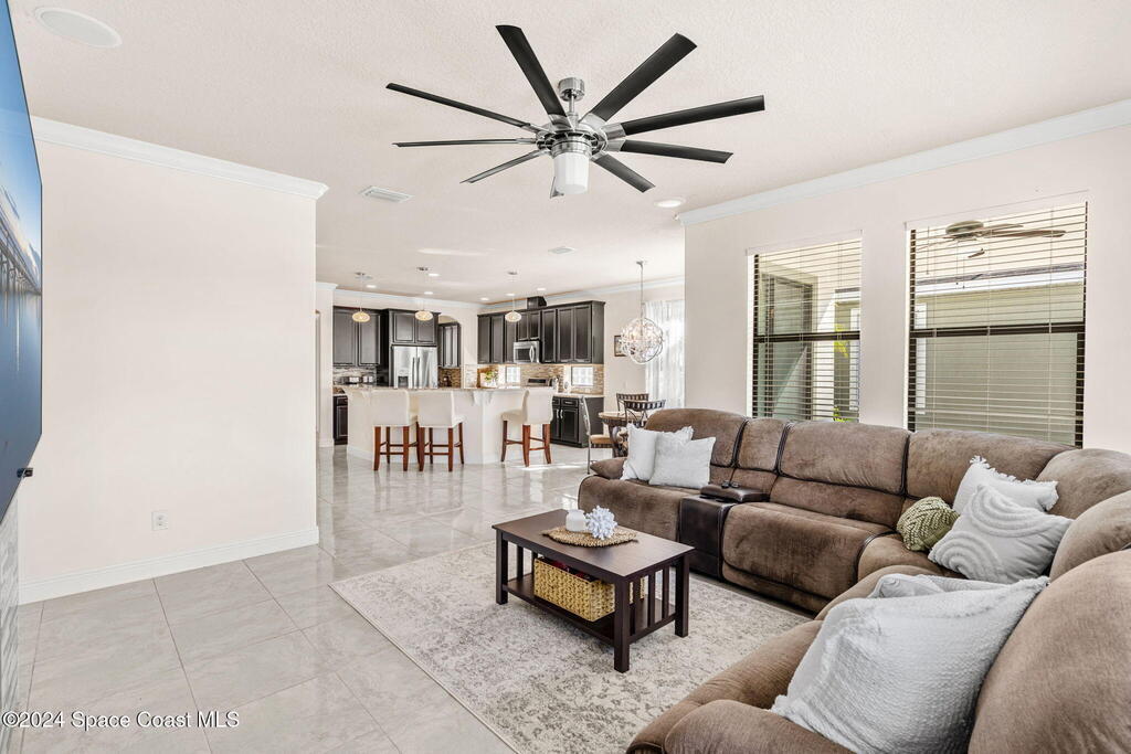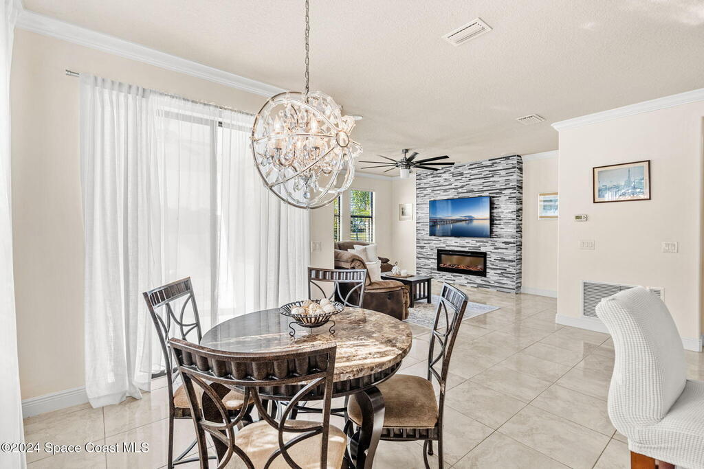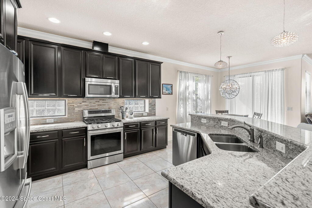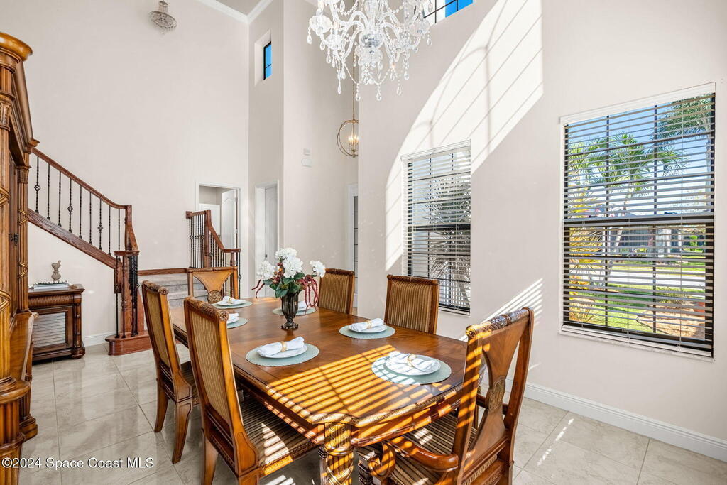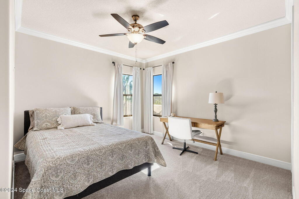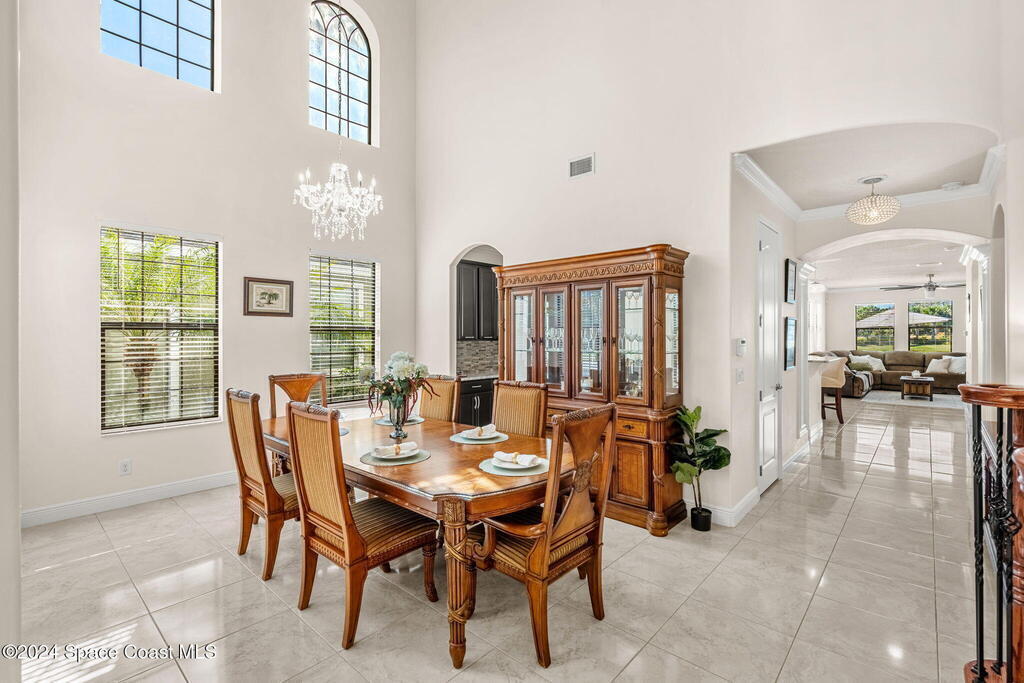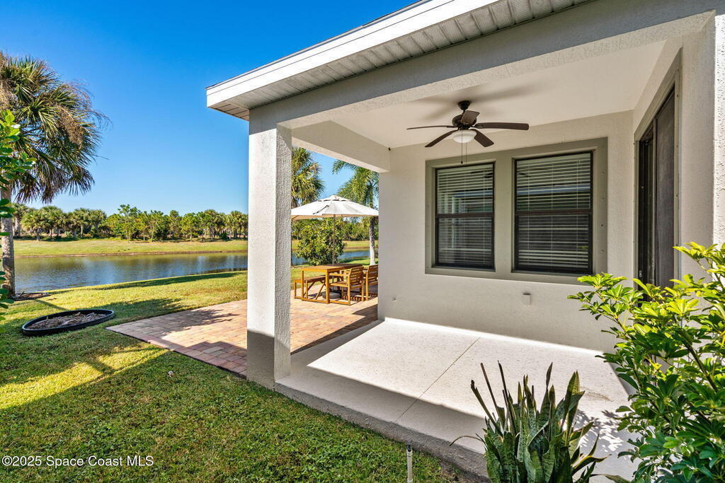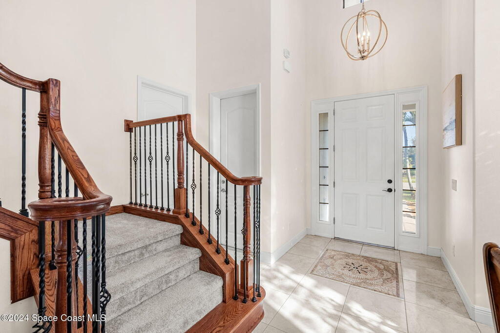 Brand NEW ROOF just installed! Located in the prestigious Strom Park in West Viera, you'll find this beautiful 5 bedroom two story home. We are calling this one ''Peace on the Pond'' with its' gorgeous lot offering incredible sunsets, along with tranquil lake and natural views. Built in 2015 with over 3100' square feet of living space, there is plenty of room for the whole family to relax, entertain and enjoy. Well appointed with upgrades such as granite, 8' doors, crown molding, rich wood cabinetry, custom closets, glass tile accent walls, and an electric feature fireplace. An open layout, multiple living and dining options and abundant storage allows elegance to meet practicality. Downstairs you'll find the Primary suite along with a second bedroom/en-suite~perfect for multi-generational living, home office or gym. One of the 3 upstairs bedrooms is oversized and used for a Home Theatre (all equipment conveys!) Impact windows on the front of the home and the second story.