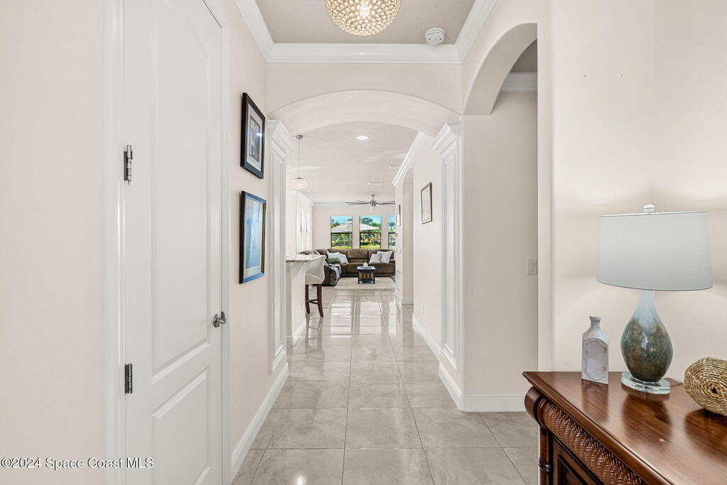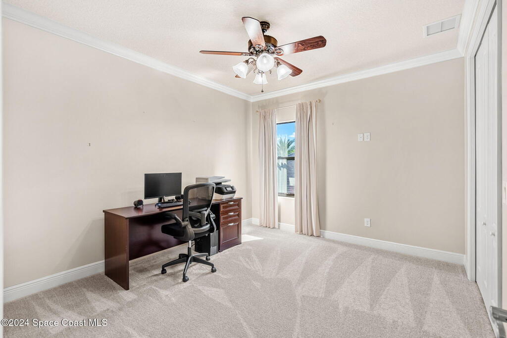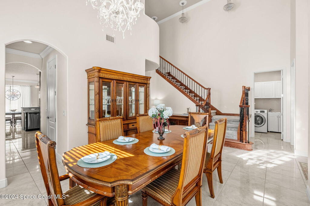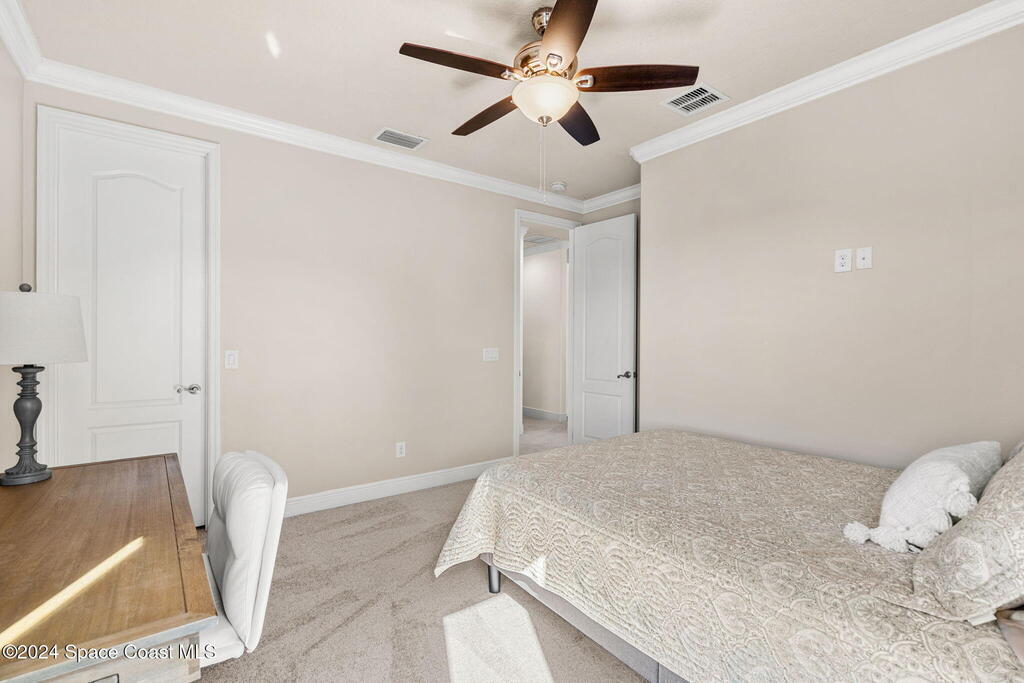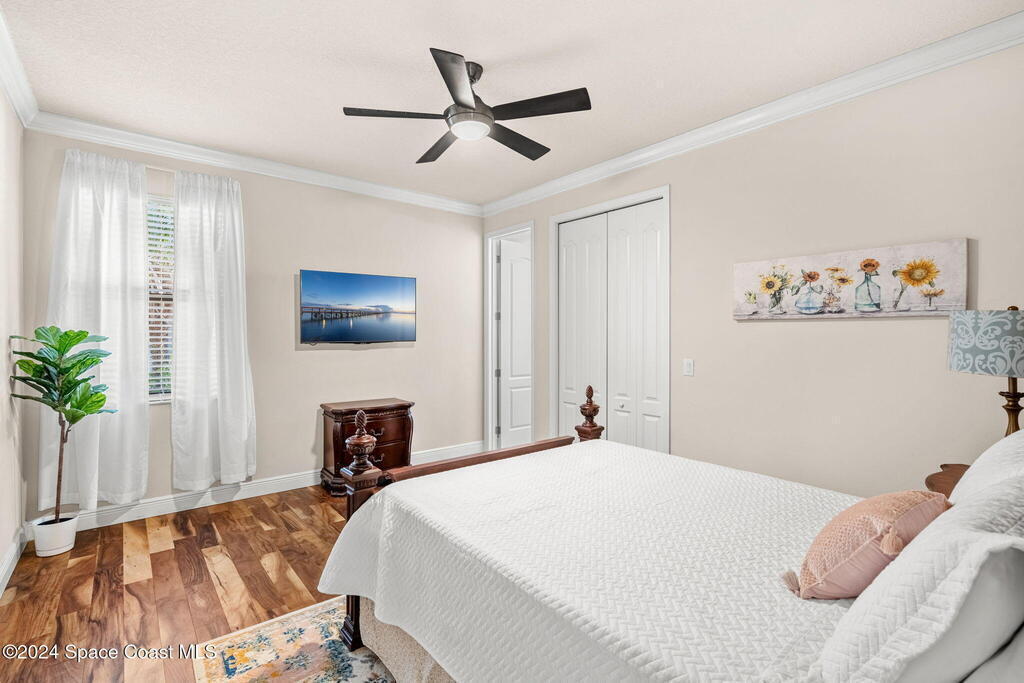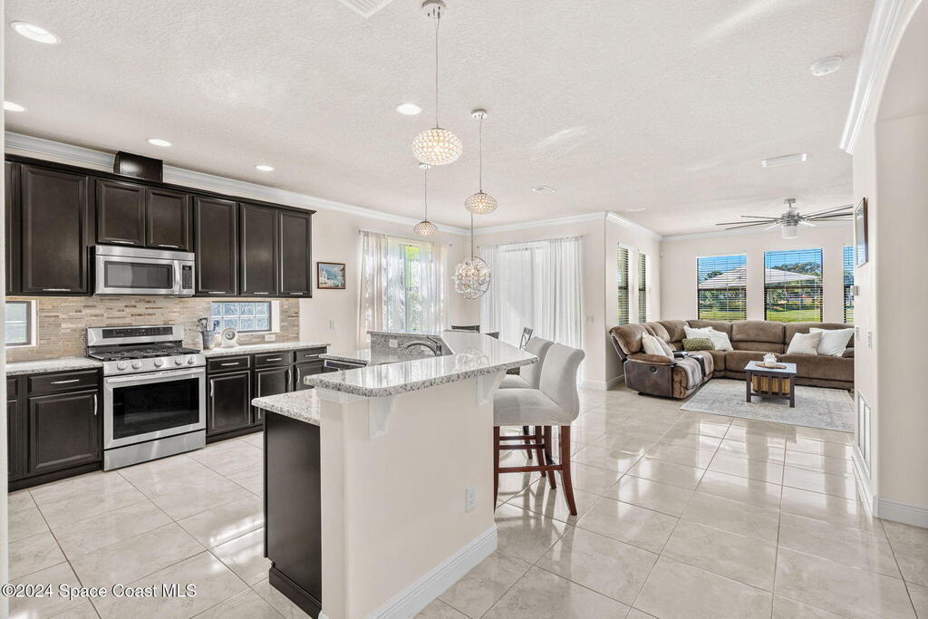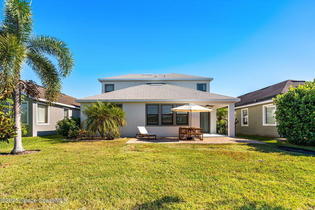 Brand NEW ROOF just installed! Located in the prestigious Strom Park in West Viera, you'll find this beautiful 5 bedroom two story home. We are calling this one ''Peace on the Pond'' with its' gorgeous lot offering incredible sunsets, along with tranquil lake and natural views. Built in 2015 with over 3100' square feet of living space, there is plenty of room for the whole family to relax, entertain and enjoy. Well appointed with upgrades such as granite, 8' doors, crown molding, rich wood cabinetry, custom closets, glass tile accent walls, and an electric feature fireplace. An open layout, multiple living and dining options and abundant storage allows elegance to meet practicality. Downstairs you'll find the Primary suite along with a second bedroom/en-suite~perfect for multi-generational living, home office or gym. One of the 3 upstairs bedrooms is oversized and used for a Home Theatre (all equipment conveys!) Impact windows on the front of the home and the second story.