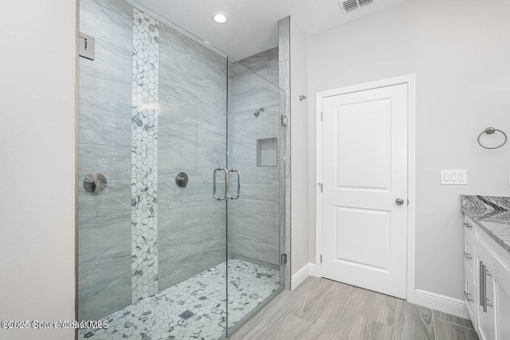 2022 built home offering a modern contemporary design with high end finishes. Entering the home you are graced with 10' ceilings and an open floorplan offering wood plank tile throughout. The bright open kitchen is designed with white cabinetry to include a wine rack, designer marble quartz countertops and stainless steel appliances. Light and bright is an understatement as the windows. pendant and can lighting brighten the home up. Large bathroom with a walk in shower to include glass doors and double shower heads, double sinks with more then enough counter space. Bathrooms are elegantly tiled with custom vanities and quartz counters to compliment the kitchen. Large Walk in closet with double entries from the bedroom and bathroom.