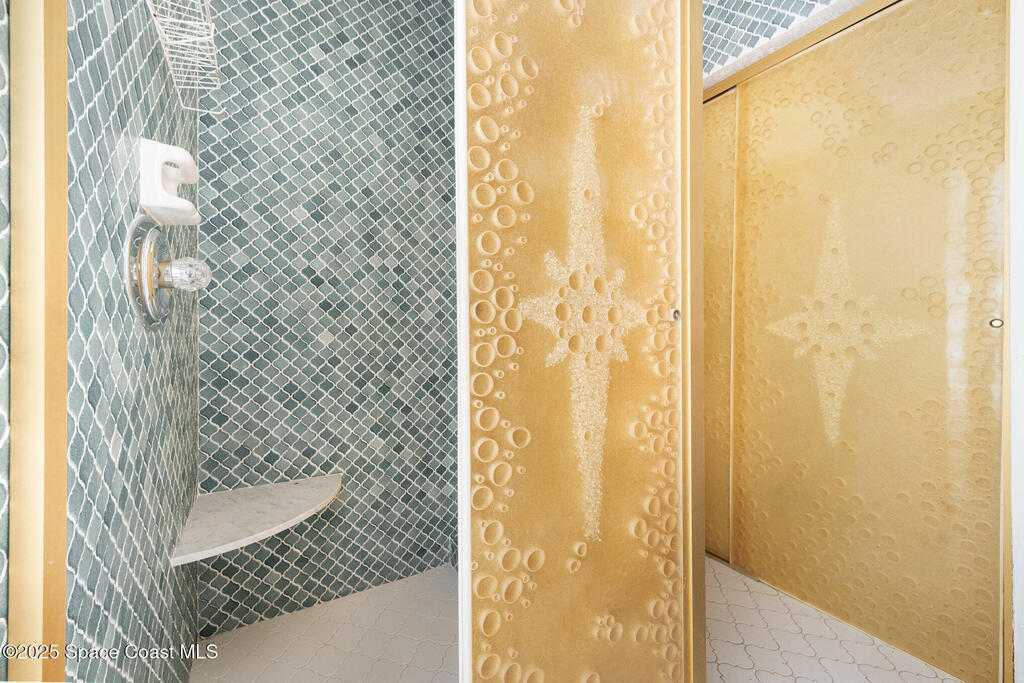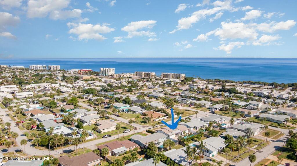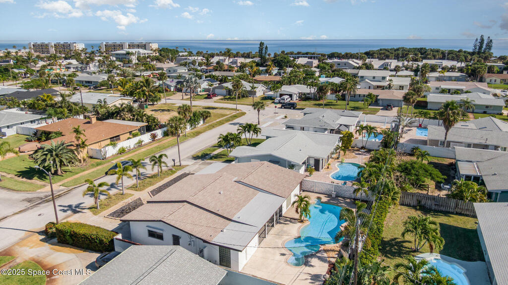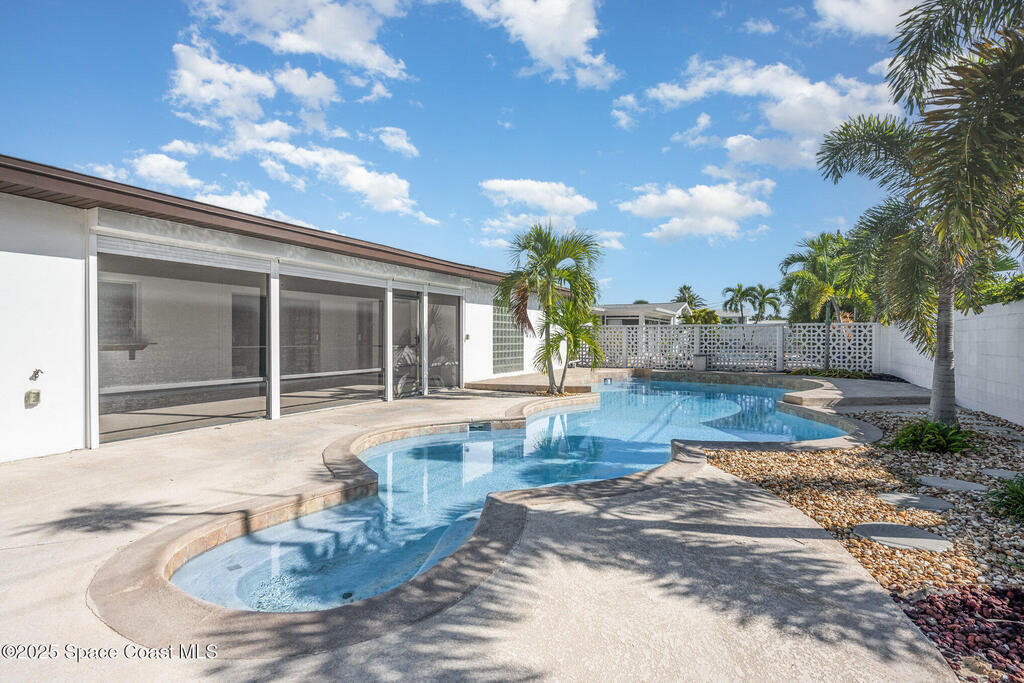 ONE-OWNER LEGACY HOME | MASSIVE 50-FT POOL | DUAL ENSUITES This 2-bed/3-bath pool home (easily converted back to a 3-bed) is situated in the Cresthaven subdivision of Satellite Beach, directly across A1A from Pelican Beach Park. The showstopper is a sparkling 50-ft pool (max depth of 8.5 ft) surrounded by a landscaped deck and concrete block privacy fence. A full pool bath for convenience. Roll-down shutters (partially electric) give you total peace of mind. Interior features include foyer, an open, light-filled layout with distinct living and dining areas. The kitchen features granite countertops, double ovens, and large pass thru window to the pool patio. The 1-car garage is under air and included in the living square footage ideal for a workshop, gym, or climate-controlled storage. Lovingly maintained by one owner since construction, this solid concrete block residence is a blank canvas ready for your modern vision or move-in ready for those who appreciate retro charm. See More