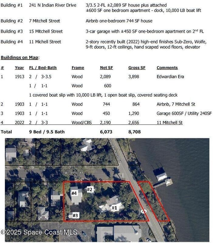Rare opportunity to own a unique, income-producing waterfront property in Cocoa Village. There are 4 buildings, two main homes with a total of 9 bedrooms and 9.5 bathrooms. Custom 2022 home with 2 levels, 3 bedrooms, 3 baths with an elevator and soaring 12' ceilings and 9' doors. This stunning home features a gourmet kitchen with Wolf gas range, Sub-Zero fridge, Miele coffee maker, wine bar, brick accents, hand-scraped hardwood floors, and gorgeous views. There are three other buildings, an Edwardian era main house (former B&B) with 3 bedrooms, 3.5 bathrooms, gourmet kitchen with an attached one-bedroom apartment with separate entrance. Also, a thriving Airbnb cottage that all sit on 133' of Indian River frontage with dock and 10, 000 lb. boat lift. Property also includes a 3-car garage, with a one-bedroom apartment above with patio and garden planters. Turnkey, and leases convey. Rocket launch site, and so much outdoor living! Walking distance to all that Cocoa Village has to offer!