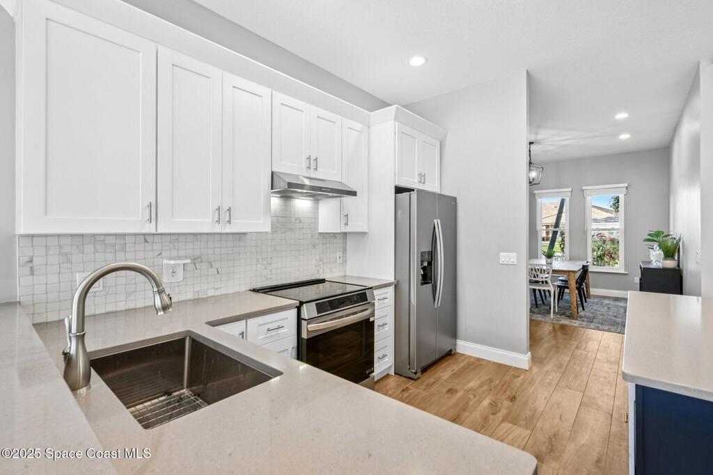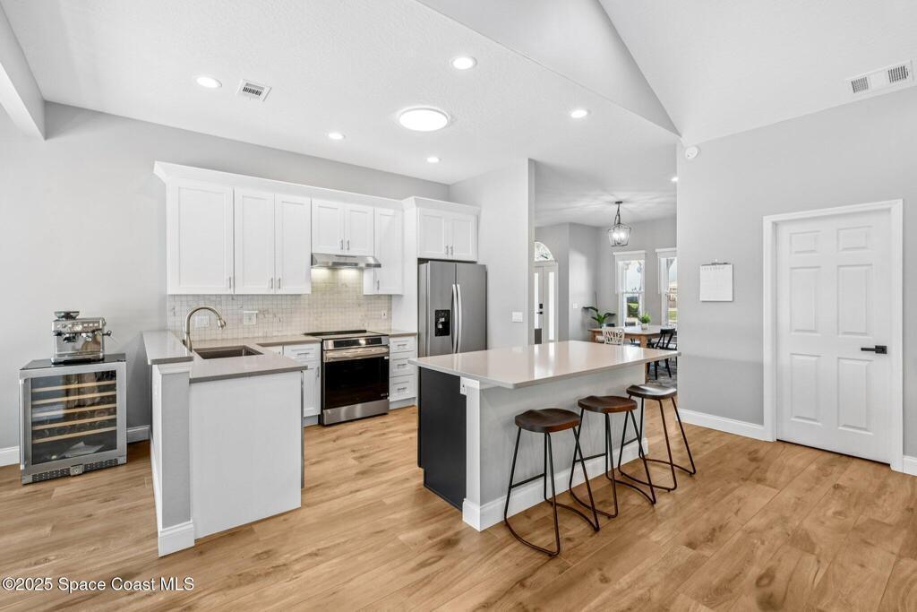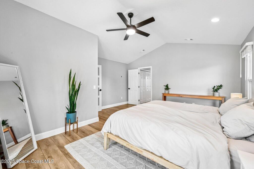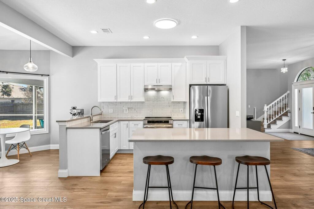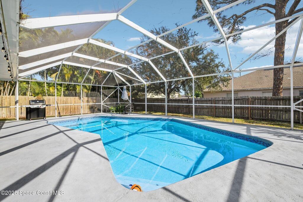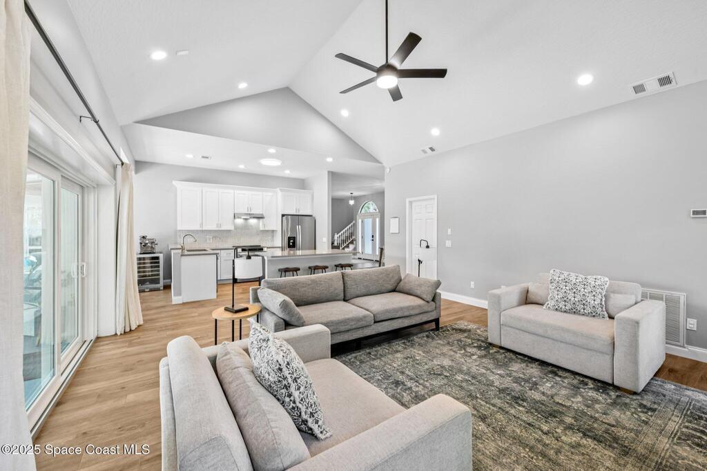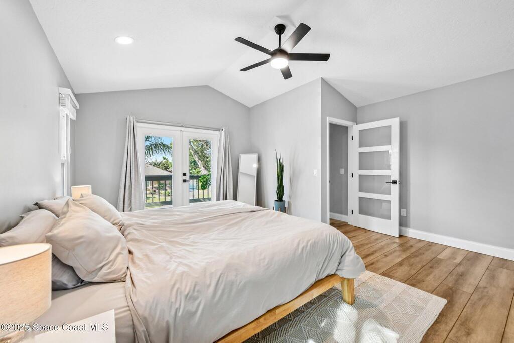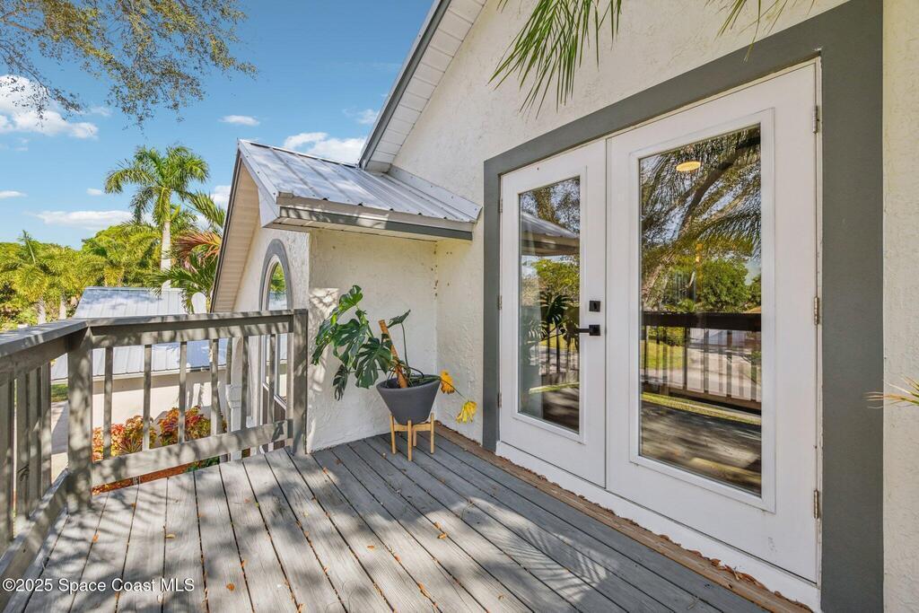 Back on the market--motivated sellers want this under contract ASAP. Set between the Banana River and Sykes Creek on a quiet dead-end street, this fully remodeled pool home offers easy coastal living. All major systems were replaced in 2023, including a metal roof, impact windows, two A/C units, and a water heater.The open kitchen features Whirlpool stainless appliances, quartz countertops, white cabinetry with a navy island, and a breakfast nook, flowing into the family room with a coquina fireplace and triple collapsible impact slider. Updates include wood-look tile floors, fresh interior and exterior paint, new lighting and fans, new interior doors, and updated baths.Downstairs offers a second living area with French doors to the pool, dining space, two bedrooms, a full bath, and storage. Upstairs, the primary suite includes French doors and an updated ensuite. Enjoy a screened-in pool and private backyard close to waterfront parks, boat ramps, and Merritt Island amenities.
