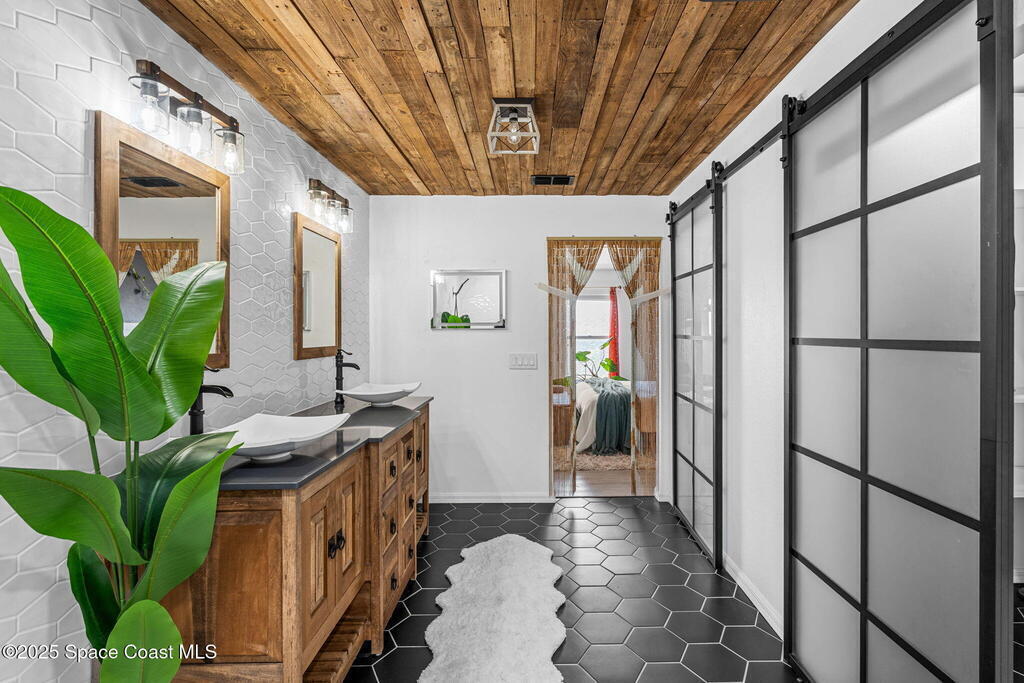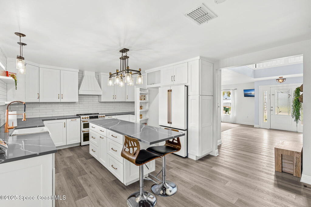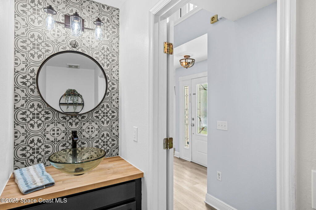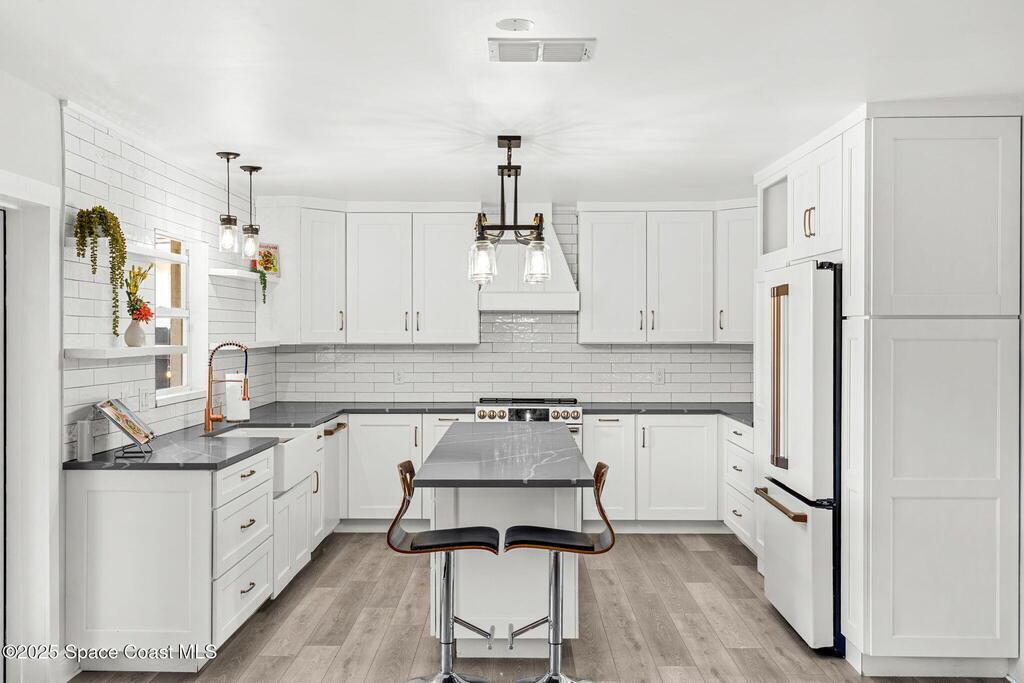 Behind the gates of a low-HOA community, a 5BD/2.5BA standout delivers instant wow w/ fresh interior & exterior paint, new roof, new exterior light fixtures, stone-infused LVP, & custom tile accent walls that feel straight from a designer's mood board. The modern island kitchen steals the show w/ Cambria marbled quartz, counter-to-ceiling subway tile, soft-close artisan white cabinetry, Cafe appliances w/ bronze hardware, an apron-front sink, & a hidden walk-in pantry complete w/ a built-in microwave + butcher-block buffet made for hosting. A 1st-floor BD w/ closet flexes as guest space, office, or bonus room, while the family room brings character w/ shiplap-style walls + floating shelves before opening to a spacious loft. The primary suite reads like a true retreat, styled w/ bedside chandeliers & a spa-like ensuite featuring frosted glass sliders, oblong white tile, a jetted shower, & double rectangular vessel sinks w/ warm wood accents.
