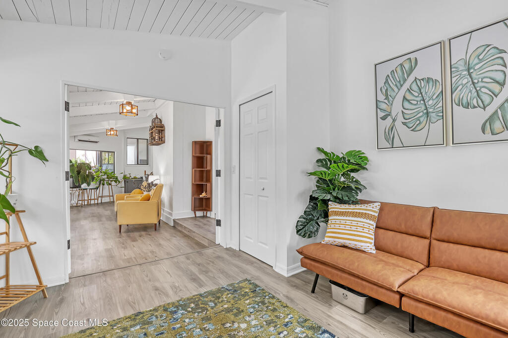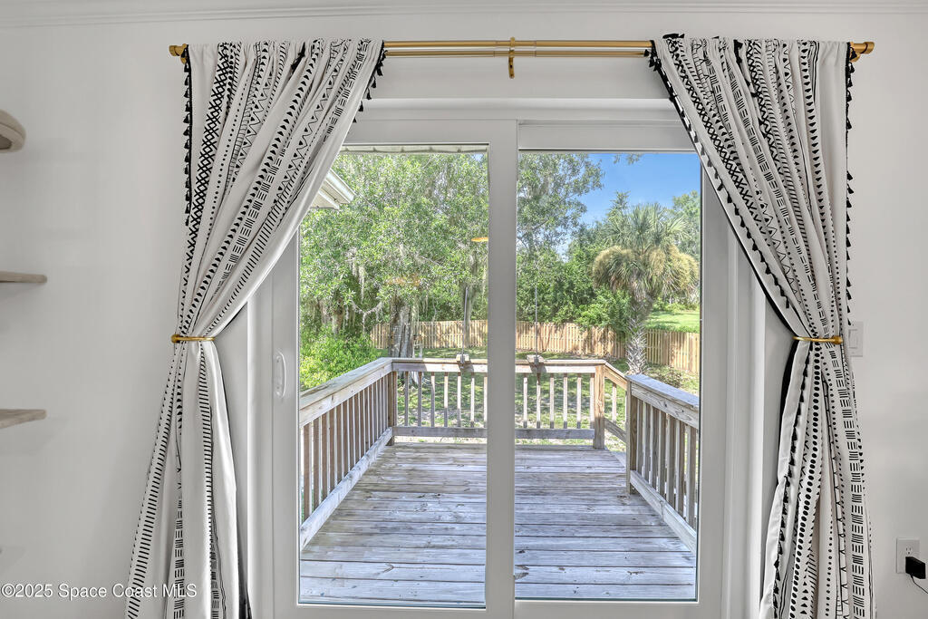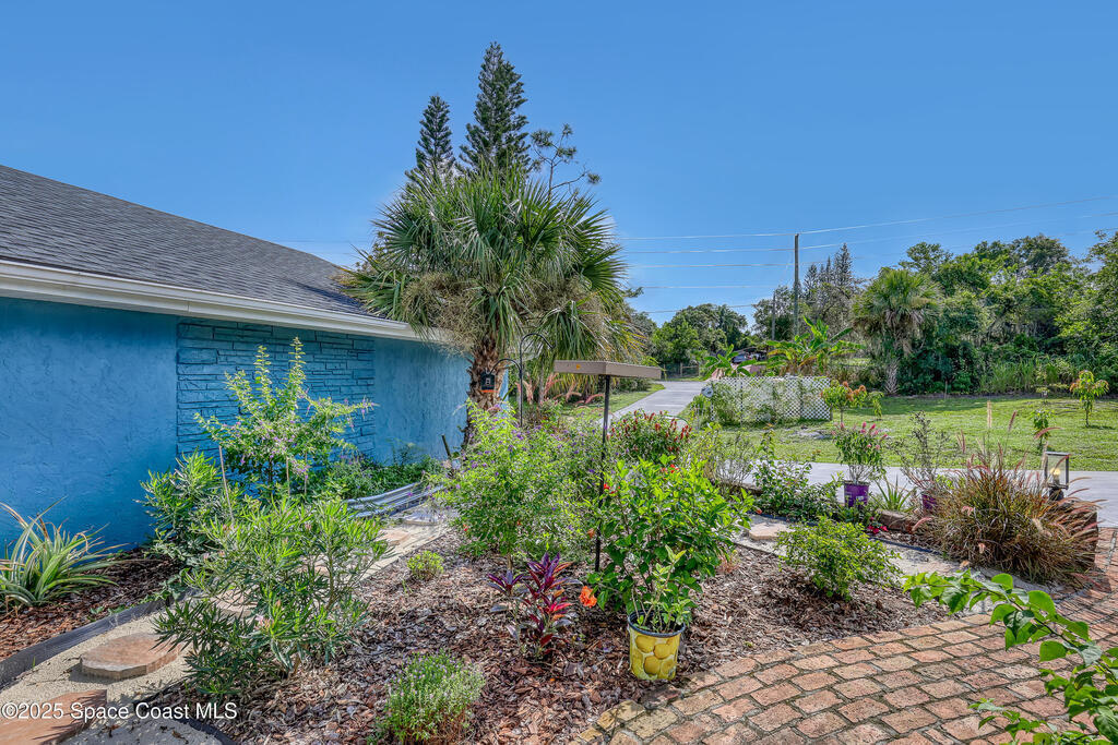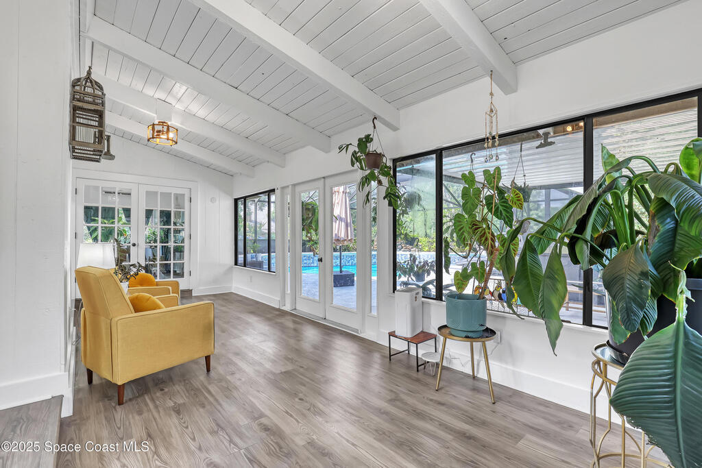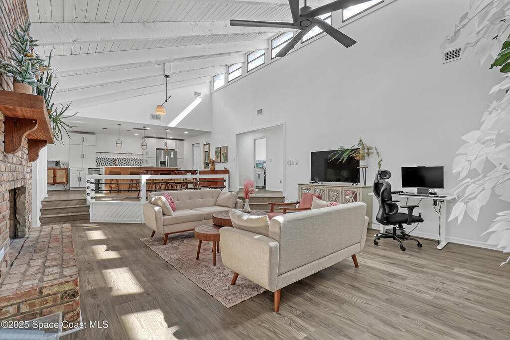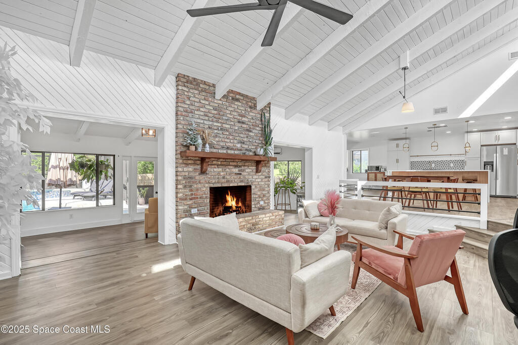 Watch live rocket launches from NASA Kennedy Space Center, relax on the beautiful beaches nearby, and explore historic Titusville! Welcome to this gorgeous, fully renovated Mid-century Modern home featuring a newer roof (2022) and soaring vaulted ceilings, exposed wooden beams, and walls of windows that flood the space with natural light. The open floor plan offers 3 bedrooms, bonus office, two dining areas and a chef's kitchen with a large island, quartz waterfall countertops, modern marble backsplash, and elegant gold accents. Step outside to your private oasis: a completely refinished Saltwater pool with a tranquil waterfall feature, surrounded by a covered sitting area--perfect for entertaining or relaxing. 3-car garage with high ceilings and a spacious concrete patio--ideal for working on vehicles or extra parking 3 driveways for easy access and ample guest parking