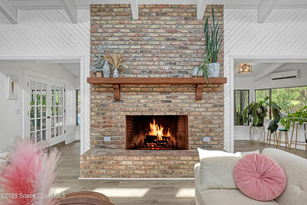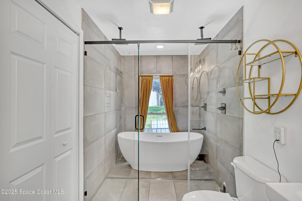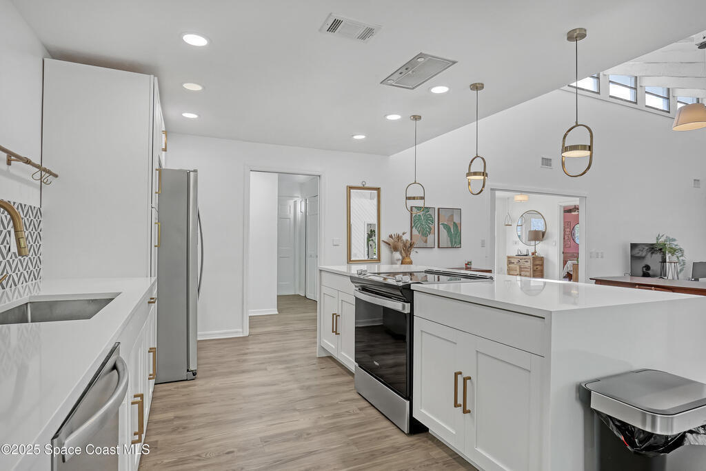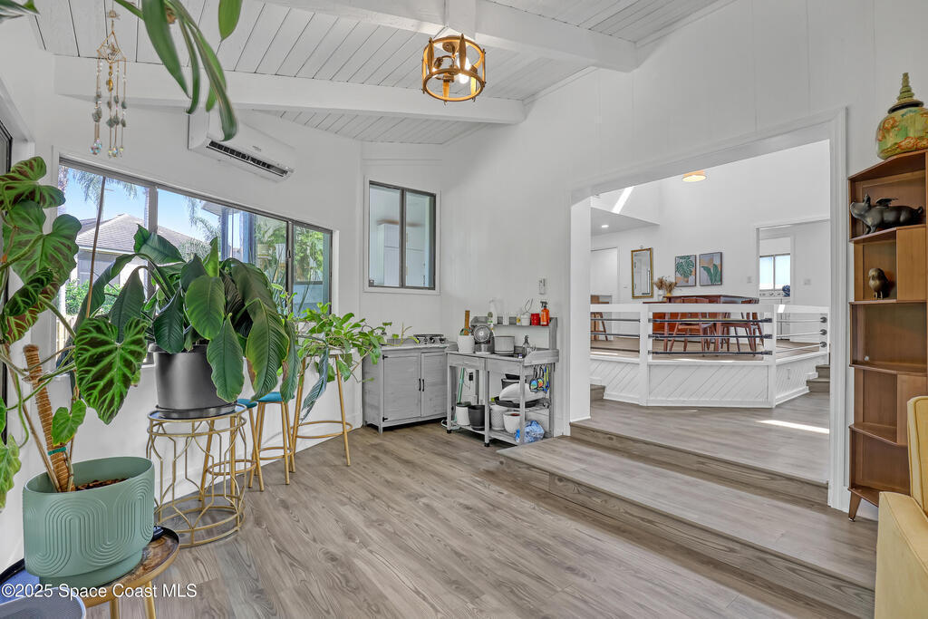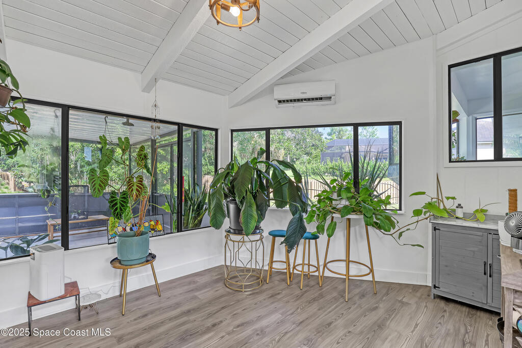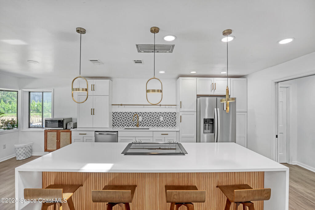 Watch live rocket launches from NASA Kennedy Space Center, relax on the beautiful beaches nearby, and explore historic Titusville! Welcome to this gorgeous, fully renovated Mid-century Modern home featuring a newer roof (2022) and soaring vaulted ceilings, exposed wooden beams, and walls of windows that flood the space with natural light. The open floor plan offers 3 bedrooms, bonus office, two dining areas and a chef's kitchen with a large island, quartz waterfall countertops, modern marble backsplash, and elegant gold accents. Step outside to your private oasis: a completely refinished Saltwater pool with a tranquil waterfall feature, surrounded by a covered sitting area--perfect for entertaining or relaxing. 3-car garage with high ceilings and a spacious concrete patio--ideal for working on vehicles or extra parking 3 driveways for easy access and ample guest parking