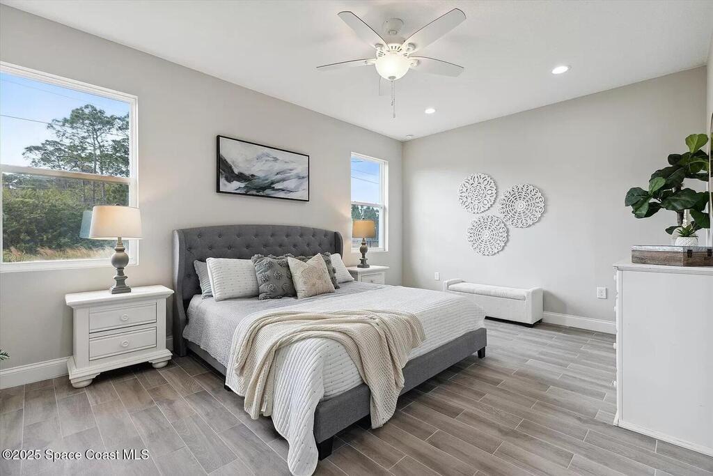 One or more photo(s) has been virtually staged--New Construction. This Luxurious 4-bedroom, 2 Bath Property is exquisitely built with all of the upgrades nestled in the heart of Palm Bay. Inside you will find a wonderfully open floor plan perfect for gatherings and entertaining. The capacious Chef's Kitchen is stylishly equipped with an island, solid wood cabinets, stainless steel appliances and ample storage. The contemporary living space is bursting with natural light and a flowing layout that is inviting and relaxing. Luxuriate in the vast Primary Suite that offers a collection of modern conveniences. This beautiful house is full of INCLUDED upgrades: solid wood soft close cabinets in the kitchen and in the bathrooms, luxury vinyl plank flooring (no carpet), and floor-to-ceiling tiles in the showers, bathroom niches, granite countertops in the kitchen and baths, 9'4'' ceilings, 8-foot doors, luxury handles, and an electric garage.