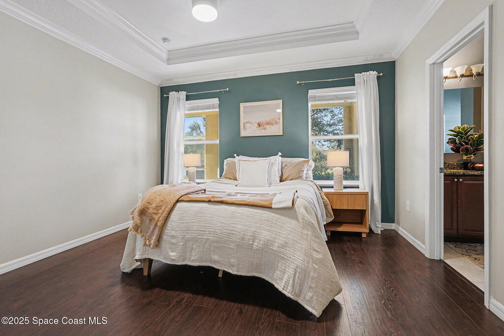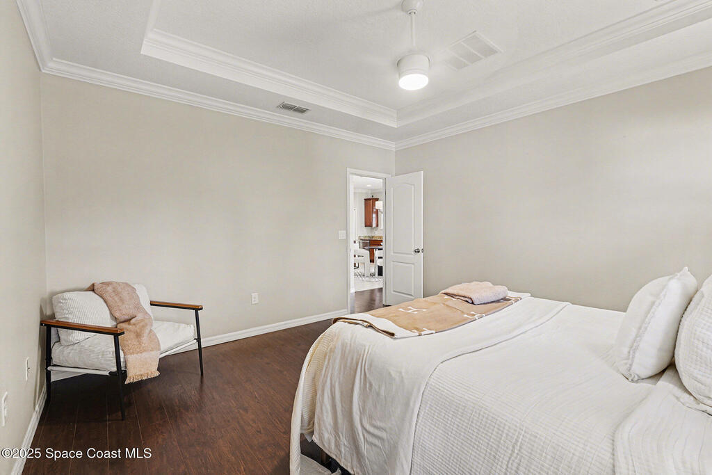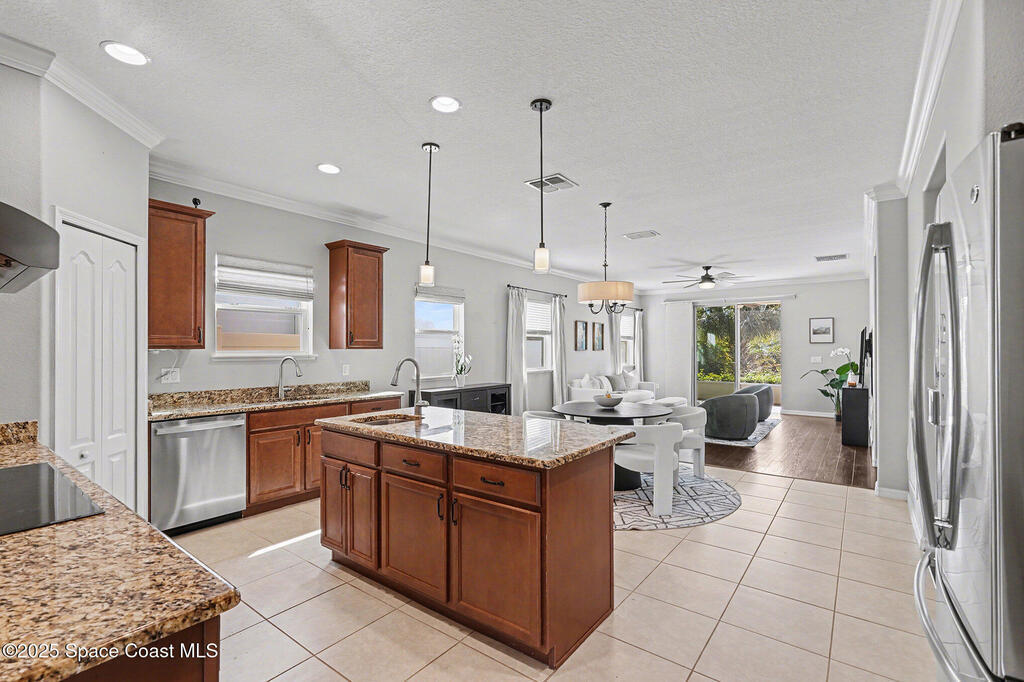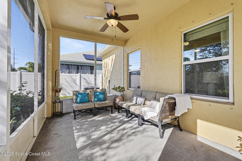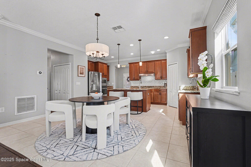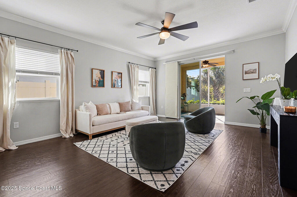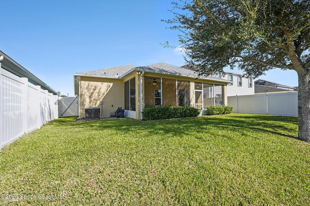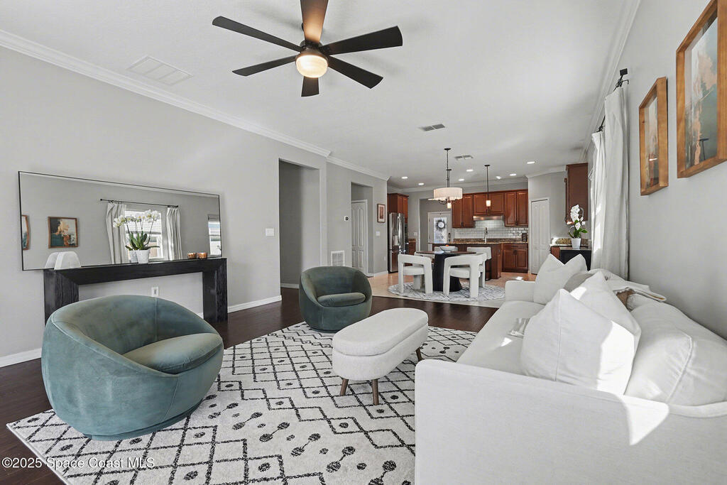 Welcome home to this beautifully upgraded 4-bedroom, 2-bath residence offering 1, 713 sq. ft. of comfortable living space in desirable West Melbourne. This well-maintained home features 9+ ft ceilings, elegant crown molding, and stylish laminate flooring, creating a bright and inviting atmosphere. The spacious chef's kitchen is perfect for entertaining and everyday living, complete with granite countertops, bullnose corners, modern finishes, and a new dishwasher (2024). Major updates include a new roof and garage door (2023) for added peace of mind. Enjoy Florida living year-round on the expansive 1030 screened porch, overlooking a preservation area with no rear neighbors, offering exceptional privacy. Additional features include smart switches and an electric car charger. Conveniently located near shopping, dining, parks, major roadways, and A+ schools, this move-in-ready home offers comfort, privacy, and convenience.