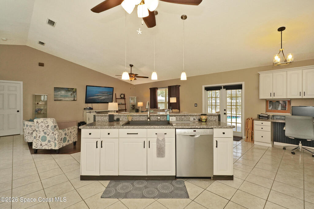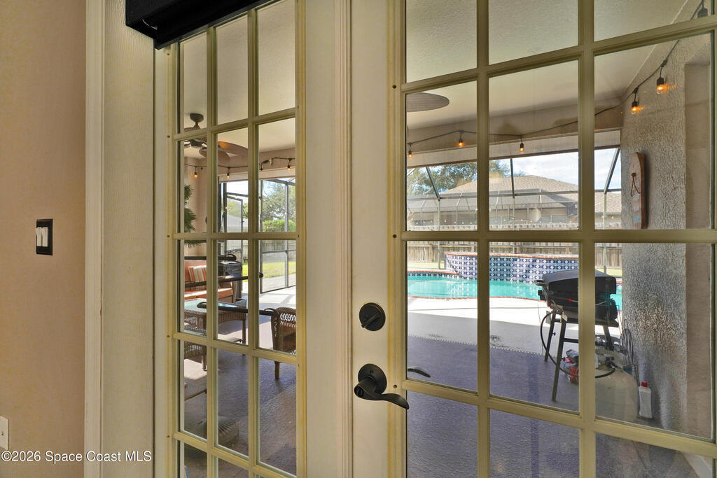 This beautiful corner lot, 2, 236 sq. ft. open plan home has 4 or 5 bedrooms , 2 baths, and a bright office (5th bedroom) area next to the kitchen, dining room, large family room with views of the enclosed pool deck and patio. There are ceiling fans in every room and the kitchen has stainless appliances including refrigerator, gas stove, lots of cabinet space, a roomy pantry, an island with sink and dishwasher overlooking the family room and has French doors leading to the patio and pool area. The large master bedroom with a large walk-in closet, and a grand bathroom with a double sink vanity, a step-up tub, and a separate glass brick shower. The 2-car garage has storm shutters for the whole house and water treatment equipment. Brand new AC This friendly Windsor Estates neighborhood has a recreation area with a tennis court, basketball court and kids playground gym, is near shopping, churches, schools, parks and restaurants, and is 50 miles from Orlando and 5 miles to the ocean beaches
