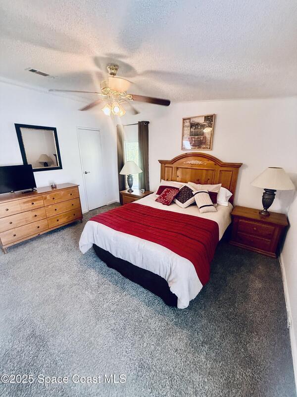 Welcome to this beautifully fully furnished 2-bedroom, 2-bath home located in the desirable 55+ community of Palm Bay Colony. This inviting residence offers a comfortable living and dining room combo, perfect for both relaxing and entertaining. Ceiling fans throughout and central heat and air ensure year-round comfort, while the soft carpet flooring enhances the cozy atmosphere.The electric kitchen comes equipped with everything you need, including a refrigerator, stove/oven, microwave, and dishwasher. Both bedrooms are generously sized, with ample storage and natural light.Enjoy the Florida lifestyle with a fenced-in backyard and both a screened front porch and screened back porch, providing ideal spots for morning coffee, evening breezes, or hosting guests.This thriving community offers convenience and leisure, as residents might be found socializing at the clubhouse or getting their rays by the swimming pool. Get your fitness in at one of the tennis or