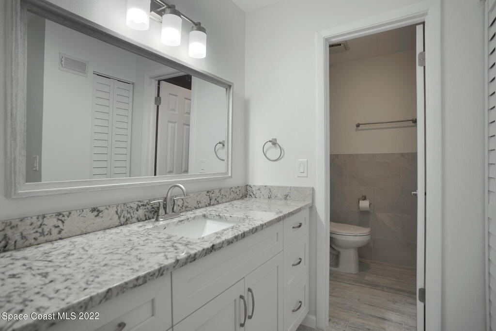 Paradise found in this two story townhouse located in gated Beachwoods community. Come see this beautiful renovation with remodeled kitchen with new white cabinets and granite countertops. The primary bathroom was completely gutted and has updated vanity/sink/faucet plus updated tiled shower with glass door and toilet has been replaced and floors tiled.Recently painted inside with fresh baseboards. Updated electrical panel plus new electrical outlets, fans and lights. New A/C vent covers and new closet doors and new carpeting. Super light and bright inside. Fenced in patio is perfect for pets or relaxing and enjoying the lazy afternoon. Beachwoods has so many amenities and HOA fee is only $248 a month and it includes cable/wifi, lawn care plus access to playground, gym, tennis court, community pools, racquetball courts, basketball courts, pickle ball court, WALK TO RIVER PIER AND OCEAN ACCESS IN LESS THEN 5 MINUTES.
