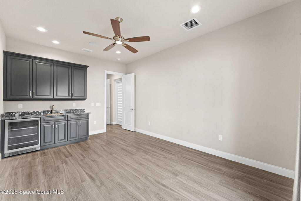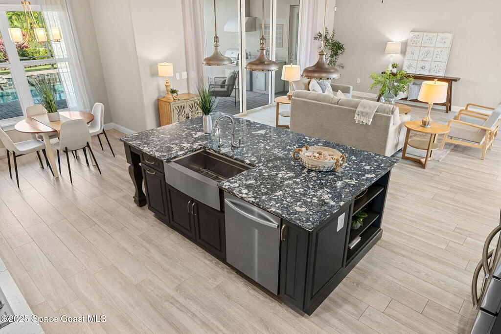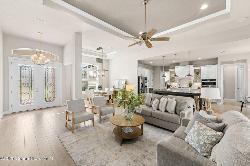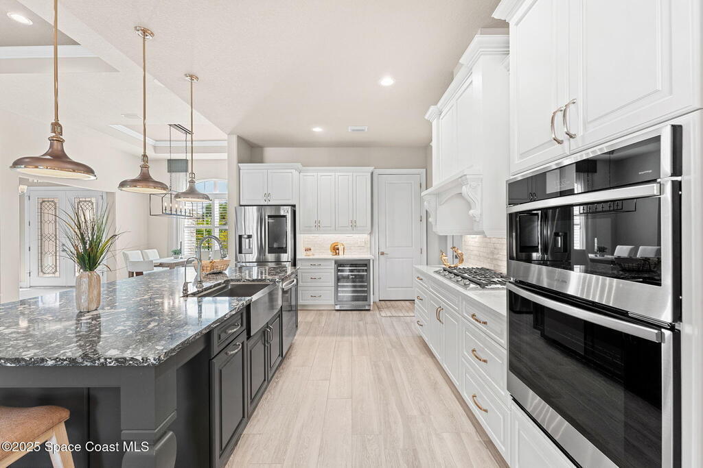 Vaulted ceilings, wall-to-wall tile, and a wide-open layout define this former model home in gated St. Andrews Manor, where upgrades shape the way it lives. Granite countertops elevate the kitchen, and both the indoor and outdoor kitchens have exhaust fans. Impact windows and electric roll-down storm doors simplify storm prep, backed by a whole-house surge protector, reverse osmosis system, and a gas Generac 22kW generator. A split-bedroom design preserves privacy, highlighted by a guest suite with a built-in wet bar, drink fridge, and custom cabinetry. Outside, an electric awning shades the lanai, a saltwater pool anchors the space, and rear gutters drain to preserve the backyard. A 3-car garage, 2020 washer and dryer, and 2023 oven complete a home that feels polished, prepared, and perfectly placed in one of the area's most convenient and highly desirable gated communities.