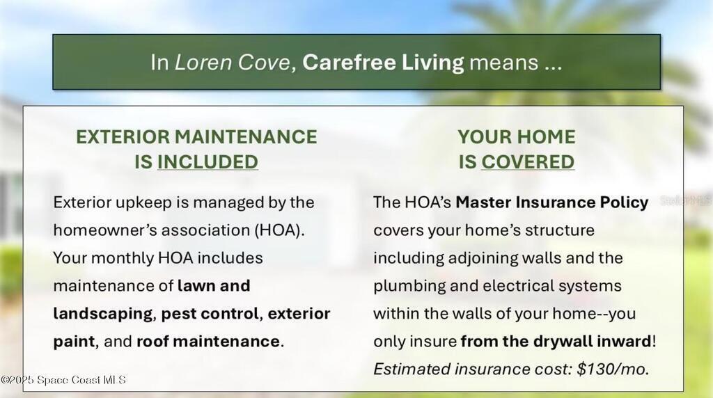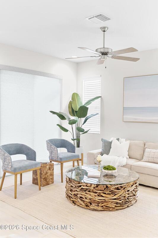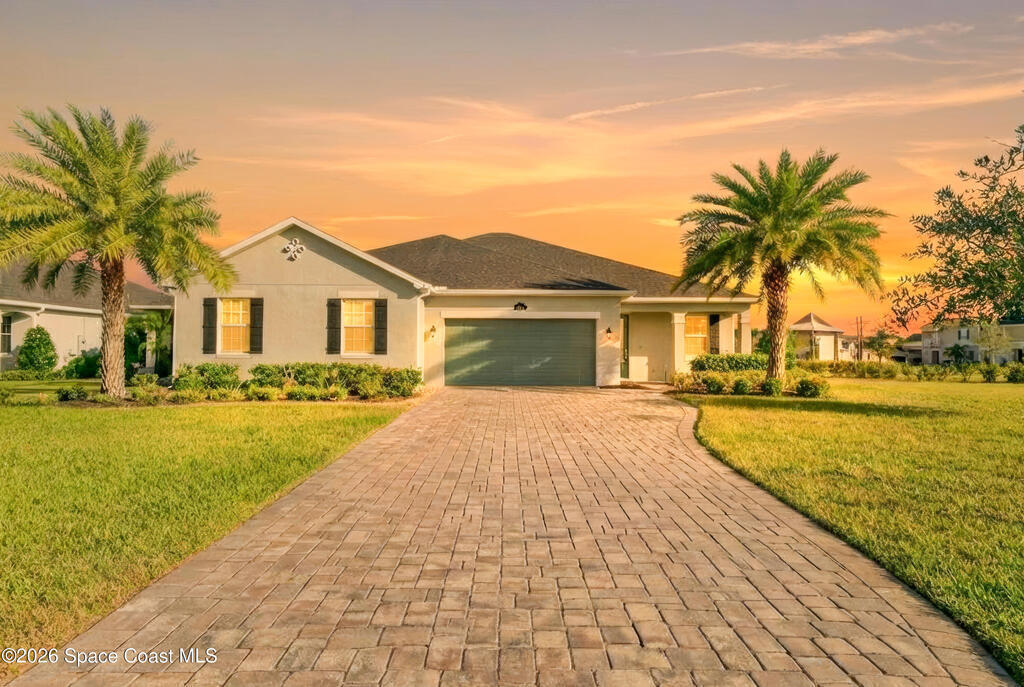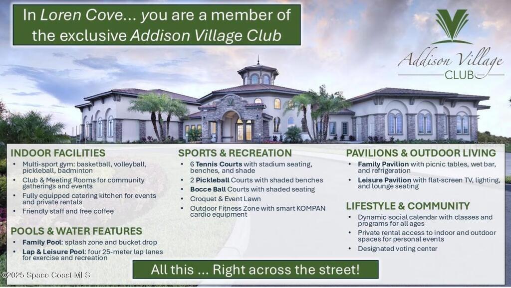 Welcome to this highly desirable Saratoga model, a 3 bedroom, 2 bathroom home on one of the most desirable lots in Loren Cove, located in the heart of Viera West. This golf cart friendly, maintenance free community is directly across the street from Addison Village Club and within walking distance to Publix, restaurants, and ice cream shops.This home offers a split floor plan with an open layout, filled with natural light and 10 foot ceilings. The kitchen features granite countertops, stainless steel appliances, a walk in pantry, and a wine bar. Tile flooring runs through the main living areas, with carpeted bedrooms for comfort. The primary suite includes a walk in shower and walk in closet. Enjoy the screened in lanai overlooking HOA maintained green space.Residents enjoy access to Addison Village Club, including a fitness center, indoor basketball, tennis, pickleball, playgrounds, and community events. Conveniently located near Viera Avenues shopping and dining.