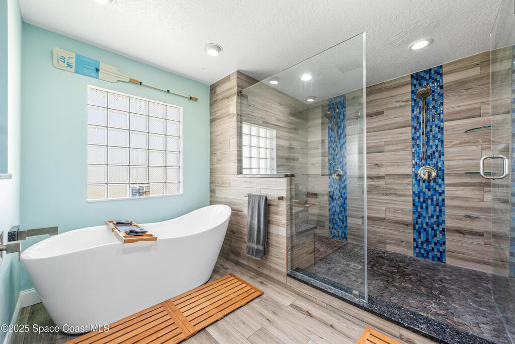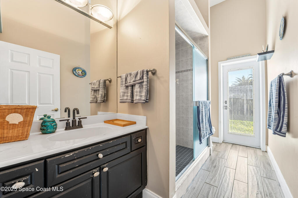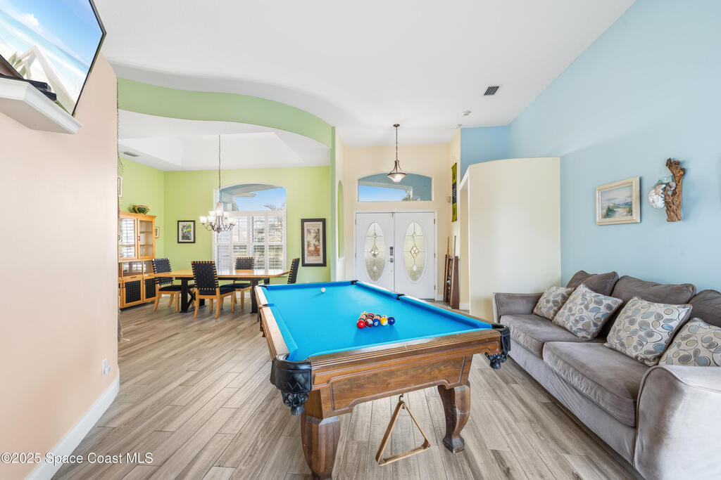 Tucked away at the end of a quiet cul-de-sac in the heart of Indialantic, 452 Veracruz Blvd offers rare privacy just steps from the beach. Set on a .32-acre lot, the oversized fenced backyard provides room for boat storage with permitted rear road right-of-way, while the Beach Street public beach access puts sunrise walks and surf sessions in quick reach. Major updates remove the guesswork, including a 2019 roof, a fully resurfaced and retiled pool completed in 2016, Pentair variable speed pool pump in 2024 and two HVAC systems installed in 2020, each with a 10-year warranty. Inside, gorgeous wood-look tile flooring and vaulted ceilings throughout create a bright, open feel. The floor plan features three bedrooms, dedicated office, an upstairs bonus room that can easily function as an additional bedroom, and two full bathrooms. The primary suite is a true retreat with a spa-style bath featuring a soaking tub, oversized walk-in shower, dual sinks, and a chic frosted-glass water closet.