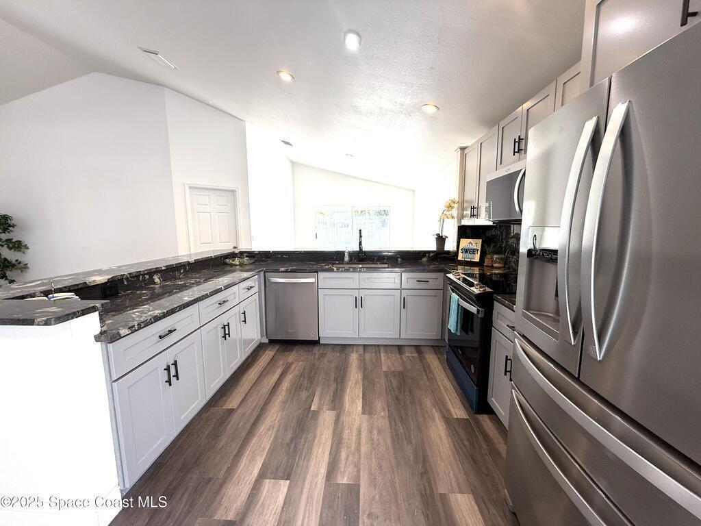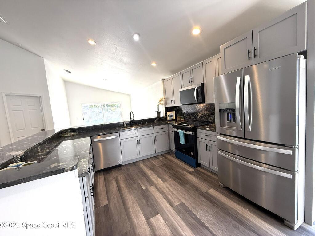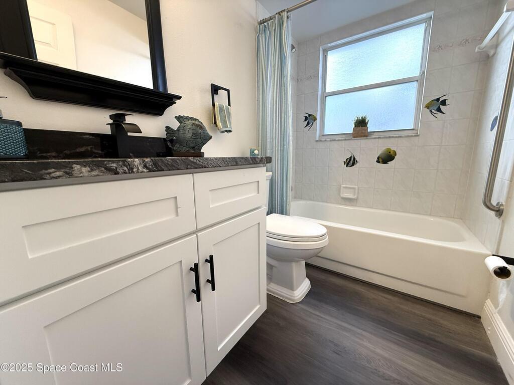 Stunning 3BR/2BA/2 Car garage in a serene location at Pebble creek.This home is updated throughout w/luxurious updates that you will love.Open floor plan w/high ceilings & large living areas boast a comfortable & inviting atmosphere.New vinyl plank flooring throughout adds a modern fresh look.All New fully equipped kitchen w/sleek soft-close cabinetry, elegant high grade granite tops, & S.S. appliances create an impressive & functional cooking space.Two breakfast bars.Primary bedroom & bath offer a spacious layout w/soaking tub, enclosed walk-in shower, new double vanity w/granite tops, new faucets, mirror & lighting.Two guest bedrooms & Updated guest bath w/new vanity. Family room slider leads to a screened-in enclosure, perfect for fun gatherings or unwind overlooking the canal. Two car Garage .Freshly painted interior & exterior. Excellent location, just mins to Patrick Space Force, great shopping, schools, parks, fine restaurants & the beach.Easy access to major roadways & airports.