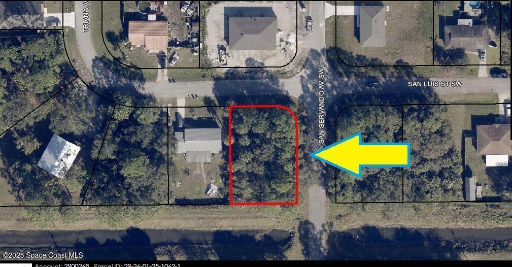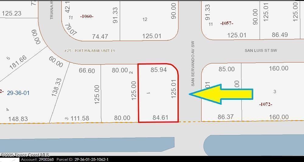 The 0.25 acre [Corner] buildable residential lot is available in Port Malabar Unit #19 of Palm Bay. Located in the southwest section, this lot has a drainage canal in the rear allowing more privacy, and is just 1.8 miles - 5 minutes to Jupiter Elementary School, 2 miles - 6 minutes to the Winn Dixie Supermarket, 11.2 miles - 23 minutes to Melbourne Airport, and 14.3 miles - 30 minutes to the beaches of Indialantic. From exit #176 of I-95 go west on Palm Bay Road for .7 miles, left on Minton Road for 3.3 miles, right on Jupiter Boulevard for .6 miles, right on Whitehall Avenue for .1 mile, road turns slightly left and becomes Trumpet Street, right o San Servando Avenue for .3 miles, and left on San Luis Street. Go to the corner lot next to 518 San Luis Street