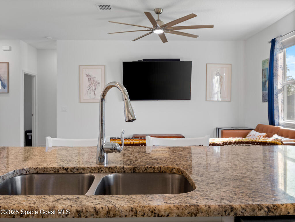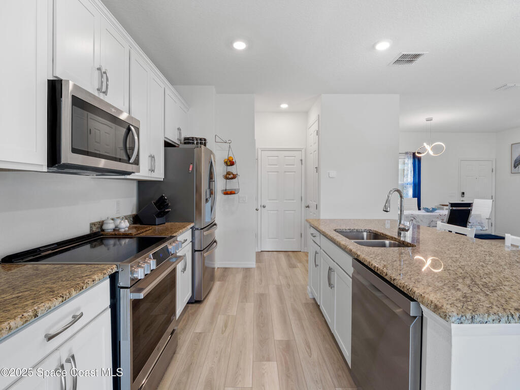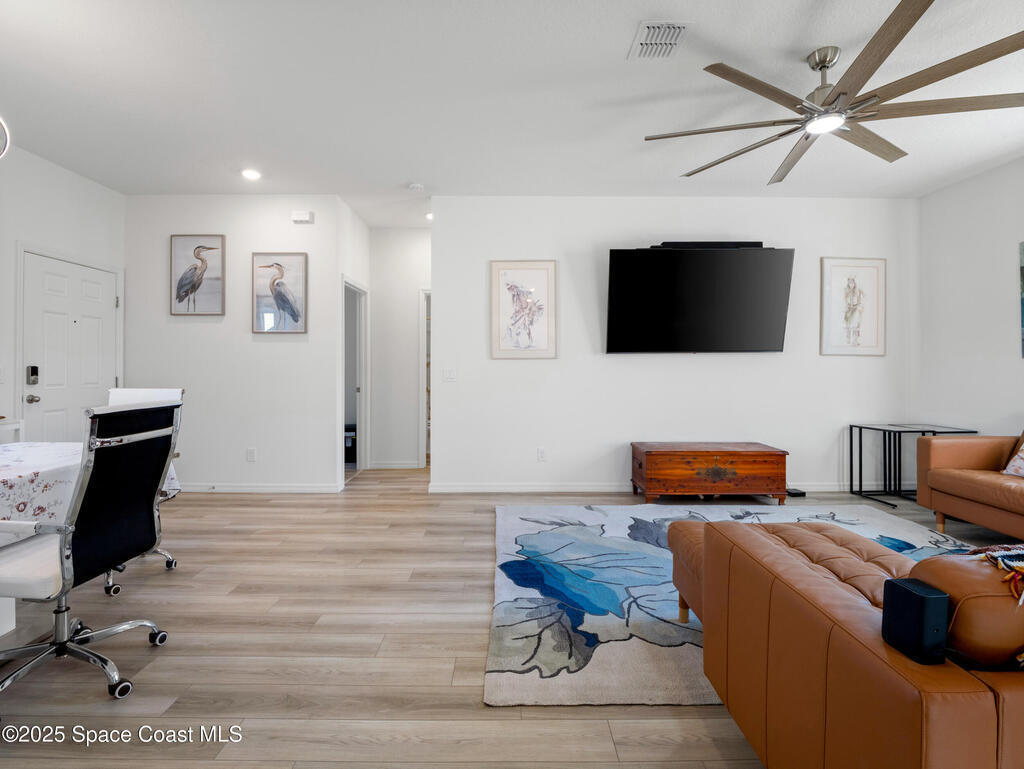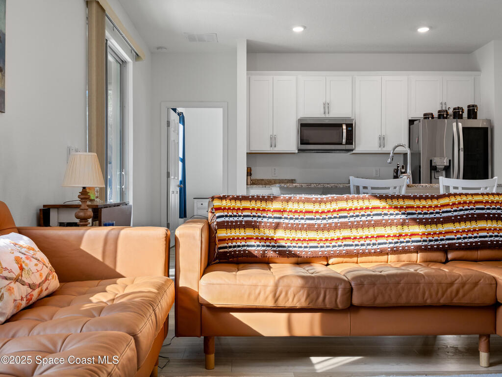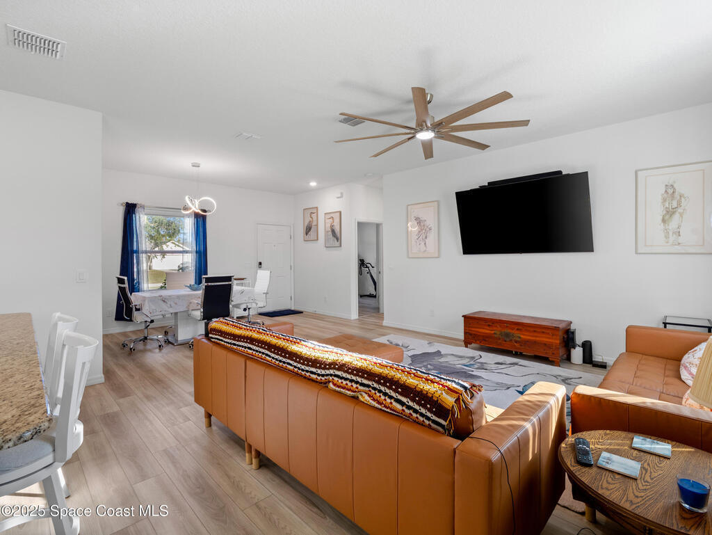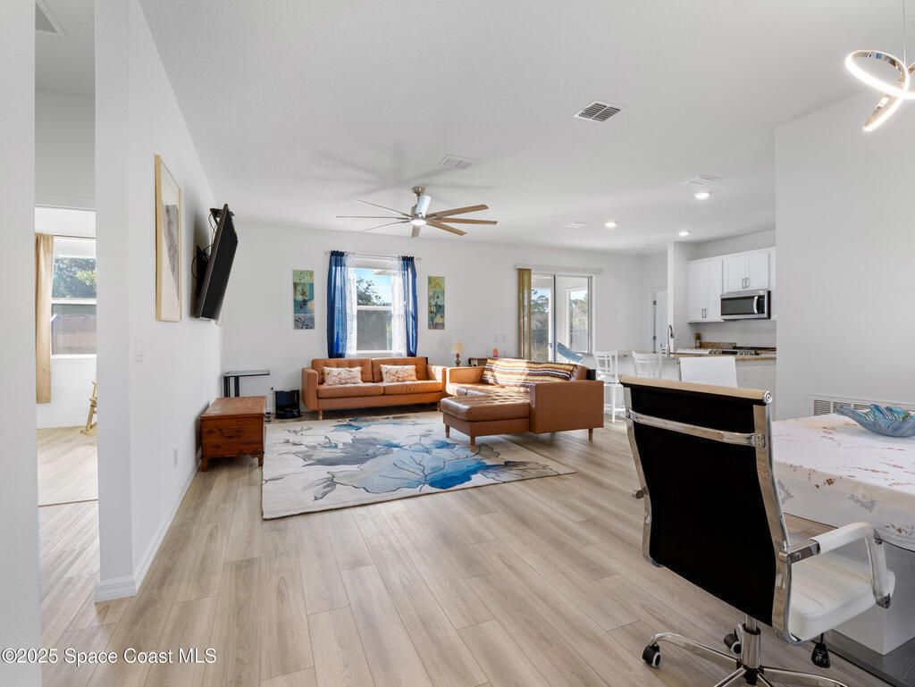 Step into modern comfort with this stunning Clearwater model home, completed in 2023 and situated on an expansive quarter-acre city water lot in the heart of Palm Bay. This residence perfectly blends style and functionality with an airy open-concept layout where the spacious great room flows seamlessly into a gourmet-inspired kitchen. At the center of the home, a large prep island serves as the perfect gathering spot, surrounded by sleek cabinetry and high-end Whirlpool appliances. The smart split-bedroom design ensures a peaceful retreat, highlighted by a private owner's suite with a generous walk-in closet and a spa-like bathroom. Crafted for longevity, the home features durable concrete block construction, energy-efficient Low-E windows, and storm shutters. Located in the desirable Port Malabar community, you will enjoy the freedom of no mandatory HOA fees while staying minutes away from the vibrant shopping and dining at Bayside Lakes. REACH OUT TODAY TO SCHEDULE A PRIVATE SHOWING