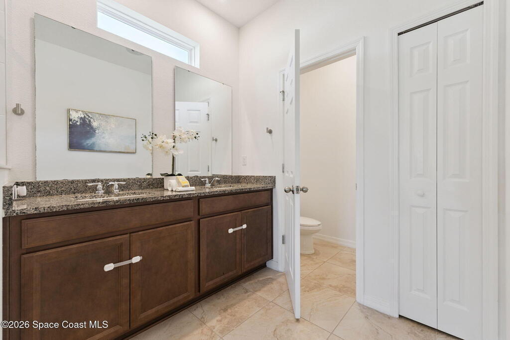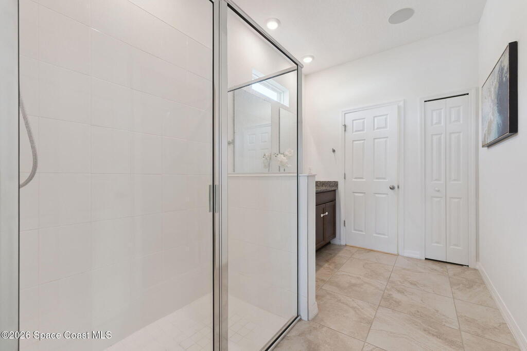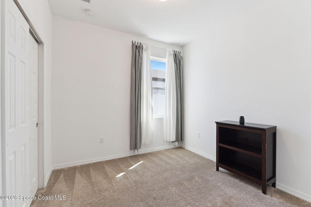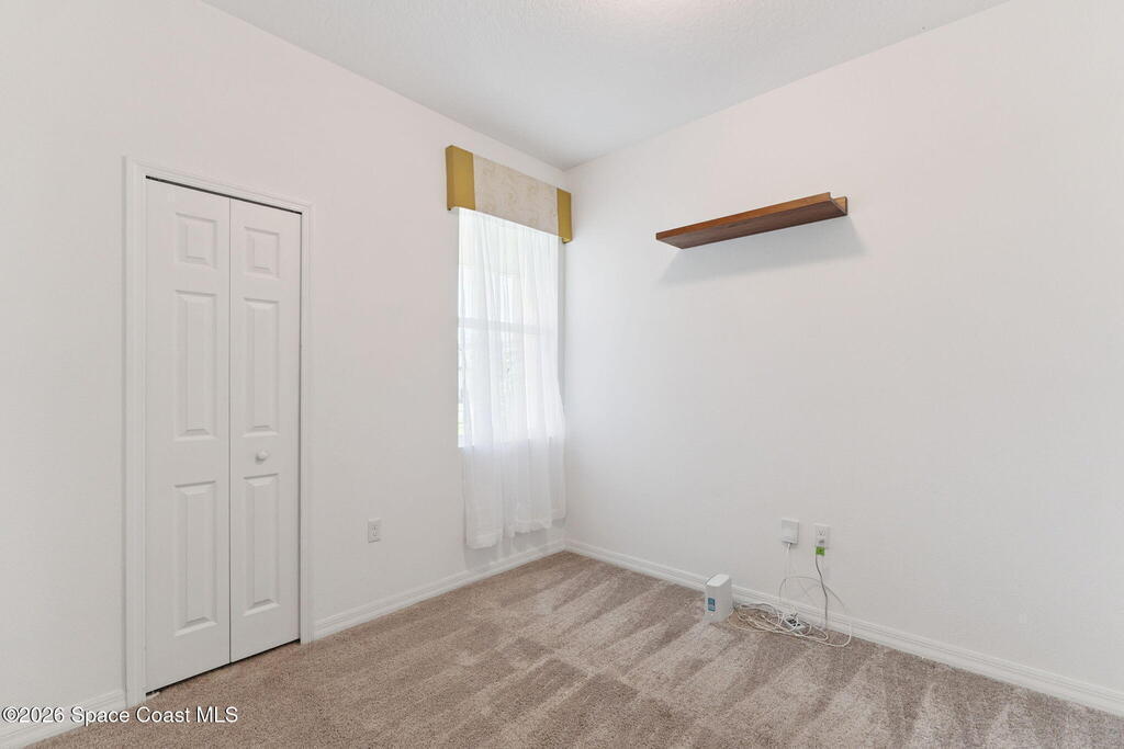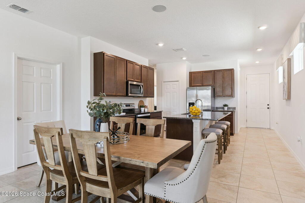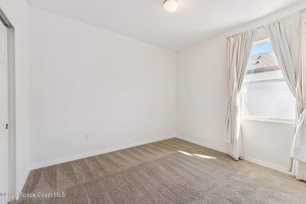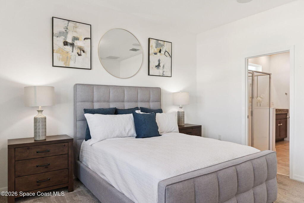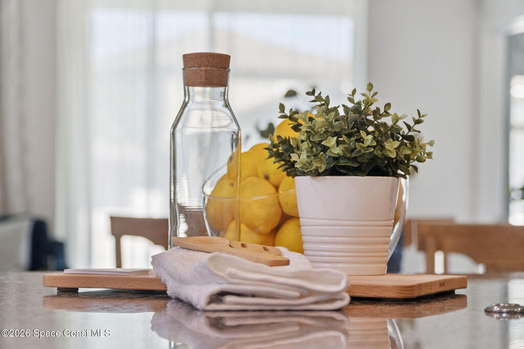 Welcome to 2824 Neverland Drive in New Smyrna Beach, a 4 bedroom smart home with lake views in a fast growing community less than 15 minutes from the beach. A bricked driveway and clean exterior lead to an open concept layout with tile floors in the main living areas and carpeted bedrooms. The kitchen features granite countertops, abundant cabinet space, and seamless flow into the dining and living areas, ideal for entertaining. A dedicated interior laundry room, not located in the garage, adds everyday convenience. Smart home features include remote access to the thermostat, garage, and sprinkler system, along with custom LED lighting and a HEOS multi room audio system throughout the home, patio, and primary suite. Natural light and lake sightlines enhance the living spaces, while the fully fenced backyard offers privacy and outdoor usability. The spacious primary suite includes lake views and a his and hers bathroom. Convenient to shopping, dining, entertainment, and major highways.