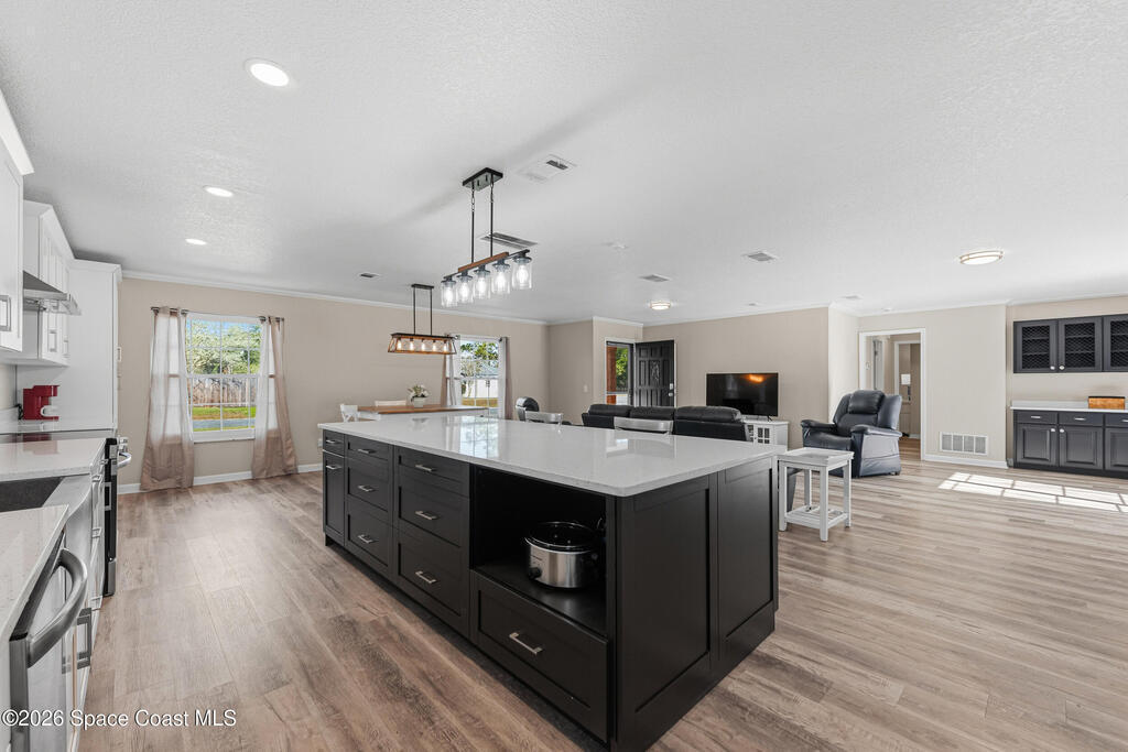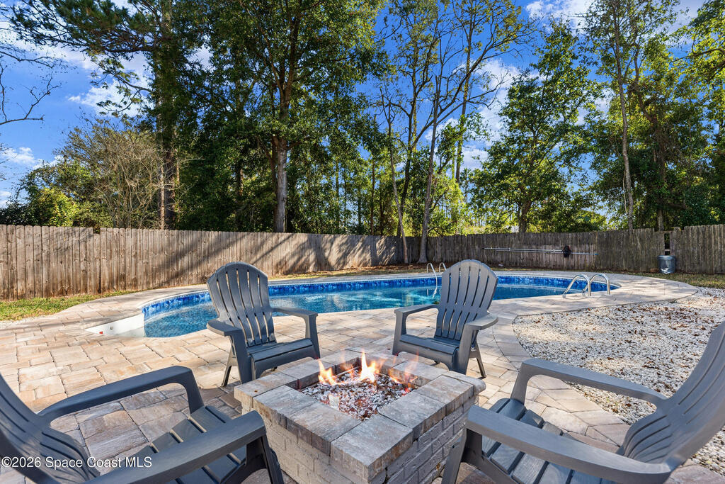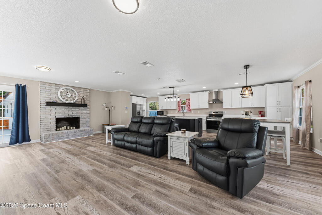 Beautifully renovated multi-generational brick home in the desirable Ridgecrest community. This spacious residence features an open floor plan with luxury vinyl plank flooring, updated lighting, knockdown ceilings, and a cozy wood-burning fireplace with built-in dry bar. The remodeled kitchen offers shaker-style cabinetry, quartz countertops, and a large island, perfect for entertaining. The flexible layout includes multiple living areas and a private guest or in-law suite with its own full bathroom and separate entrance. Additional updates include newer vinyl windows, a 2017 architectural shingle roof, and an upgraded air filtration system. Enjoy Florida living in the fully fenced backyard featuring an inground pool, paver deck, and brick outdoor bar with pergola--ideal for relaxing or entertaining. Conveniently located near shopping, dining, and major roadways, this well-maintained home offers space, comfort, and versatility.