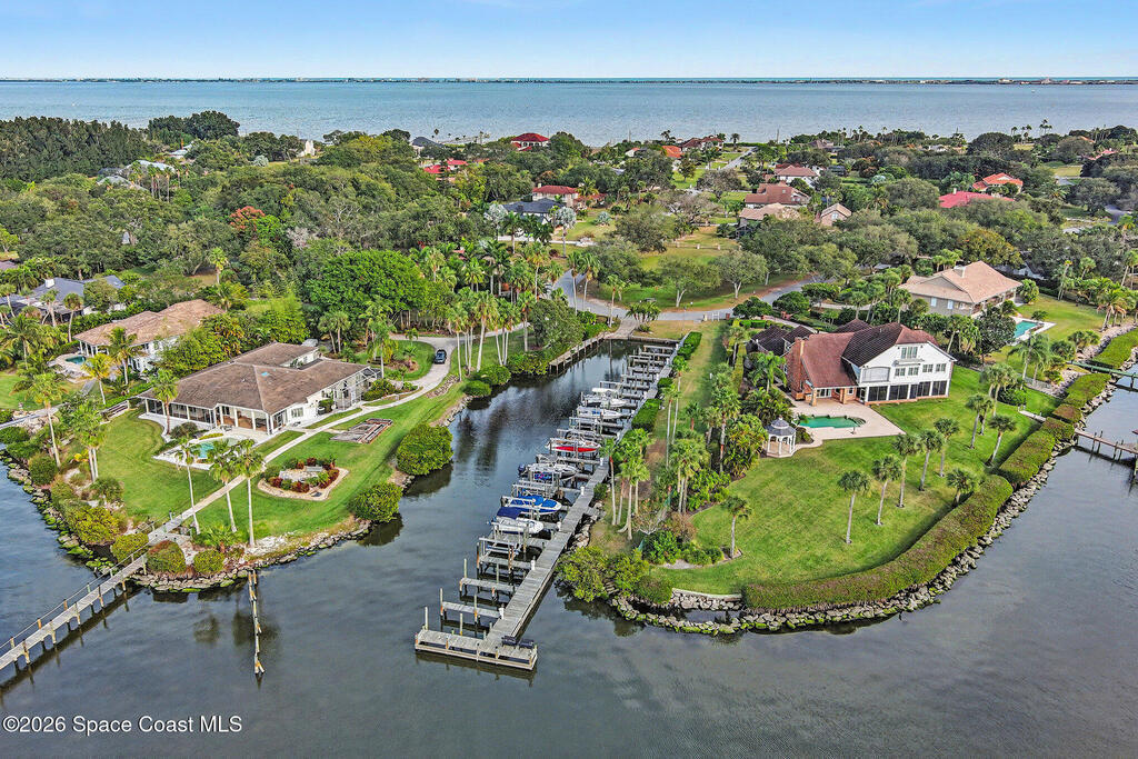 A rare blend of acreage, updates, garage space, and premier boating in Brevard County on 1-acre + a boat slip, nestled between the Banana and Indian rivers. This home has it all: 4b/4 full baths, circular driveway, pool, and an 864sf garage. Soaring 14 & 10 ft ceilings throughout, abundant natural light, and a statement fireplace. A new metal roof (2025), gutters, and solar attic fans are just the first of many upgrades. Wide-plank luxury vinyl flooring, updated kitchen and baths, and LED lighting in every room create a spacious entertainment showcase. Low-maintenance tropical landscaping and stunning 40-year-old oak trees create a private, shaded oasis in the front and back fenced yards. Enjoy a private screened pool, making entertaining a breeze. You'll love the spacious master suite, featuring a coastal vibe, an en-suite bath, a new double vanity, sconce lighting, and two huge walk-in closets. This home has exclusive use of slip #7 w/ a private 8k lift w/ direct access to the ICW.