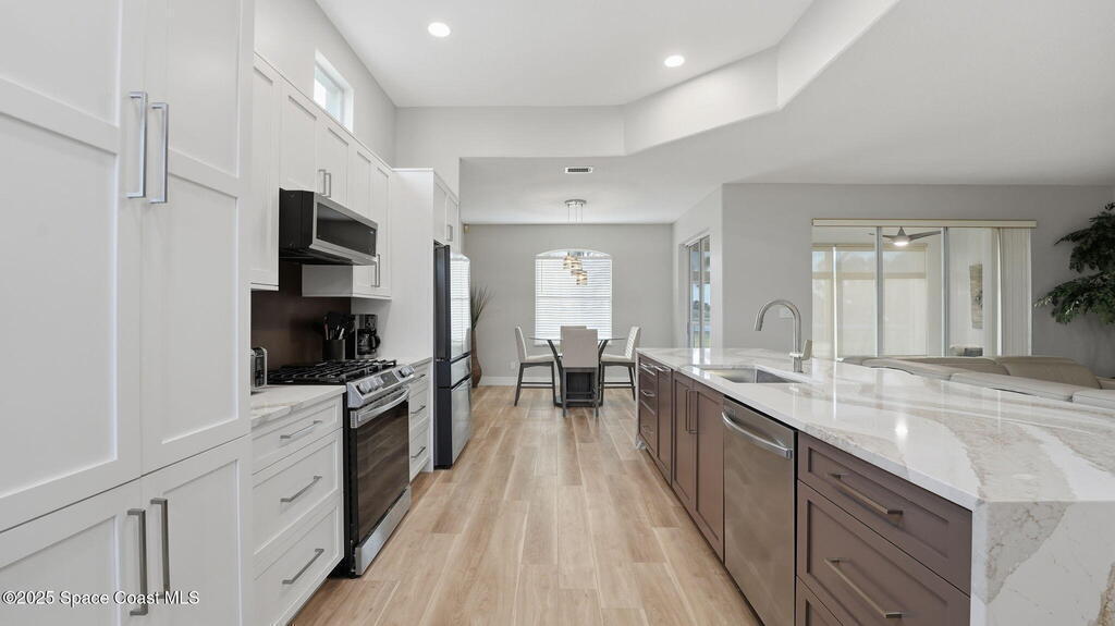 Experience exceptional golf-course living in this meticulously redesigned home positioned on the 18th tee, with sweeping views of the putting green and driving range just steps away. This complete remodel includes wall removal, bathrooms taken to the studs with all-new plumbing, and a spa-style primary bath featuring a barrier-free, wheelchair-friendly walk-in shower.The gourmet kitchen stands out with a 7-ft waterfall island equipped with electrical on one end, a gas range, and premium stainless steel appliances. Dual pantries provide impressive storage. Additional living spaces include a dining room and a versatile den perfect for an office or guest bedroom. The enclosed rear patio--fully finished and under air--adds valuable extra square footage. With new flooring, fresh paint, and high-quality updates throughout, this home blends modern luxury with an unbeatable golf lifestyle.