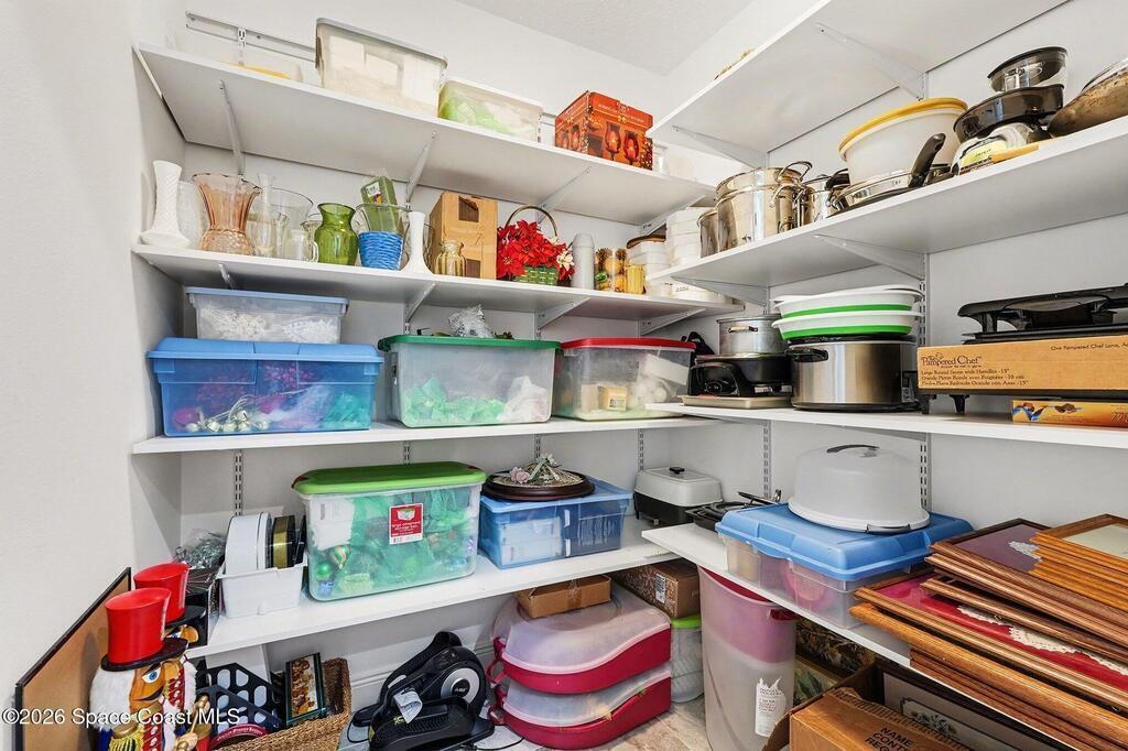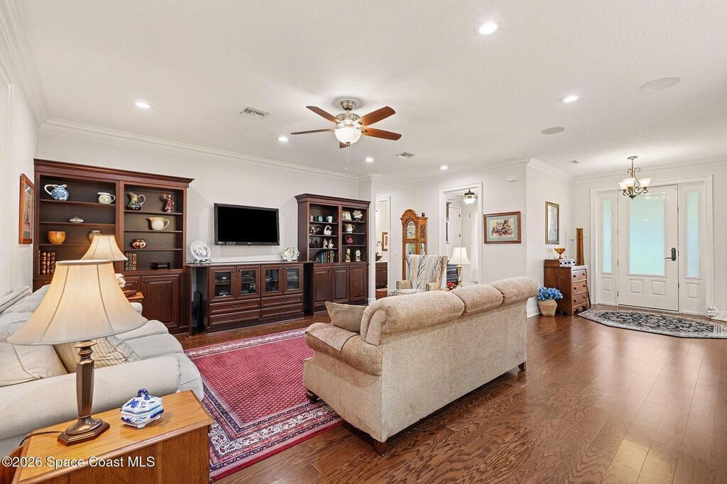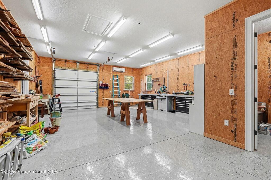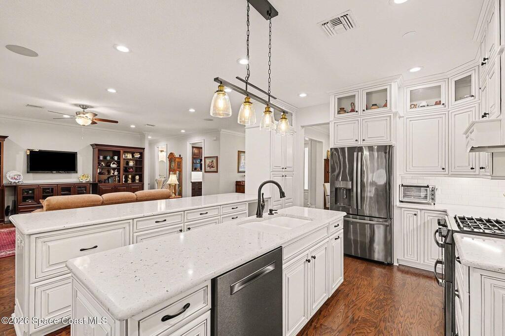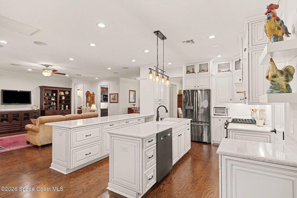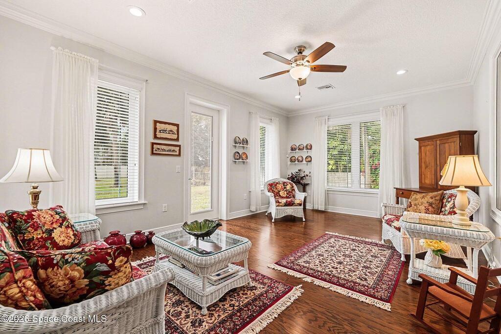 Custom-built in 2021, this beautifully designed 3-bedroom, 3.5-bath home sits on a private .78-acre lot in Titusville, Florida, near the Indian River and Space Coast amenities. The split floor plan features a metal roof, hurricane impact windows, and a whole-house natural gas Generac generator for seamless power. Open-concept living includes formal dining, great room, sunroom, breakfast bar, and nook with 9' ceilings and 8' doors throughout. The chef's kitchen offers quartz countertops, a large island, walk-in pantry, pull-out cabinetry, and a natural gas range with exterior-vented hood. The primary suite includes an attached office, dual walk-in closets, soaking tub, separate shower, and dual vanities. Additional features include a second office, large indoor laundry room, central vacuum, two HVAC systems. 2-car garage with epoxy floors. Detached climate-controlled workshop with impact windows, epoxy floors, carport, and pavered drive and walkways. Check out the video!