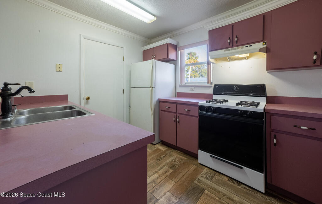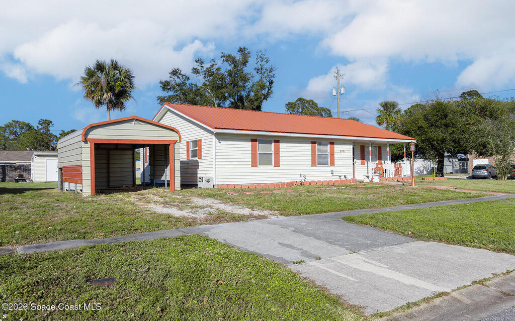 Welcome home to this charming 4-bedroom, 2-bath residence located in the heart of Titusville. Featuring an open-concept kitchen and dining area alongside the living room this bright layout is ideal for everyday living and entertaining. The kitchen is equipped with a gas range for efficient cooking and flows effortlessly into the spacious living room. Major updates include a 4-year-old metal roof, hurricane shutters, and a 6.5-year-old HVAC system, offering durability, comfort, and peace of mind. Warm wood flooring adds character and timeless appeal. Additional features include a metal 1-car carport, gas water heater, and gas dryer for added efficiency. The huge corner lot is perfect for games, gardening and watching rocket launches! Conveniently located near shopping, dining, and schools, this home combines comfort, functionality, and value. Full of potential this house is ready for new owners! Some photos digitally staged.