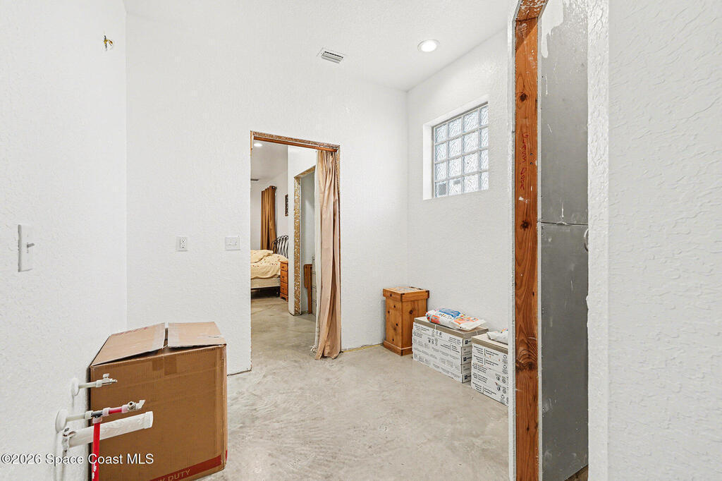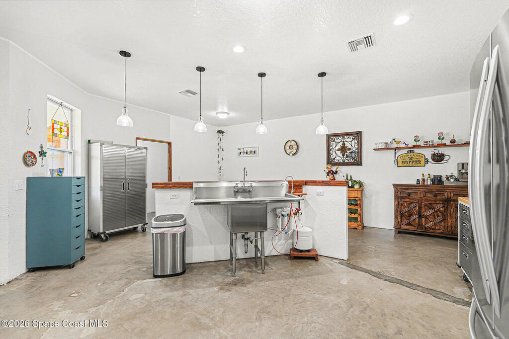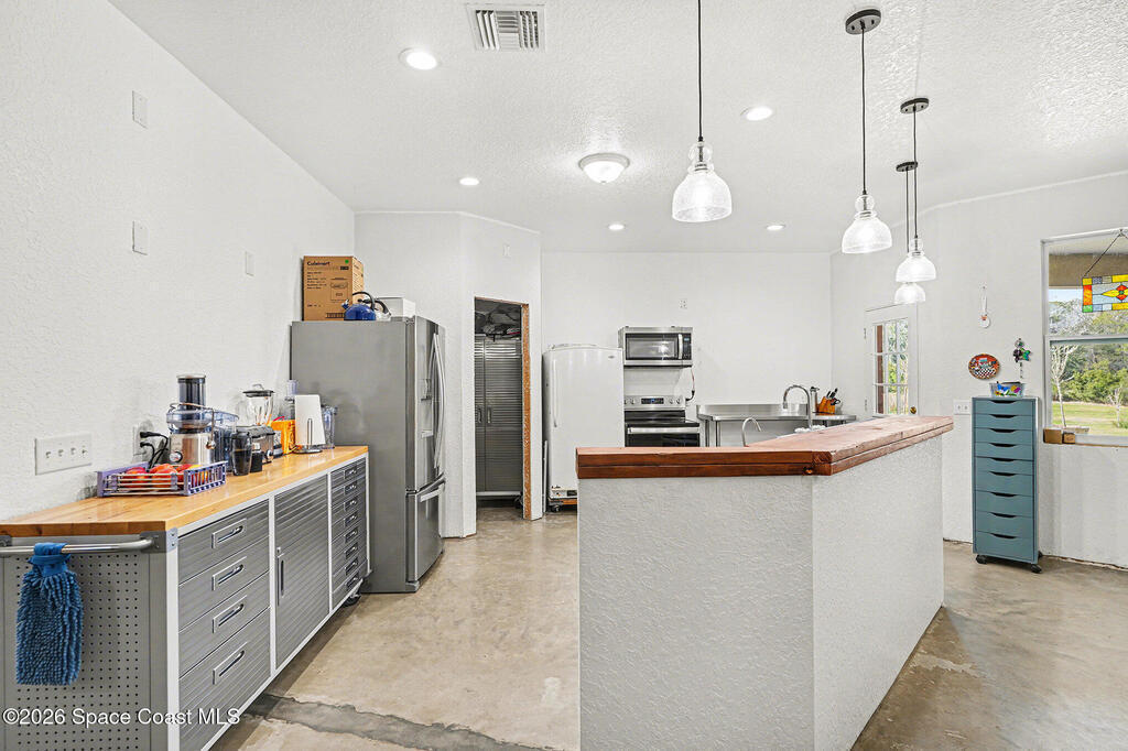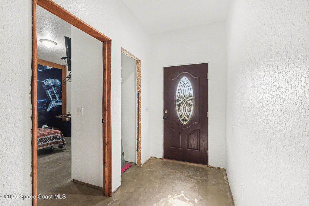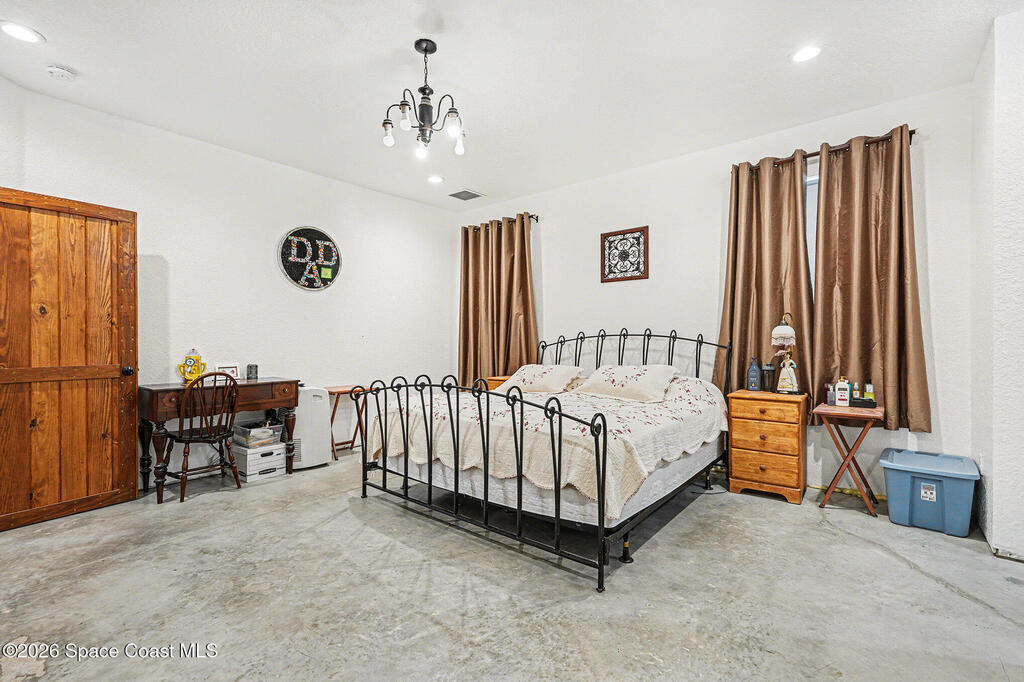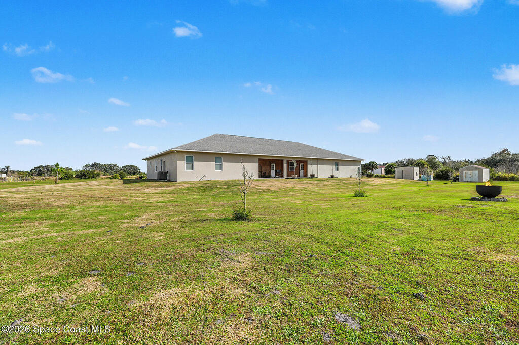 Space Coast living meets flexibility at 4960 Dixie Way, Mims, FL 32754. Built in 2019 and set on nearly 4 acres in Brevard County, this CBS concrete-block home was designed for multi-generational living, guests, or potential rental-style separation--two distinct living areas with private entrances, plus a center entry that connects both wings and the commercial-style garage. Rocket launches visible from the property. Pond with large mouthed bass.Approx. 6, 000 SF total (about 3, 825 SF under air + 1, 800 SF garage- fits 5+ cars w/ auto lift setup + 375 SF porch) with 9'4'' ceilings, concrete floors ready to polish or finish, abundant closet storage and a large patio already plumbed for an outdoor kitchen. The south wing features a family room, 3 bedrooms, 2 baths, an office/guest room, and a spacious kitchen/dining area. The north wing offers a family room with wet-bar connection, 1 bedroom, 1 bath, a bonus room, and its own kitchen/dining. Home has (8) 240v outlets and 4 clean outs.