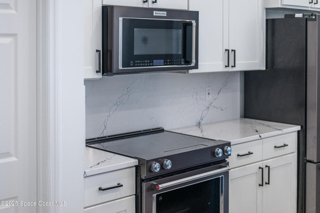 Experience the epitome of quiet, coastal living in this stunning 4-bedroom, 2-bathroom sanctuary, located 800 feet from pristine Melbourne Beach! This home offers the luxury you've been searching for, featuring soaring cathedral ceilings and a cozy wood-burning fireplace. The heart of the home is a masterfully remodeled gourmet kitchen, featuring a KitchenAid stainless steel appliance package, elegant veined quartz countertops with a dramatic waterfall edge and a large farmhouse sink. You'll also find a unique, pantry designed for maximum storage. The interior layout is perfectly designed for modern needs, featuring a formal dining room and a separate office or play area. The Master Suite is a true retreat with shiplap accents and a large walk-in closet. The ensuite bath features a luxury freestanding tub and an incredible multi-head massage shower system. Outside, enjoy a heated, caged pool with a with a jetted tub and a covered dining area. This home truly has it all!