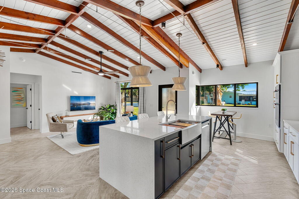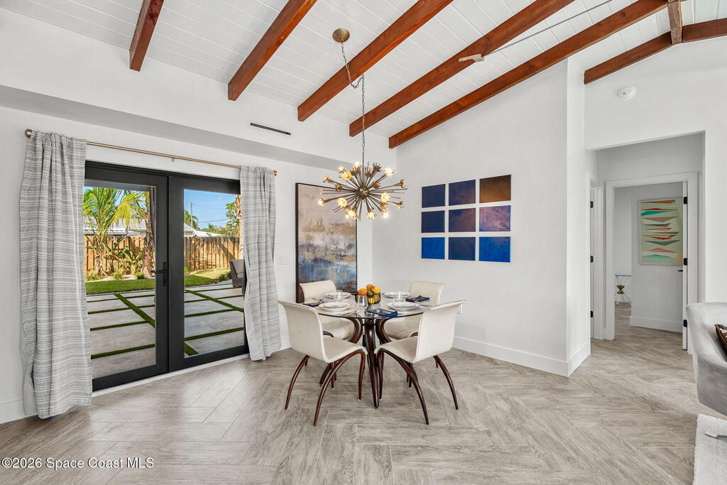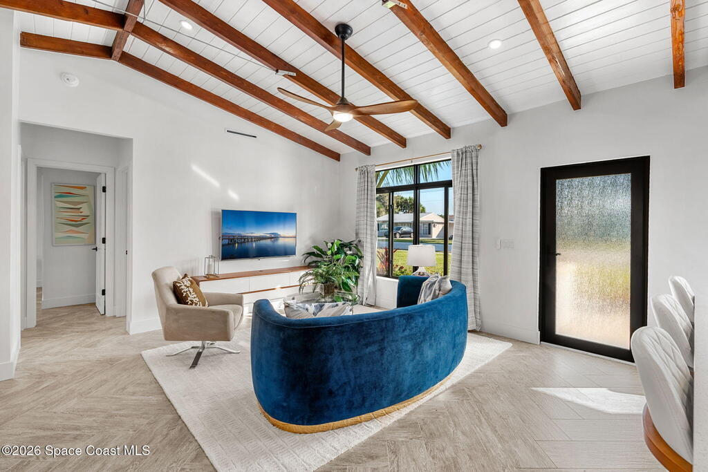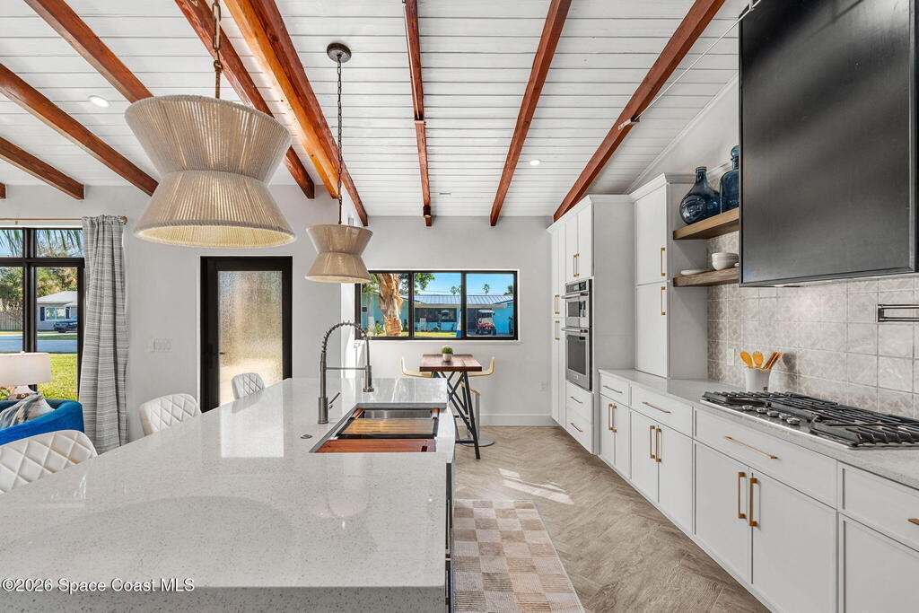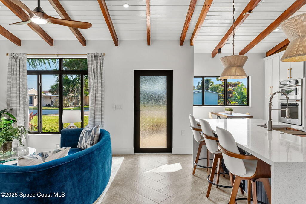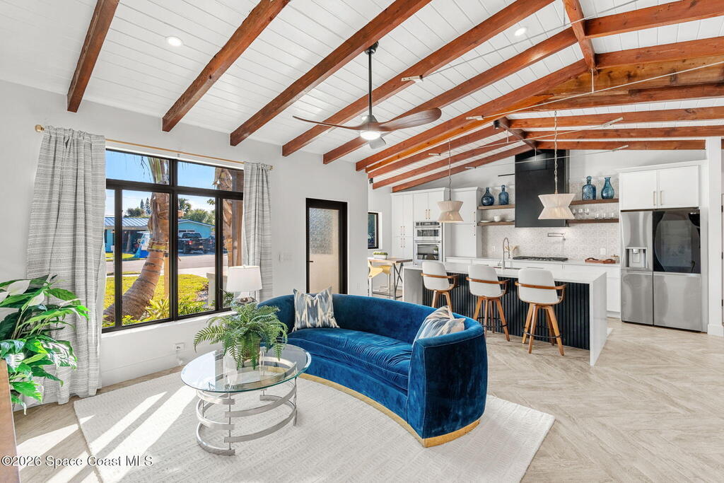 Craftsmanship refined--better than new construction. This stunning beachside renovation offers standout curb appeal with a covered entry featuring open-beam ceilings, rich woodwork, coral rock accents, and rain-glass French doors. Inside, a redesigned floor plan showcases luxury finishes and no-expense-spared workmanship. Vaulted T&G ceilings with timber rafters, architectural accents, and recessed LED lighting create a bright, elegant interior. Energy efficiency is enhanced with up to 6'' ISO foam board insulation (R-39). The chef's kitchen features an LP gas 36'' cooktop, large eat-at island, waterfall quartz counters, and breakfast nook. Living and dining areas open through impact French doors to a tropical outdoor entertaining space with room for a future pool. The primary suite includes volume ceilings, seating area, and spa-style bath. Updates include new plumbing, wiring, panel, metal standing-seam roof, impact windows/doors, irrigation, and landscaping.