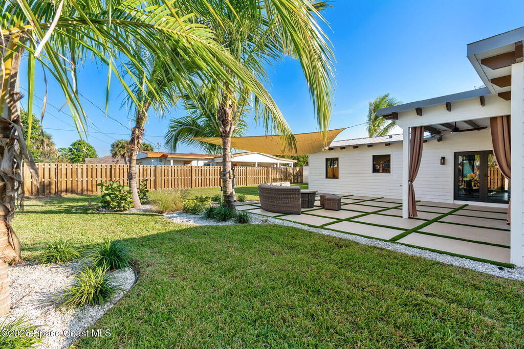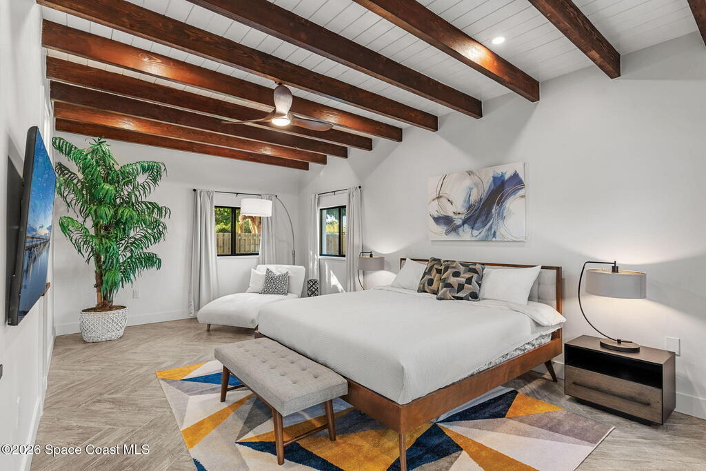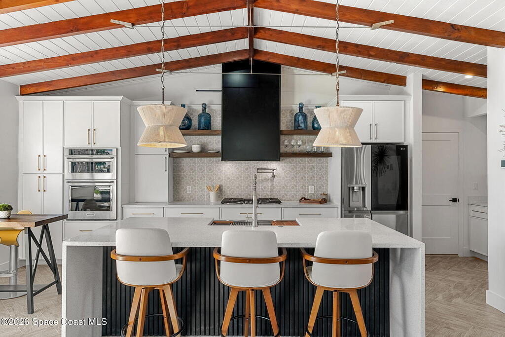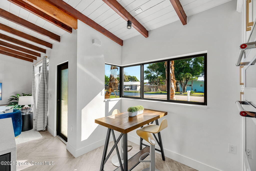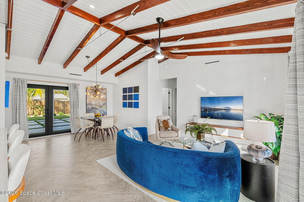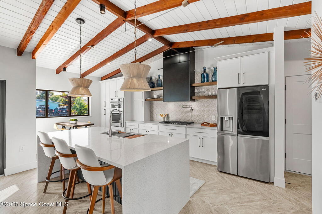 Craftsmanship refined--better than new construction. This stunning beachside renovation offers standout curb appeal with a covered entry featuring open-beam ceilings, rich woodwork, coral rock accents, and rain-glass French doors. Inside, a redesigned floor plan showcases luxury finishes and no-expense-spared workmanship. Vaulted T&G ceilings with timber rafters, architectural accents, and recessed LED lighting create a bright, elegant interior. Energy efficiency is enhanced with up to 6'' ISO foam board insulation (R-39). The chef's kitchen features an LP gas 36'' cooktop, large eat-at island, waterfall quartz counters, and breakfast nook. Living and dining areas open through impact French doors to a tropical outdoor entertaining space with room for a future pool. The primary suite includes volume ceilings, seating area, and spa-style bath. Updates include new plumbing, wiring, panel, metal standing-seam roof, impact windows/doors, irrigation, and landscaping.