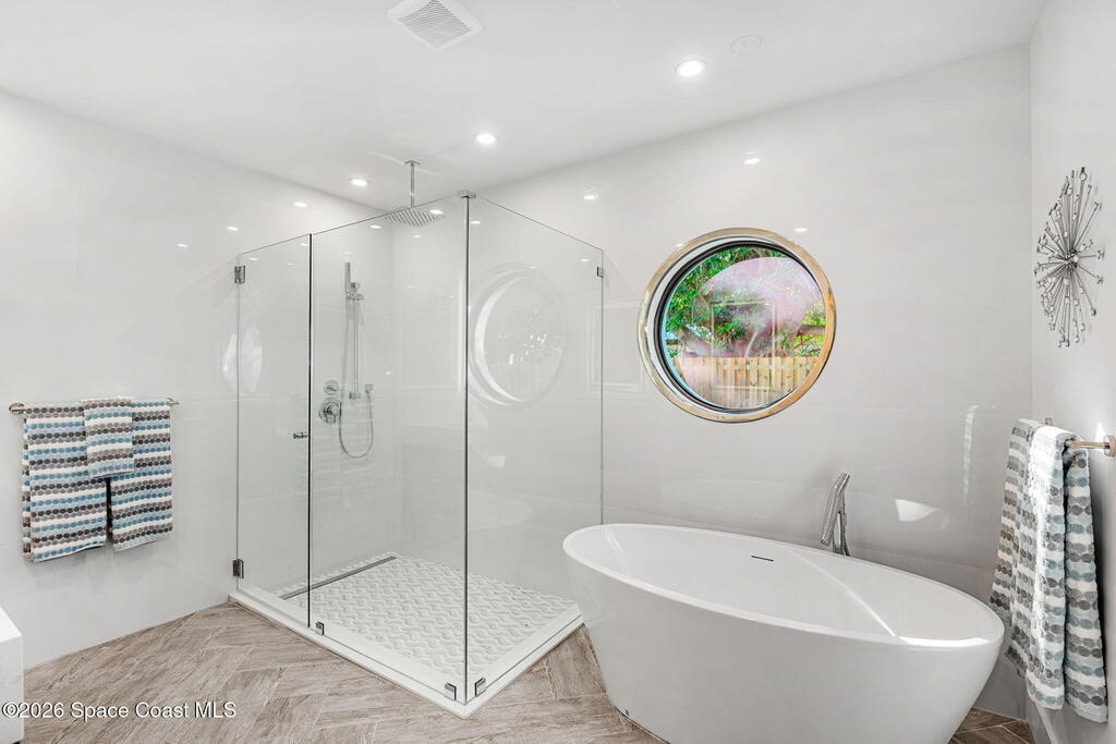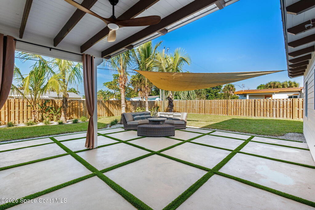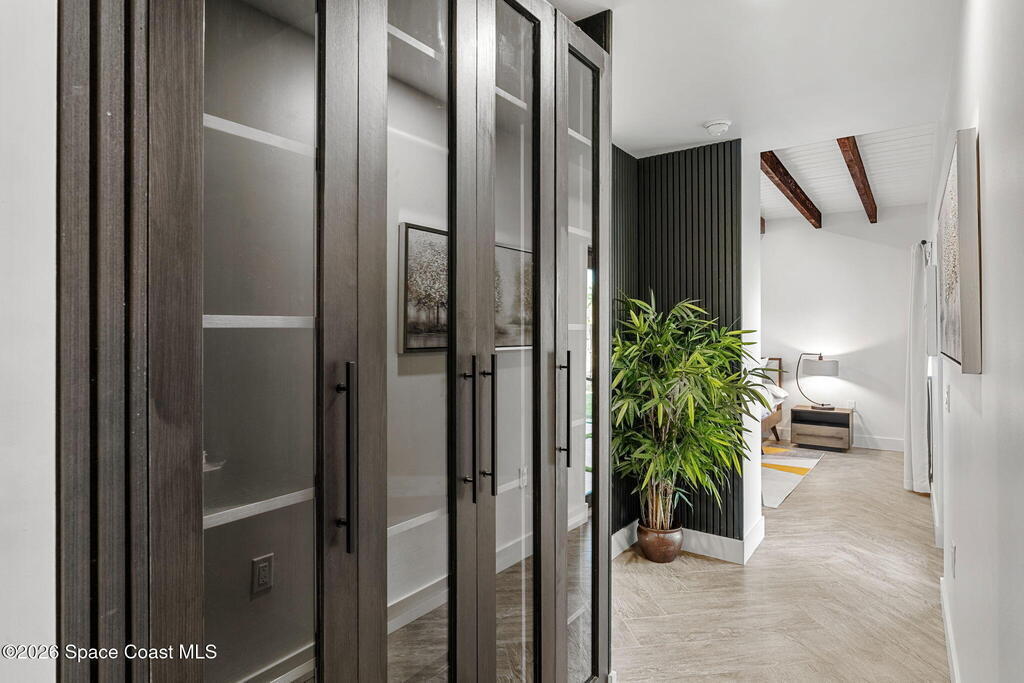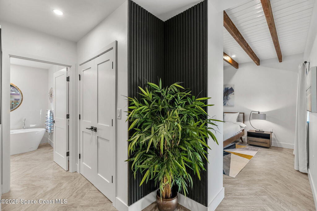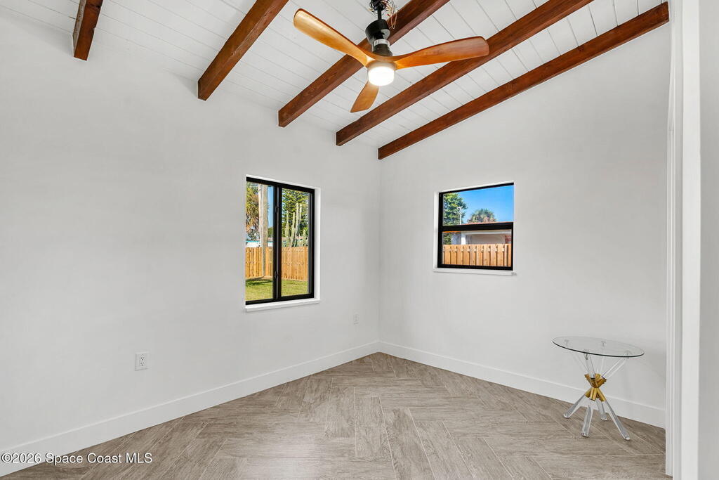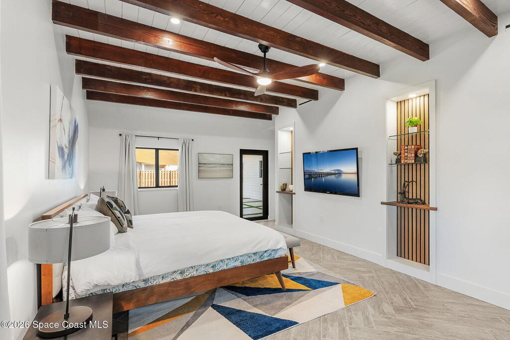 Craftsmanship refined--better than new construction. This stunning beachside renovation offers standout curb appeal with a covered entry featuring open-beam ceilings, rich woodwork, coral rock accents, and rain-glass French doors. Inside, a redesigned floor plan showcases luxury finishes and no-expense-spared workmanship. Vaulted T&G ceilings with timber rafters, architectural accents, and recessed LED lighting create a bright, elegant interior. Energy efficiency is enhanced with up to 6'' ISO foam board insulation (R-39). The chef's kitchen features an LP gas 36'' cooktop, large eat-at island, waterfall quartz counters, and breakfast nook. Living and dining areas open through impact French doors to a tropical outdoor entertaining space with room for a future pool. The primary suite includes volume ceilings, seating area, and spa-style bath. Updates include new plumbing, wiring, panel, metal standing-seam roof, impact windows/doors, irrigation, and landscaping.